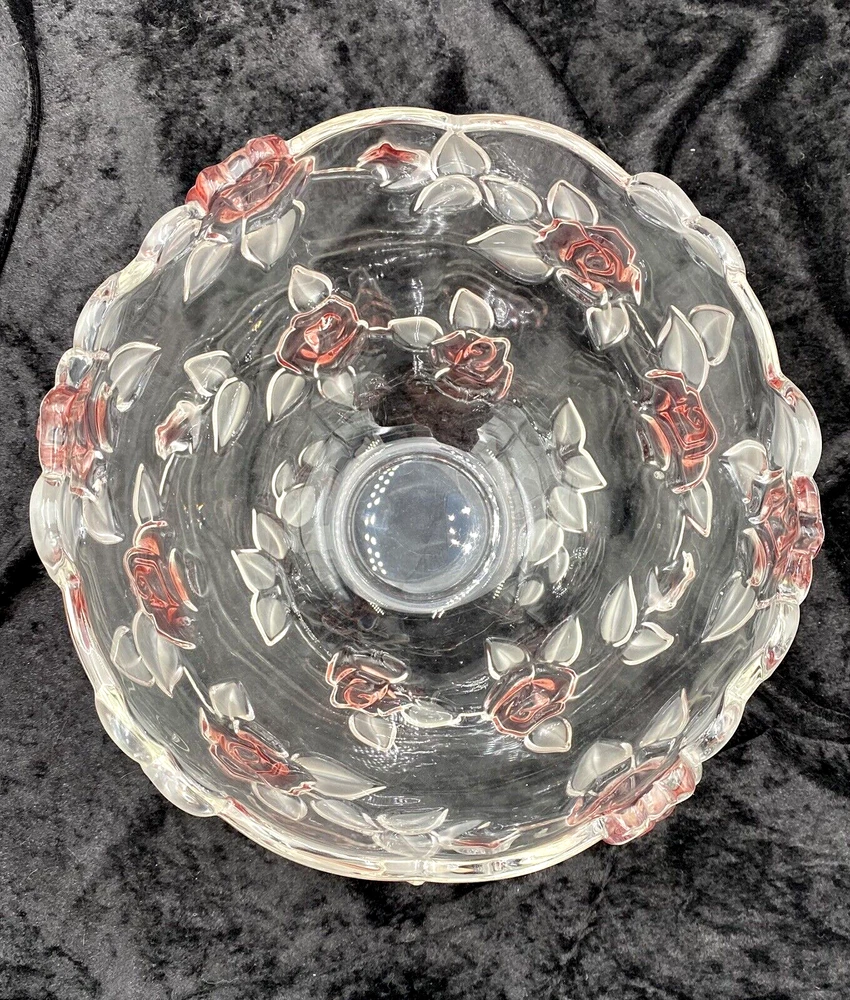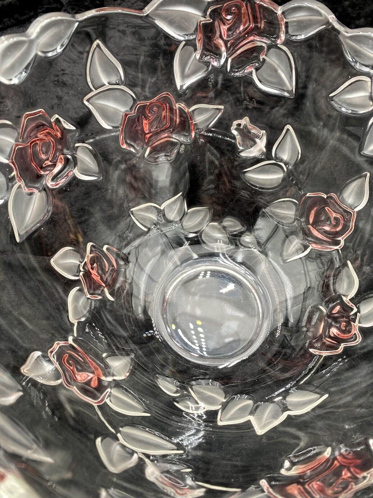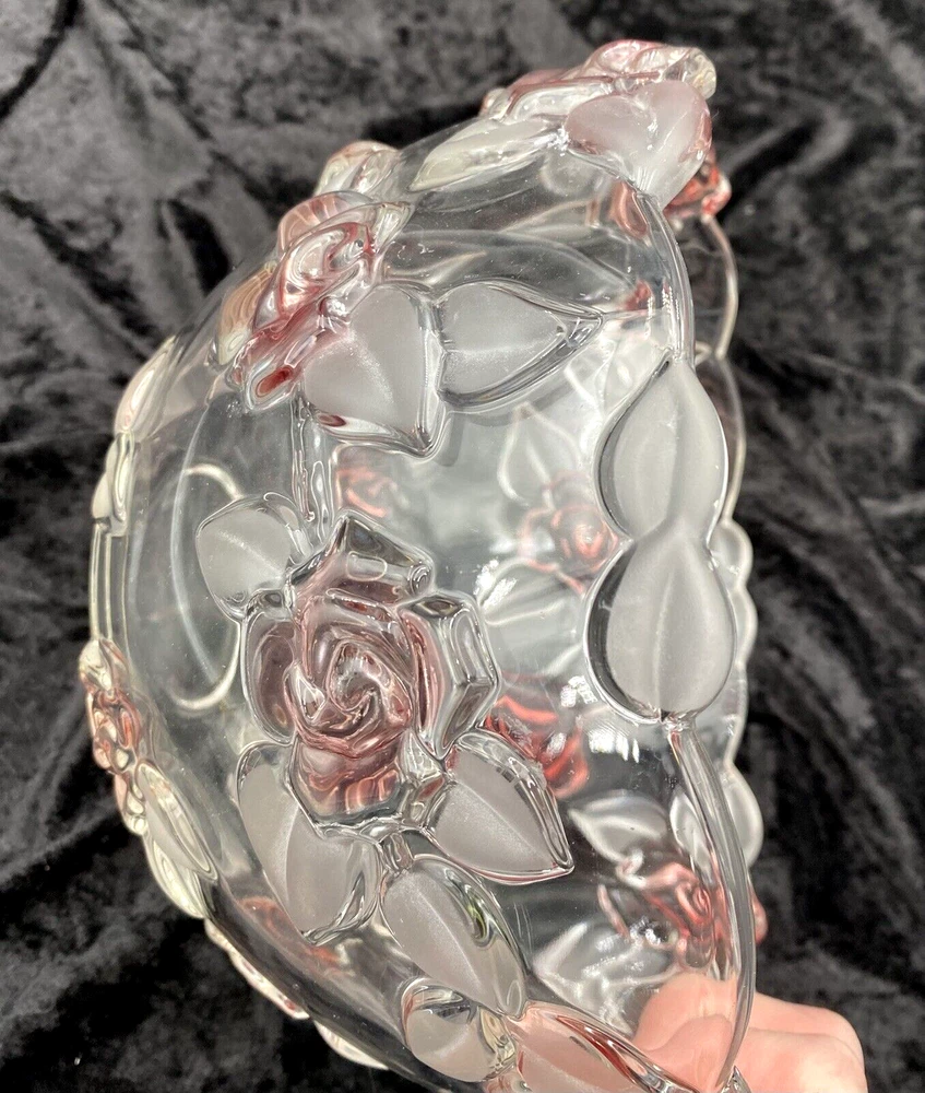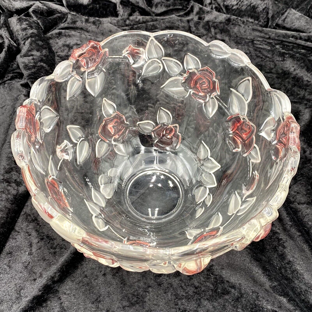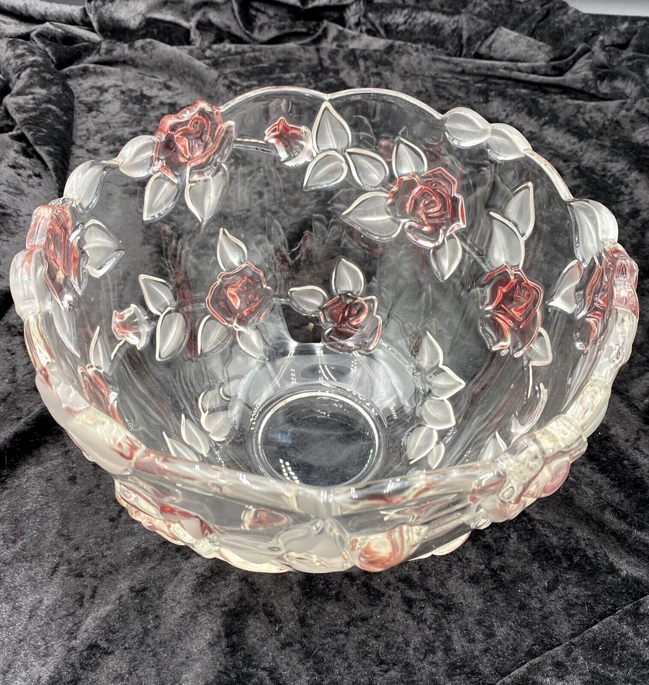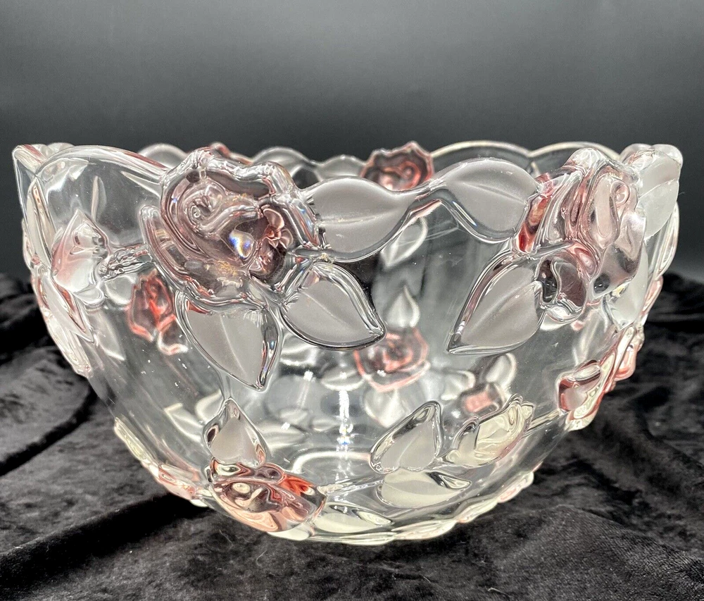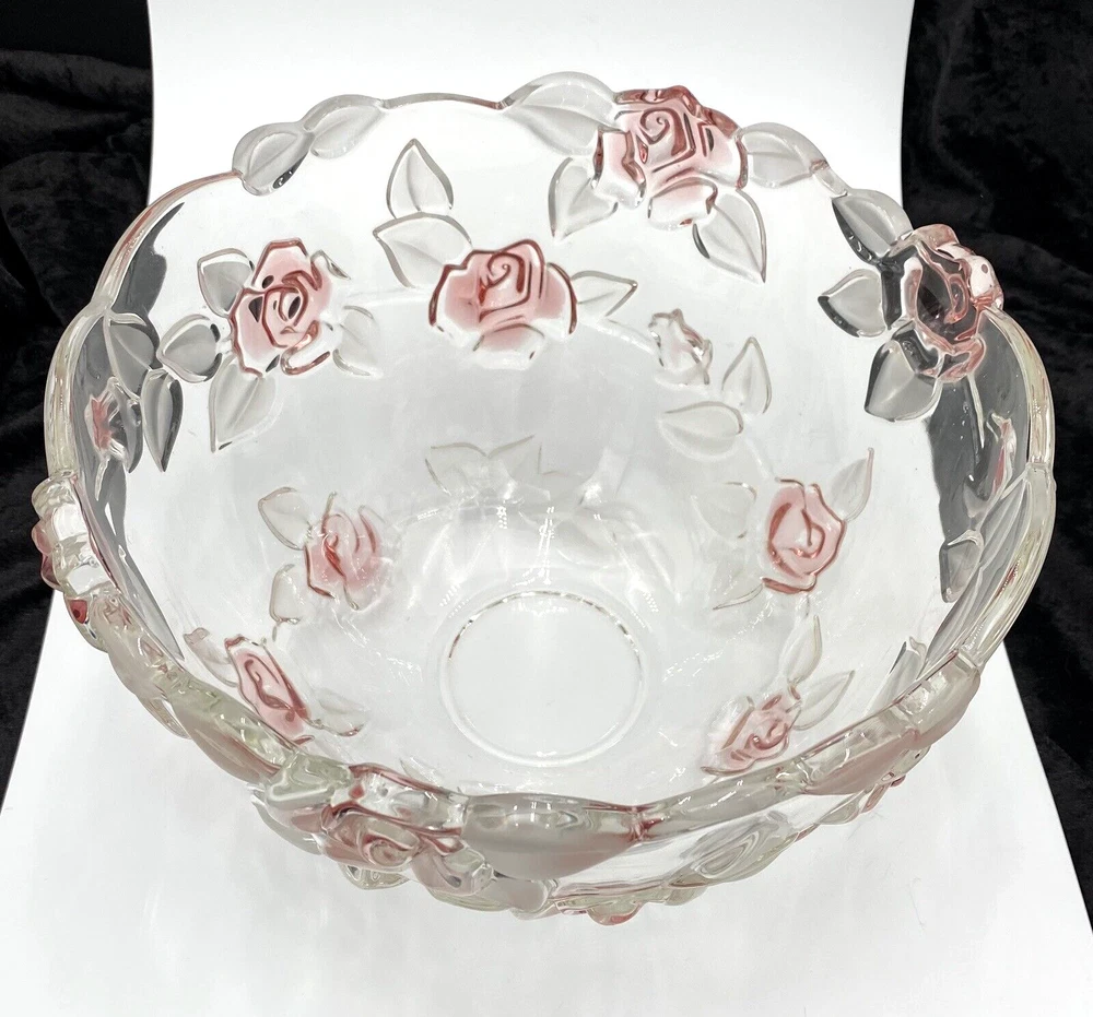 Crafted with a delicate touch, the Mikasa Bella Rosa Pink Frosted Glass Bowl is a stunning addition to any table or display. Originating from Germany, this exquisite piece features both a glossy and frosted finish with an embossed roses pattern, exuding a timeless elegance that's sure to catch the eye. Measuring at 9 inches in diameter with a scalloped rim, the bowl stands at 5.5 inches tall, perfectly sized for a variety of uses. Whether it's for special occasions or everyday beauty, this crystal glass bowl, produced in 2004, brings the charm of vintage design to your home. (The pattern was made from 2003-2006.) The bowl is in excellent condition. There are no chips, cracks or signs of wear. The pink color is beautiful!