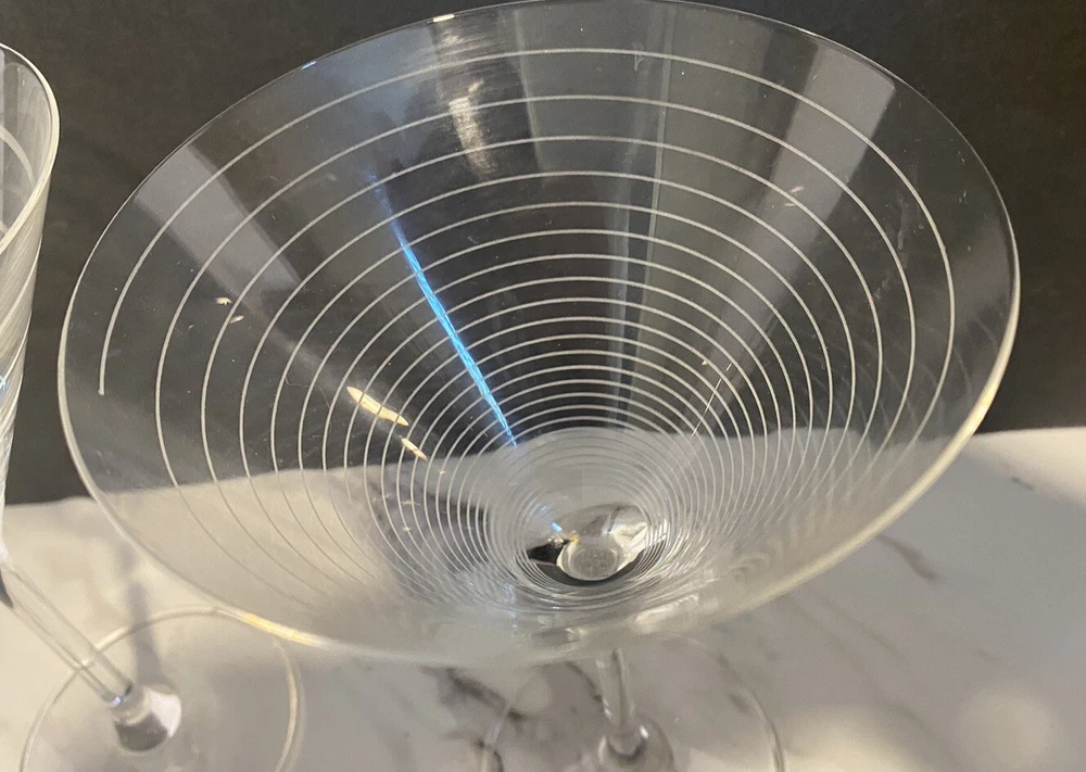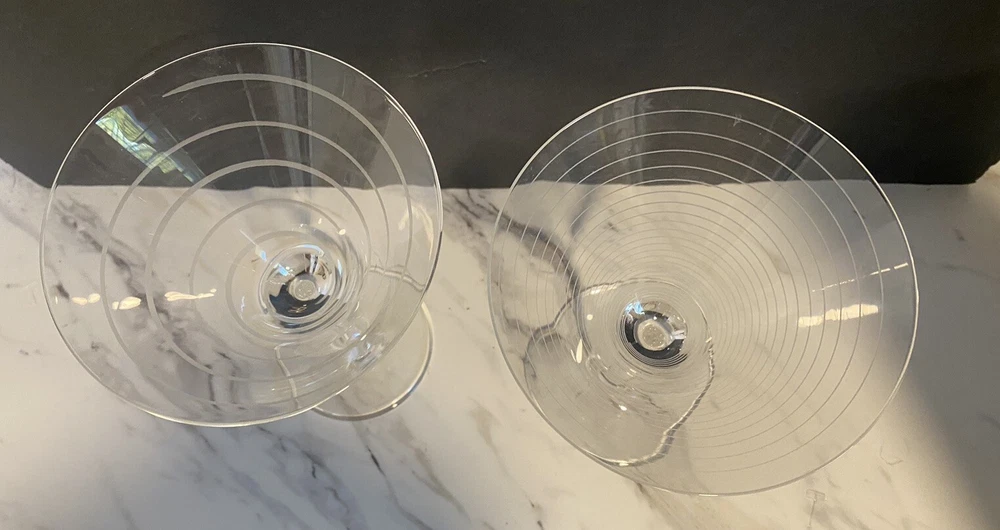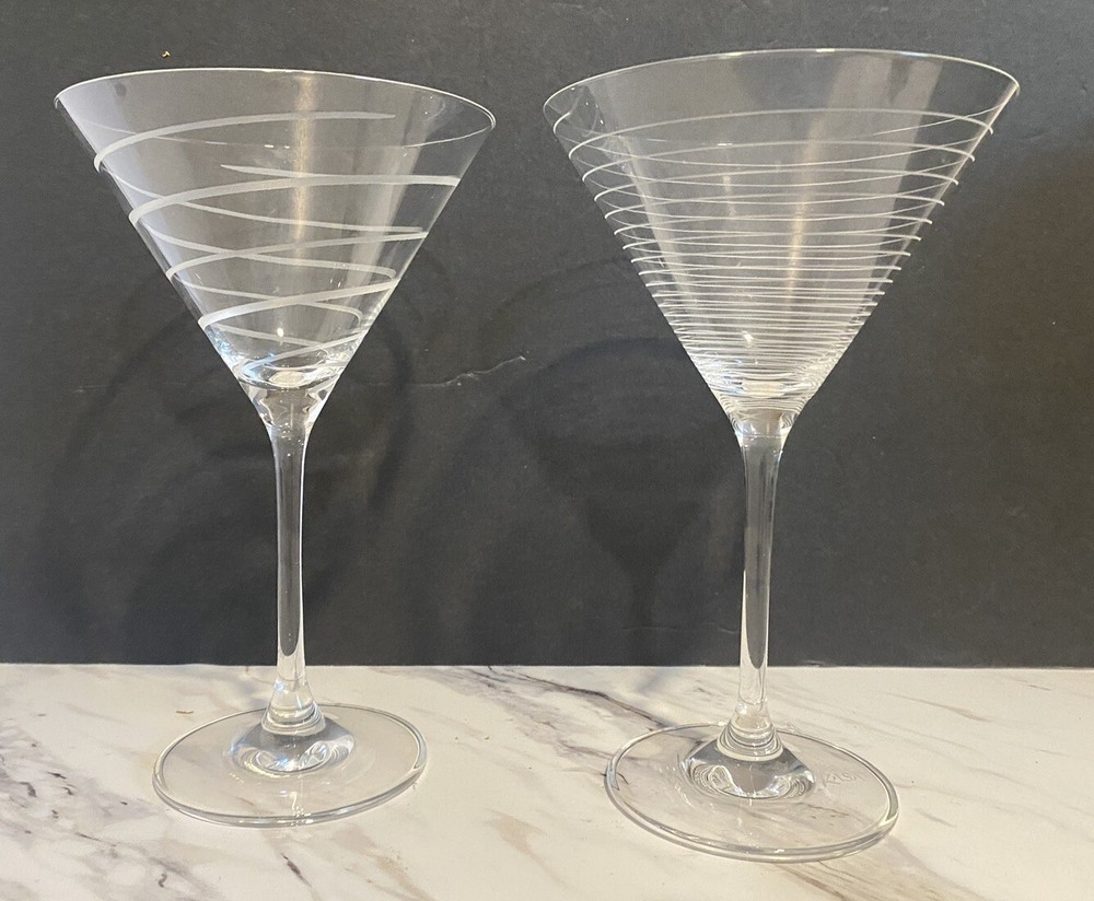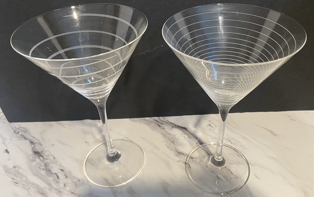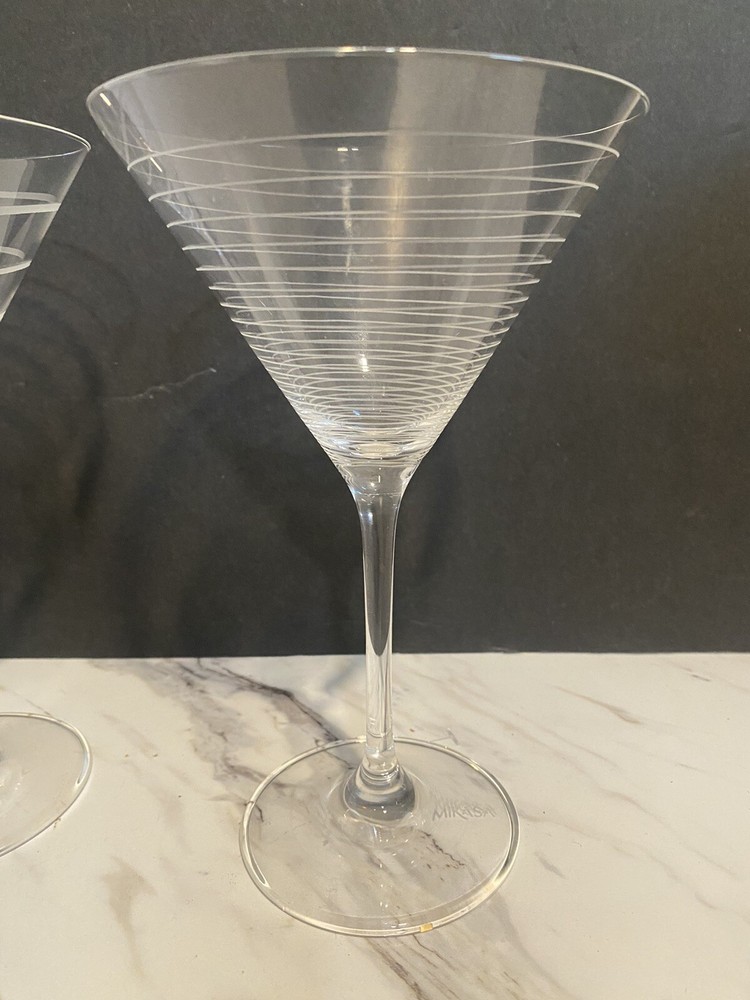 2 Vintage Mikasa Cheers Martini Cocktail Glasses Etched Crystal Swirl & Lines Pre-Owned in very good condition. No chips or breaks. See all photos for best representation. Thank you for looking and supporting my small business!