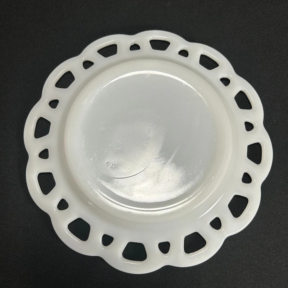 This vintage milk glass lace plate is a beautiful addition to any collection. The round plate measures 8.25 inches in diameter and features a delicate white color with a unique pattern. Made in the United States, this original piece is stackable and decorative, perfect for adding a touch of colonial style to any dining table. The plate is unmarked, but its quality and authenticity are undeniable. Whether you are a collector or simply looking for a unique piece of decorative cookware, this vintage milk glass plate is sure to impress.