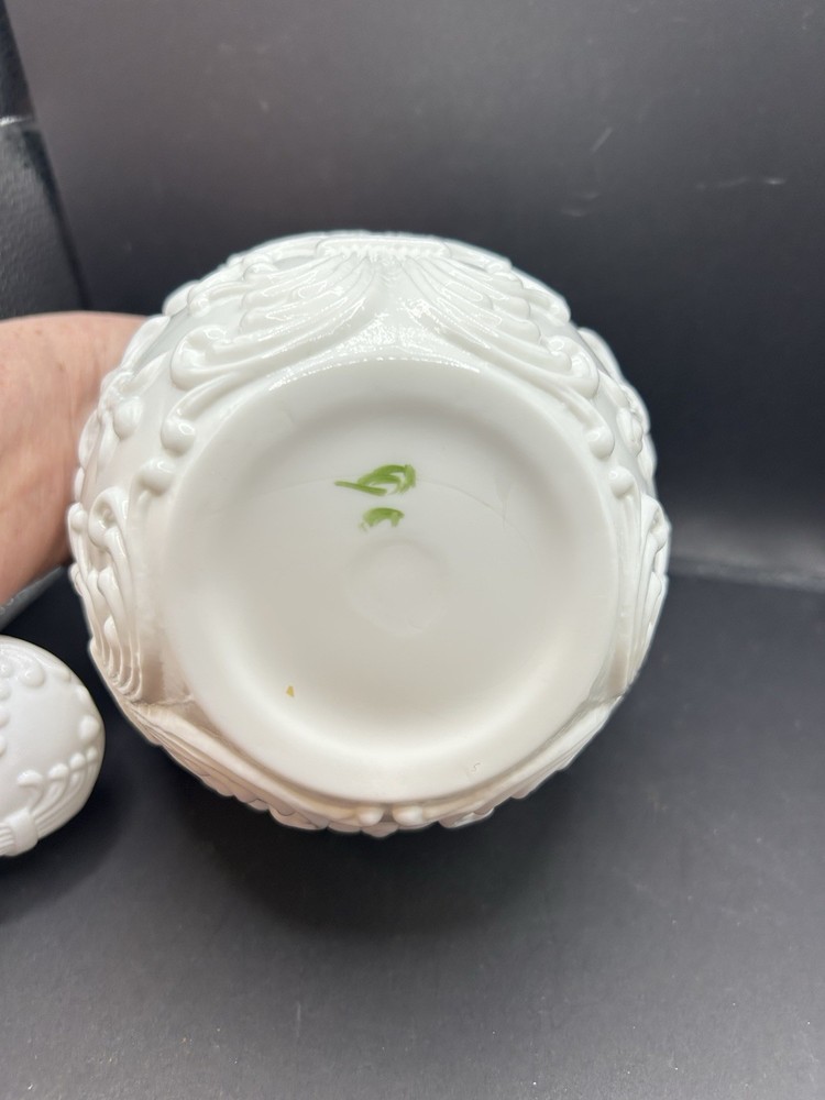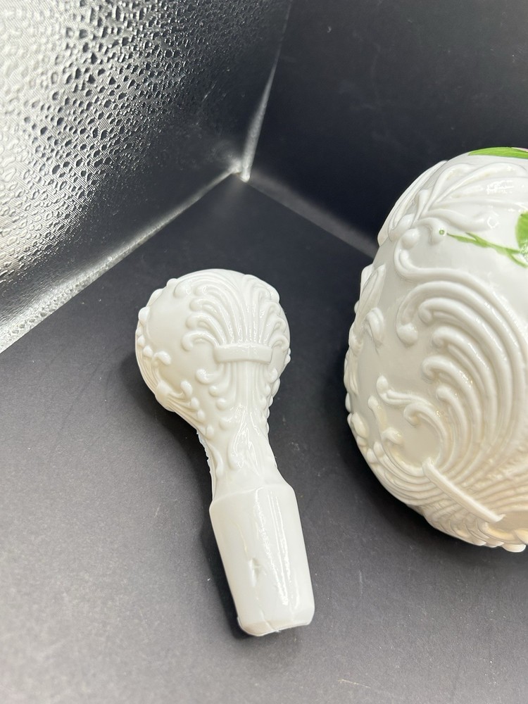 This vintage milk glass decanter is a stunning piece with intricate handpainted pink roses, embodying the Victorian style. Made in the United States, this original decanter features a stopper and stands out with its white color and delicate design. Perfect for collectors or those looking to add a touch of elegance to their home decor.