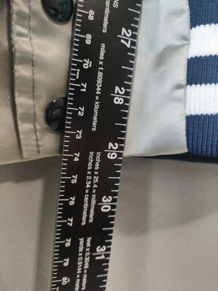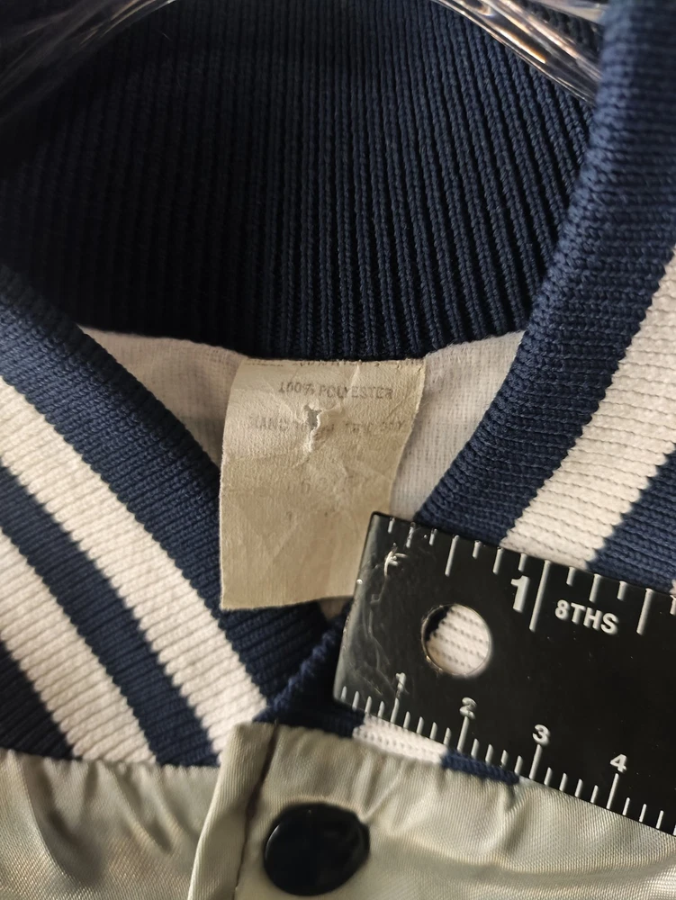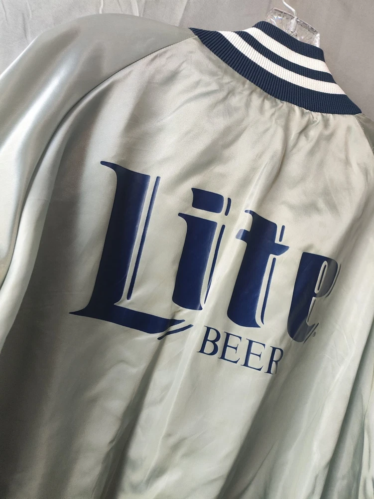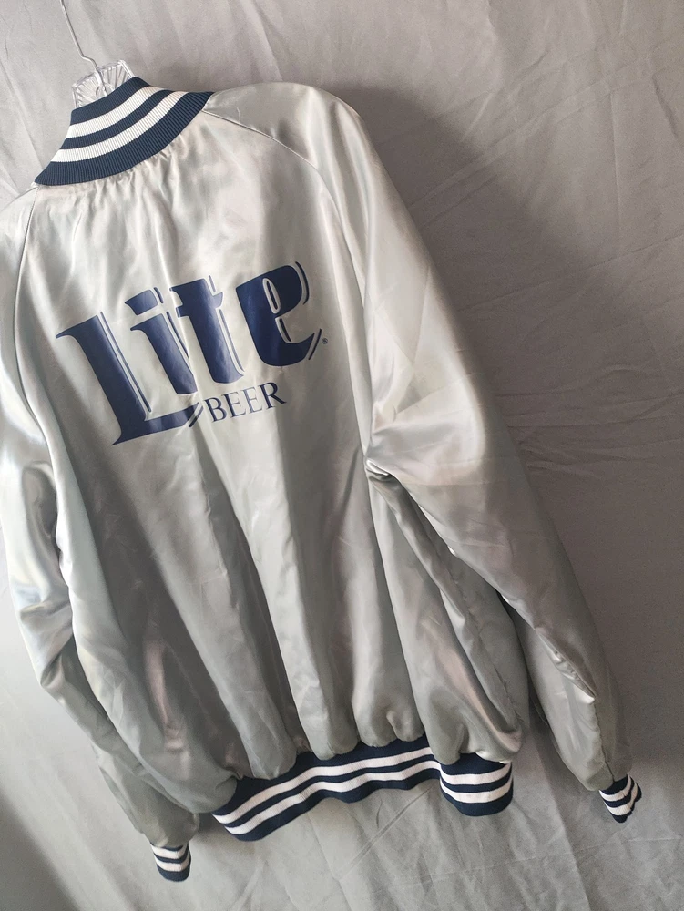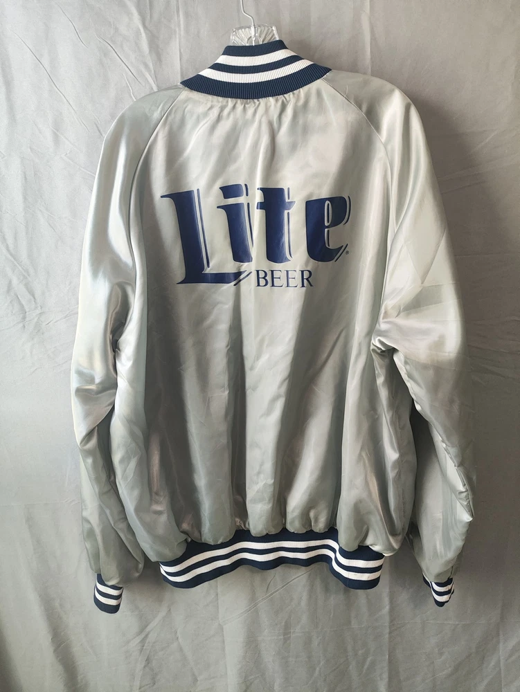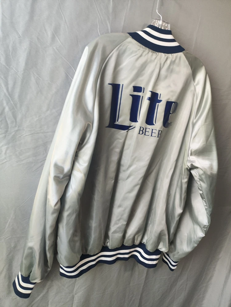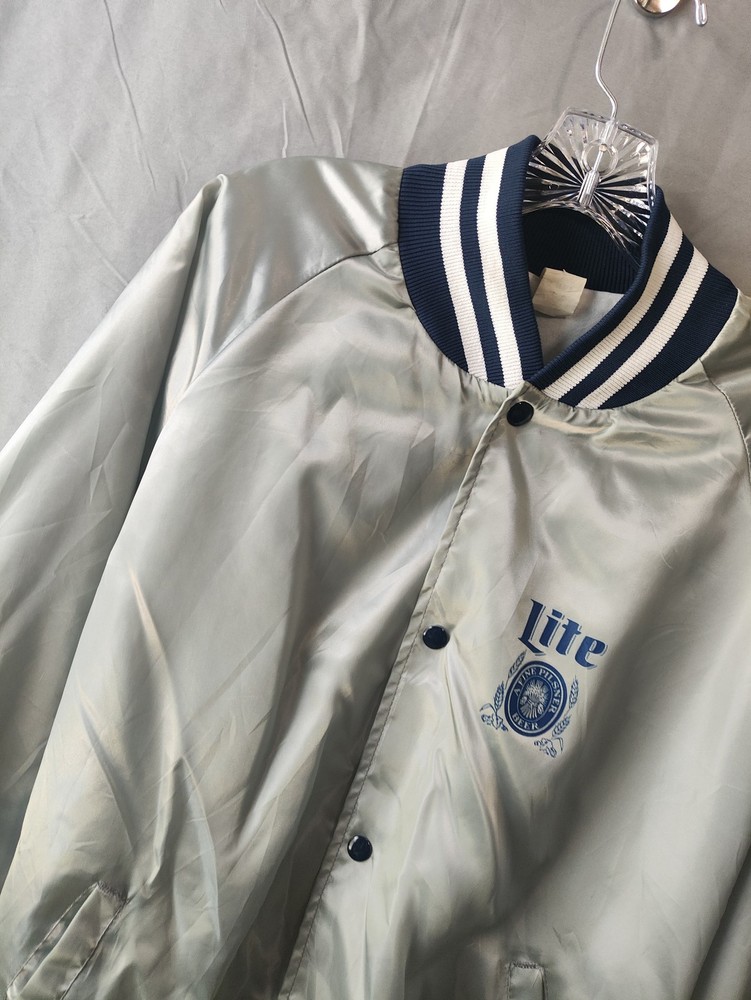 Vintage Miller Lite Jacket Mens Large Silver Blue Satin Bomber Beer Promo 80s USA Condition: Good vintage condition with light overall wear and minor wrinkling from storage. No major stains or tears noted. Please see photos for details. 100% polyester, made in USA (see faded collar tag) Classic Miller Lite "A Fine Pilsner Beer" front chest logo and large Lite Beer graphic on back in blue print Silver satin shell, blue and white striped ribbed knit collar, waistband, and cuffs Snap button front closure, two front hand pockets Bomber/varsity style silhouette with raglan sleeves Estimated size: Large (see measurement photos for reference) Great collectible beer promo jacket, ideal for retro parties, memorabilia display, or everyday vintage wear