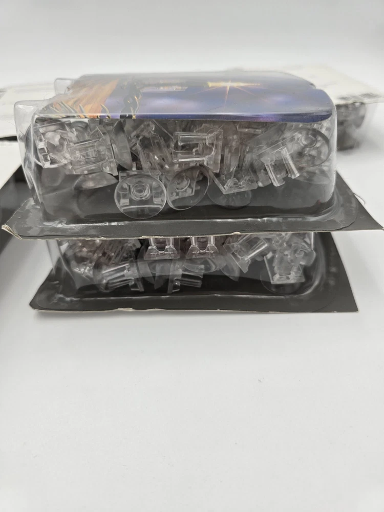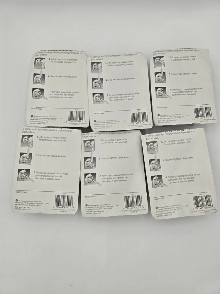 6 packages of 50 each GE suction cup light clips, total of 300 clips. New in package, but top was cut off the packages. Some yellowing due to age. Please see pictures.