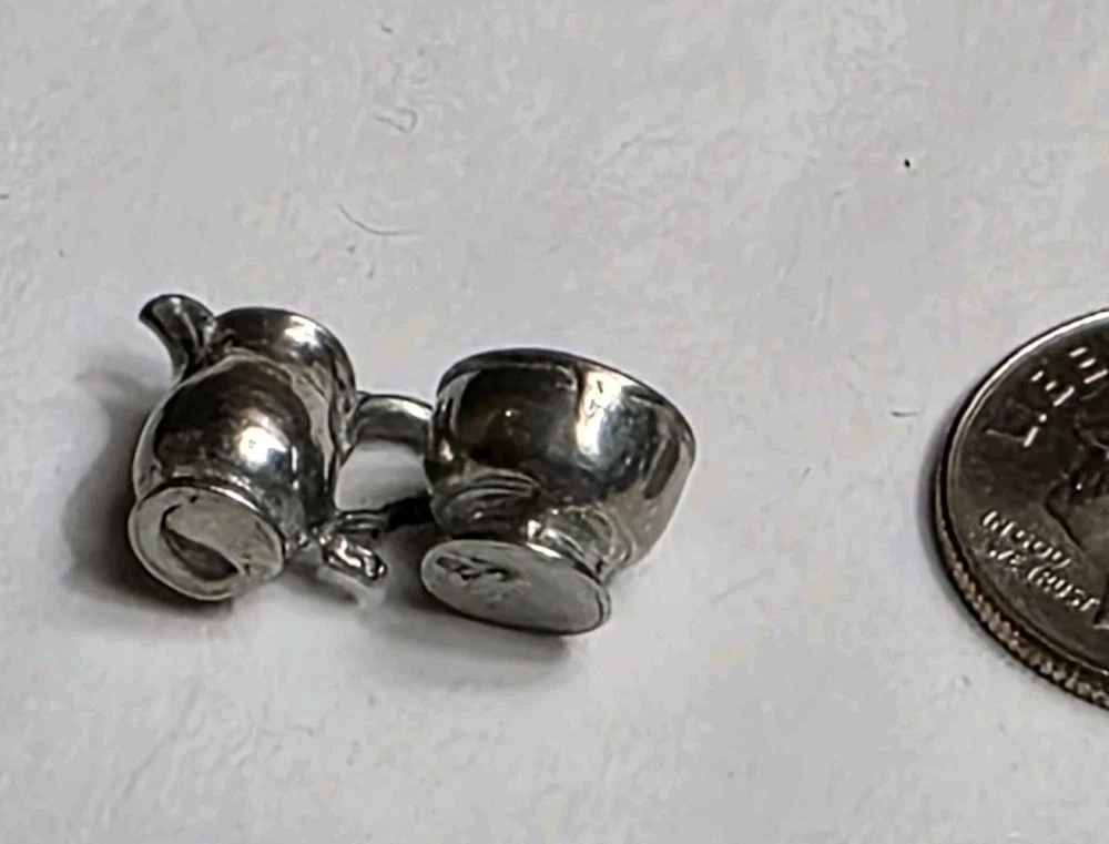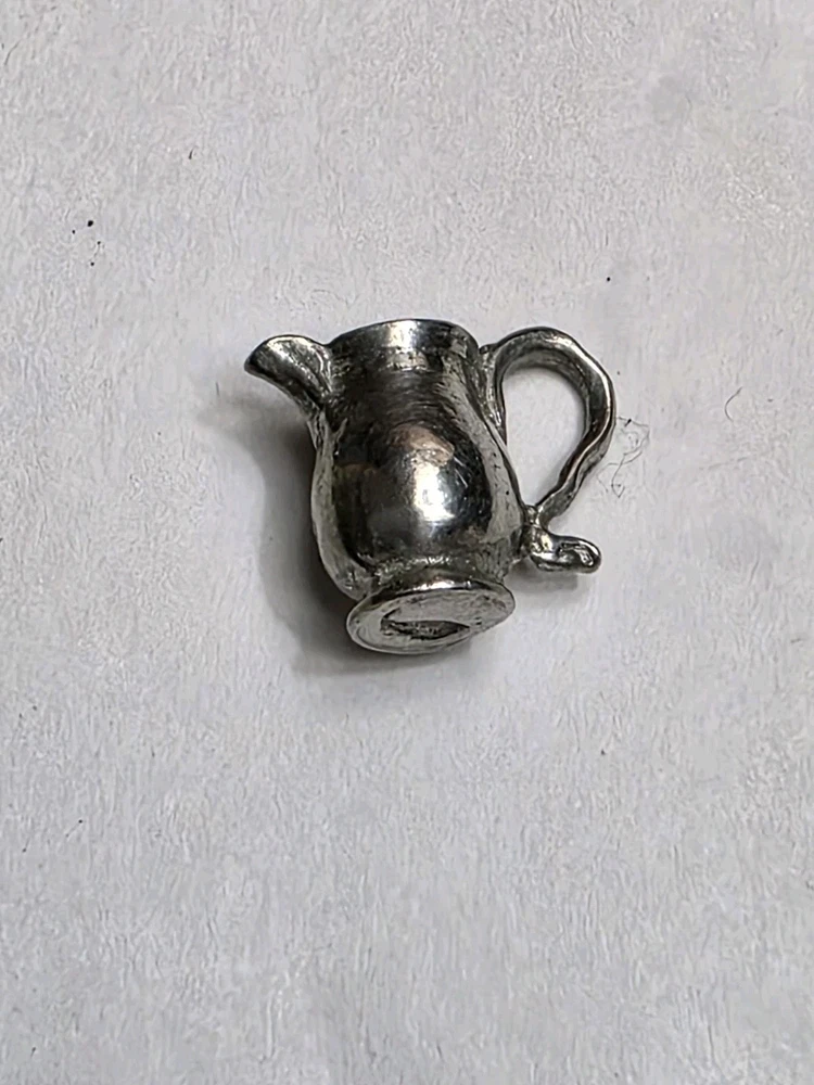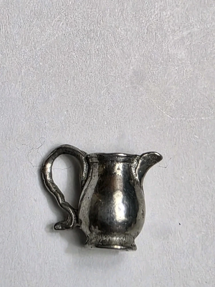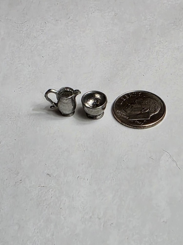 This vintage artisan dollhouse miniature is a sterling silver sugar and creamer set, perfect for adding a touch of elegance to any dollhouse dining room. Handcrafted with attention to detail, this piece captures the beauty and craftsmanship of a bygone era, adding a touch of vintage charm to your dollhouse decor.