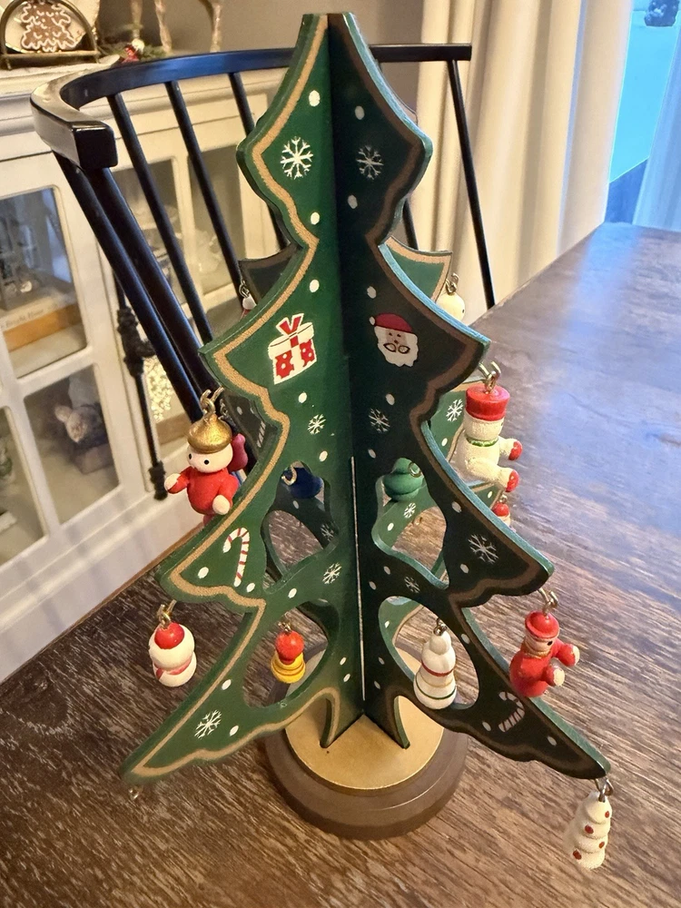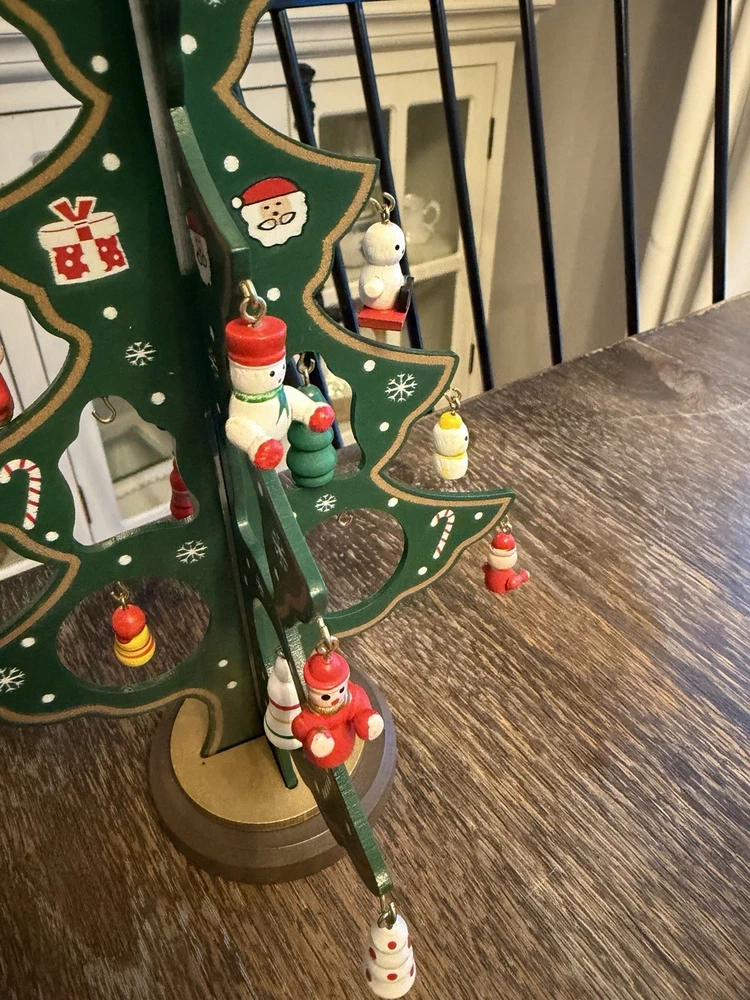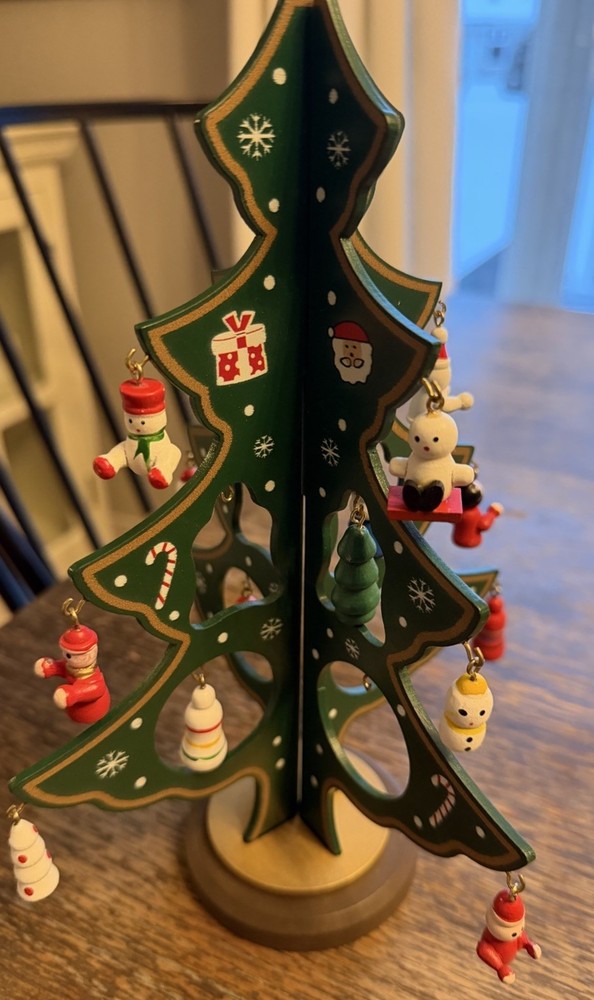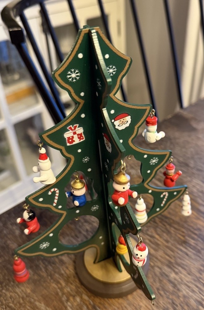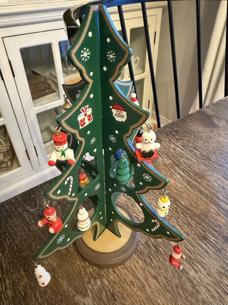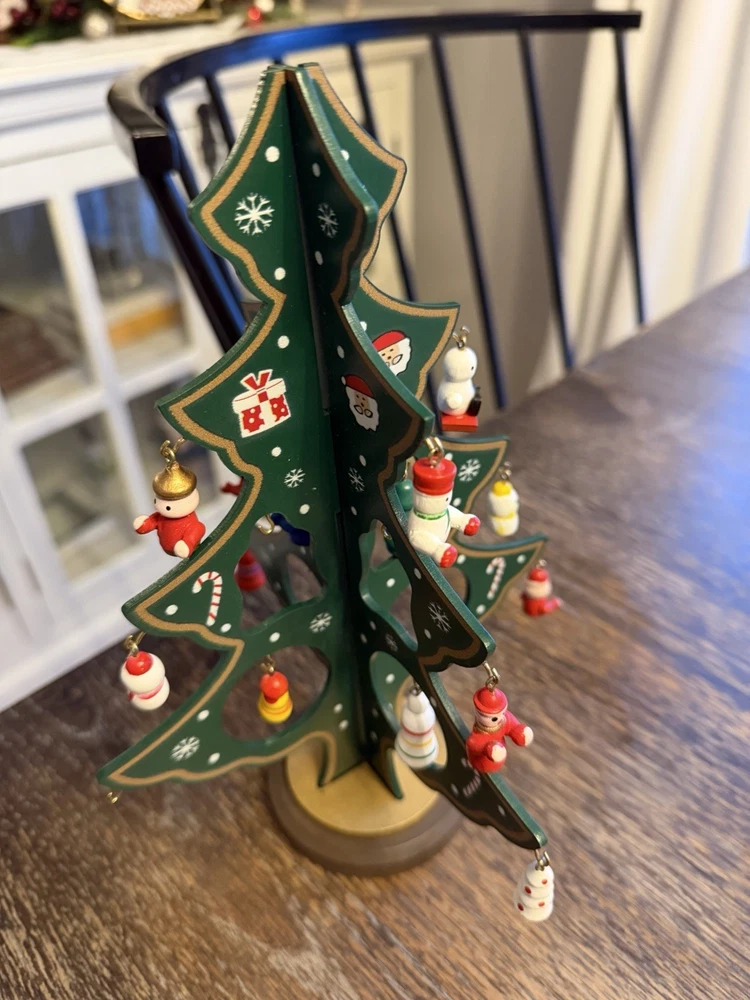 Vintage Miniature Wooden Christmas Tree With Miniature Wood Ornaments Hand Painted Adorable item that measures 9.5” tall about 6” wide . Missing star on top but anything could be added . Comes with 15 ornaments that measure about 1” long with hook. Tree has open hooks if you would like to add more ornaments.