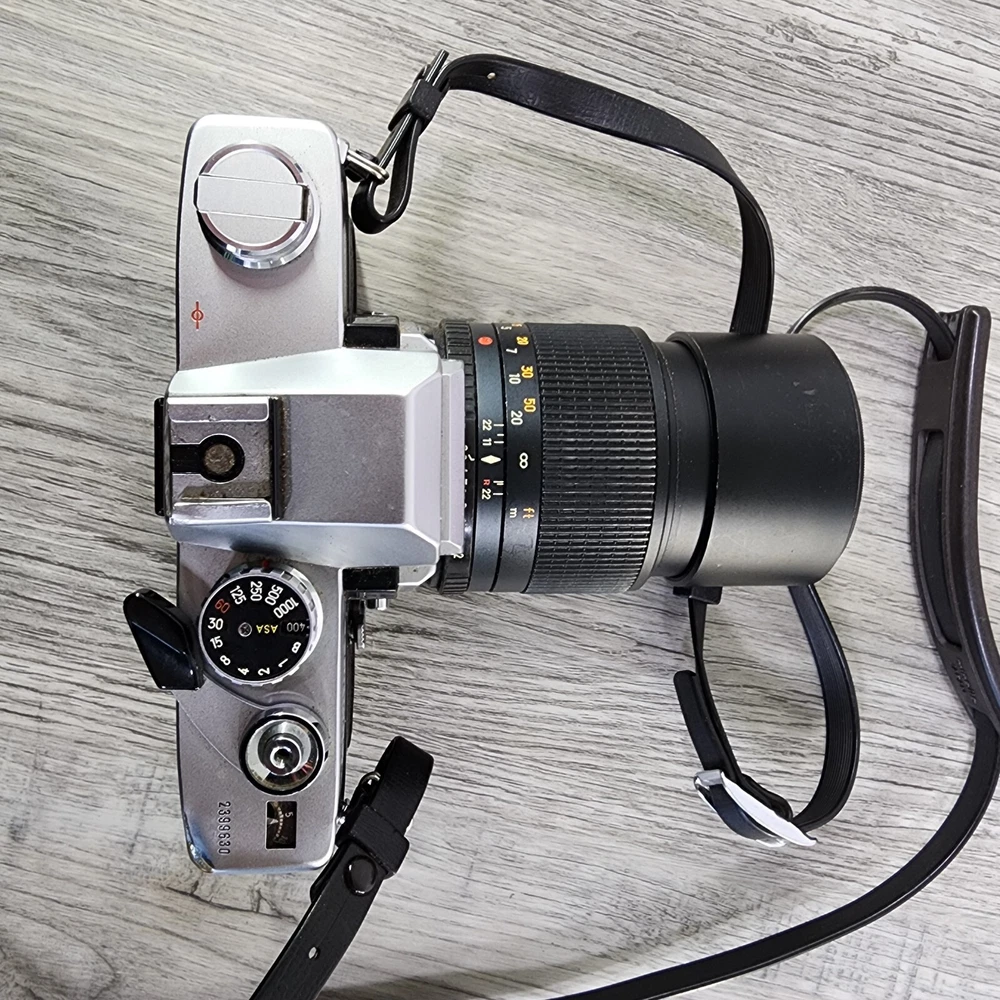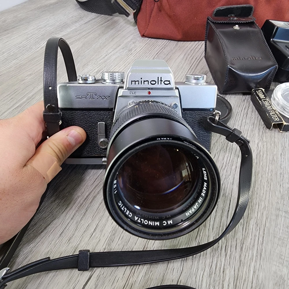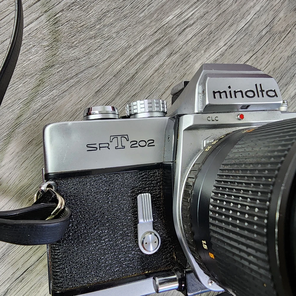 Vintage Minolta SRT202 35MM SLR Film Camera Shutter Tested Lens Bag Bundle *Read. In used condition please see pictures for details. The shutter works. It has 2 lens and a flash. Camera has a ding in thr one corner. Comes with bag and manuals. Bag is not great very dusty and bottom is seperated. Manuals are also dingy looking. Cool vintage film camera set.
