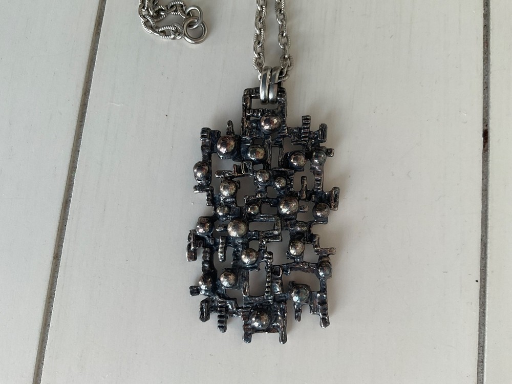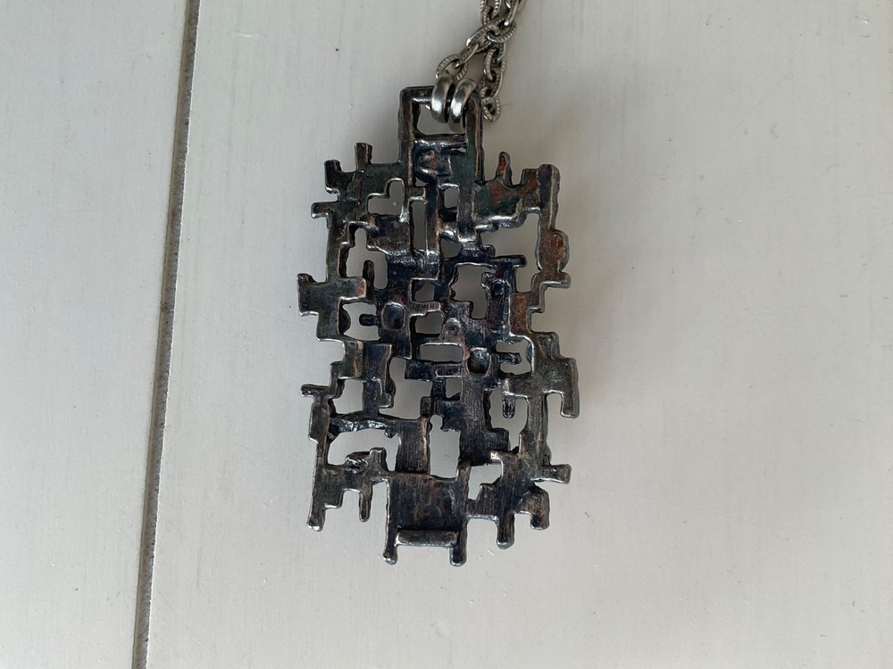 Very Attractive Well Made Vintage 1970s Norwegian Modernist or Brutalist Pendant Necklace attributed to Astrid Holthe. Pendant measures appx 2.5 inches long and chain is 24 inches. Excellent quality and condition.