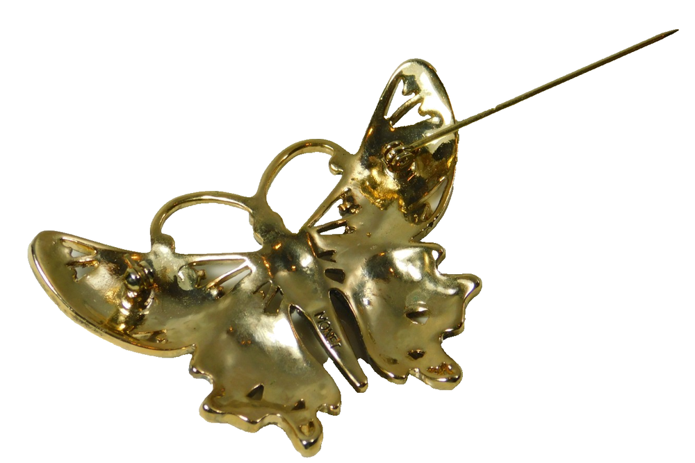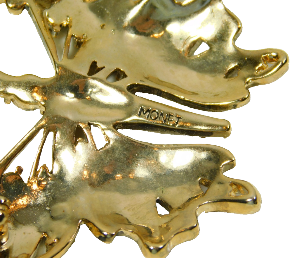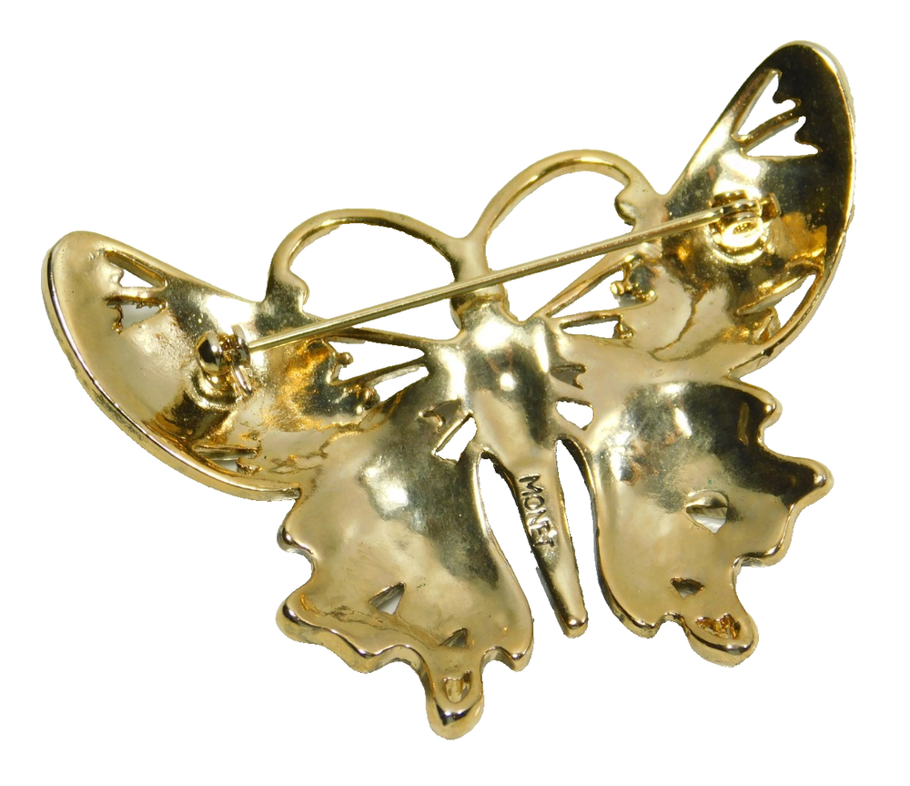 Vintage Monet Brown Enamel and Amber Rhinestone Gold Tone Butterfly Brooch Pin This eye catching 1980's gold plated butterfly brooch has vivid copper brown enamel lacquer wings with both light and dark amber rhinestone accents and a light amber rhinestone body with a dark amber rhinestone head. The back of the brooch is highly polished with a long pin stem and safety catch clasp. Signed 'Monet' Excellent Condition Measures Approx. 2 1/2" x 1 3/4" Thank You for visiting our Ebay store. Your jewelry purchase will be carefully wrapped and securely packaged to assure its safe delivery. We are happy to combine shipping on multiple purchases. Your purchase will be shipped within 48 hours of receiving payment. Customer satisfaction is our top priority, if you have any questions or need further details please contact us. 100% Satisfaction Policy Returns are accepted for refund. Please contact us within 14 days of delivery of your purchase. Once we receive the item back, we will issue a refund for the full amount of the purchase price excluding shipping.