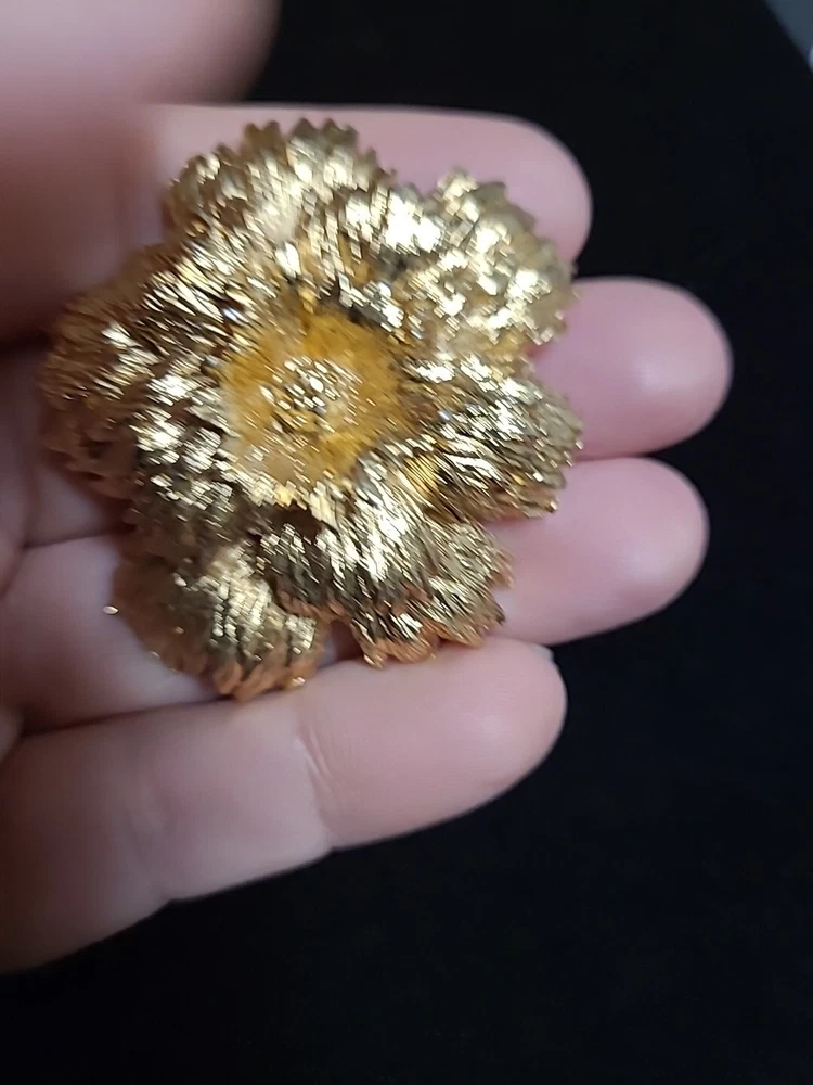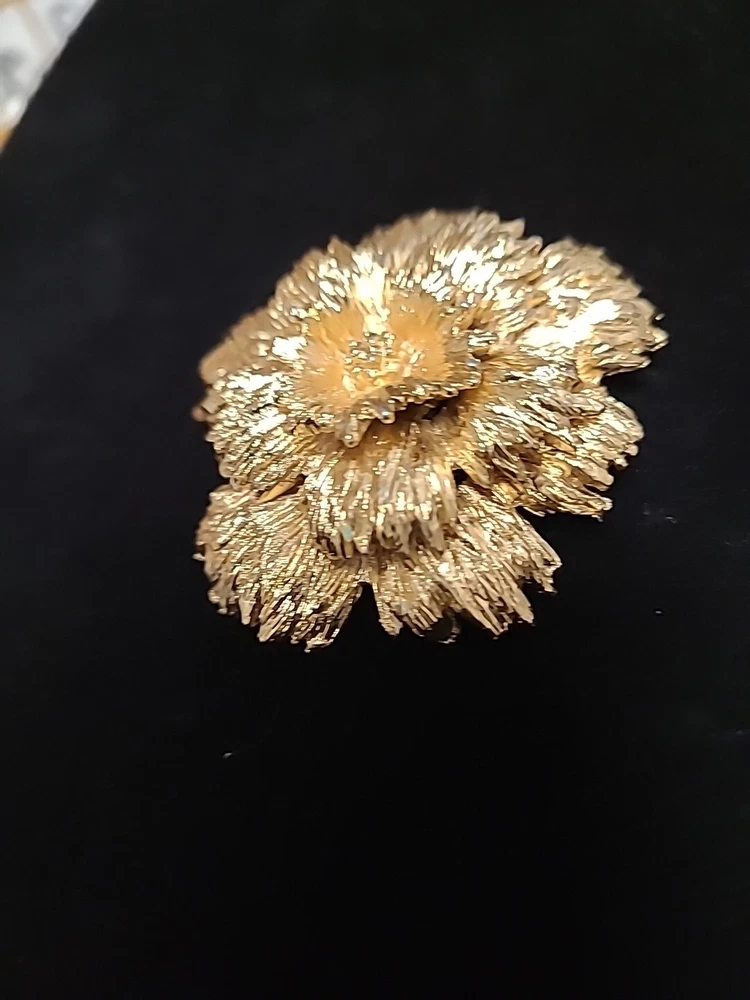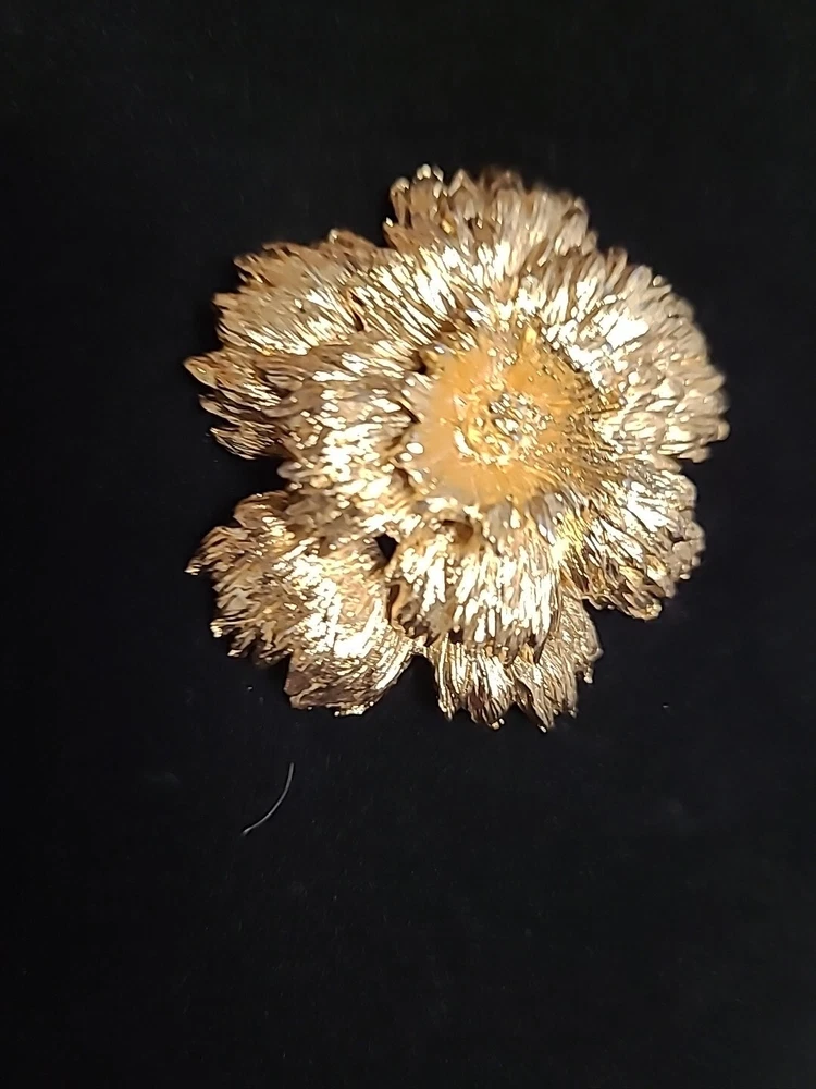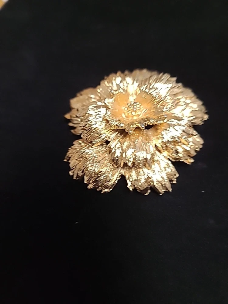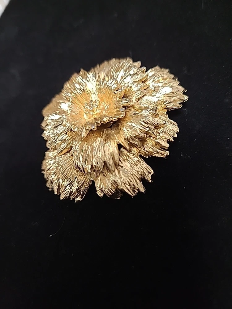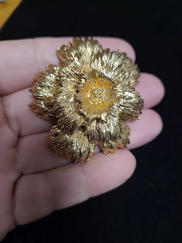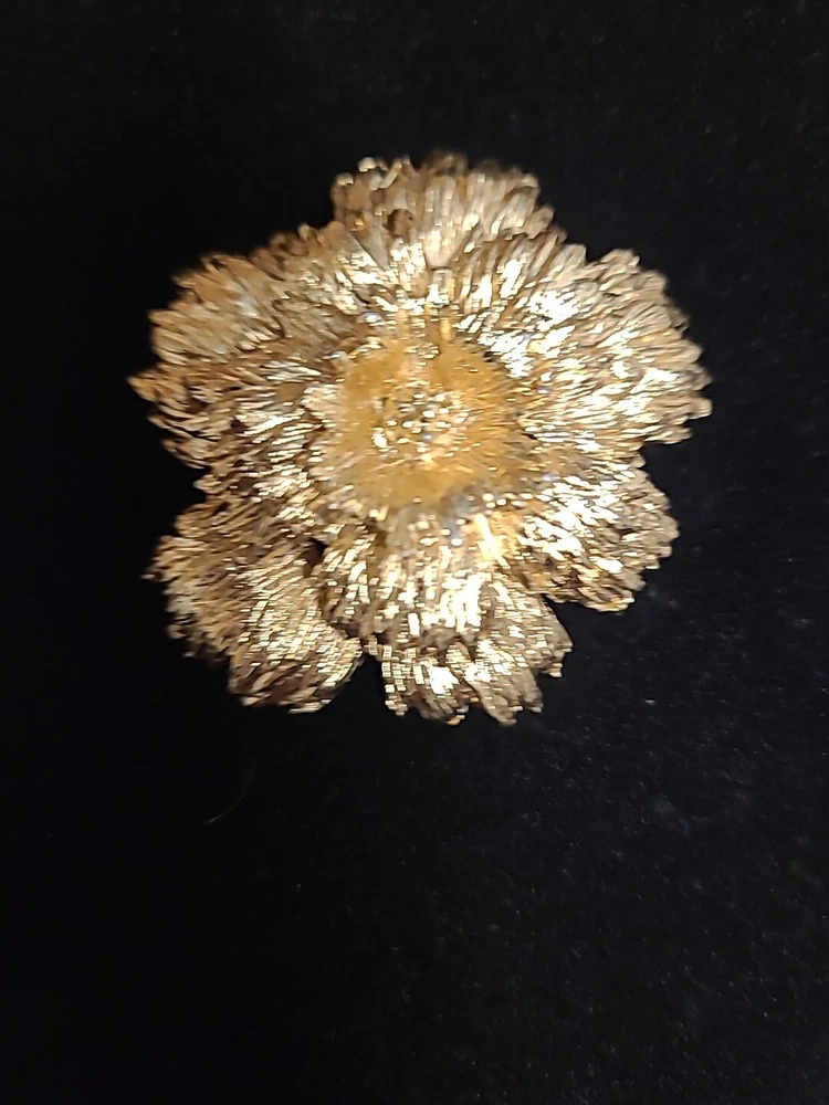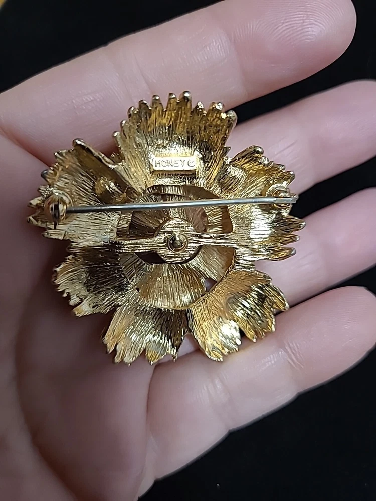 This vintage Monet brooch pin features a stunning sunflower design in goldtone, measuring 1.90\". The piece is signed and perfect for Christmas, anniversary or birthday gifts. The brooch belongs to the Flowers & Plants theme and is made by Sunflower brand. The item is pre-owned and has a vintage touch to it.