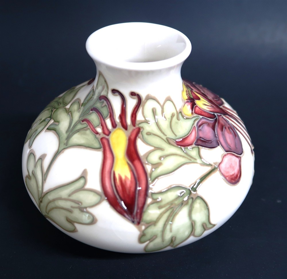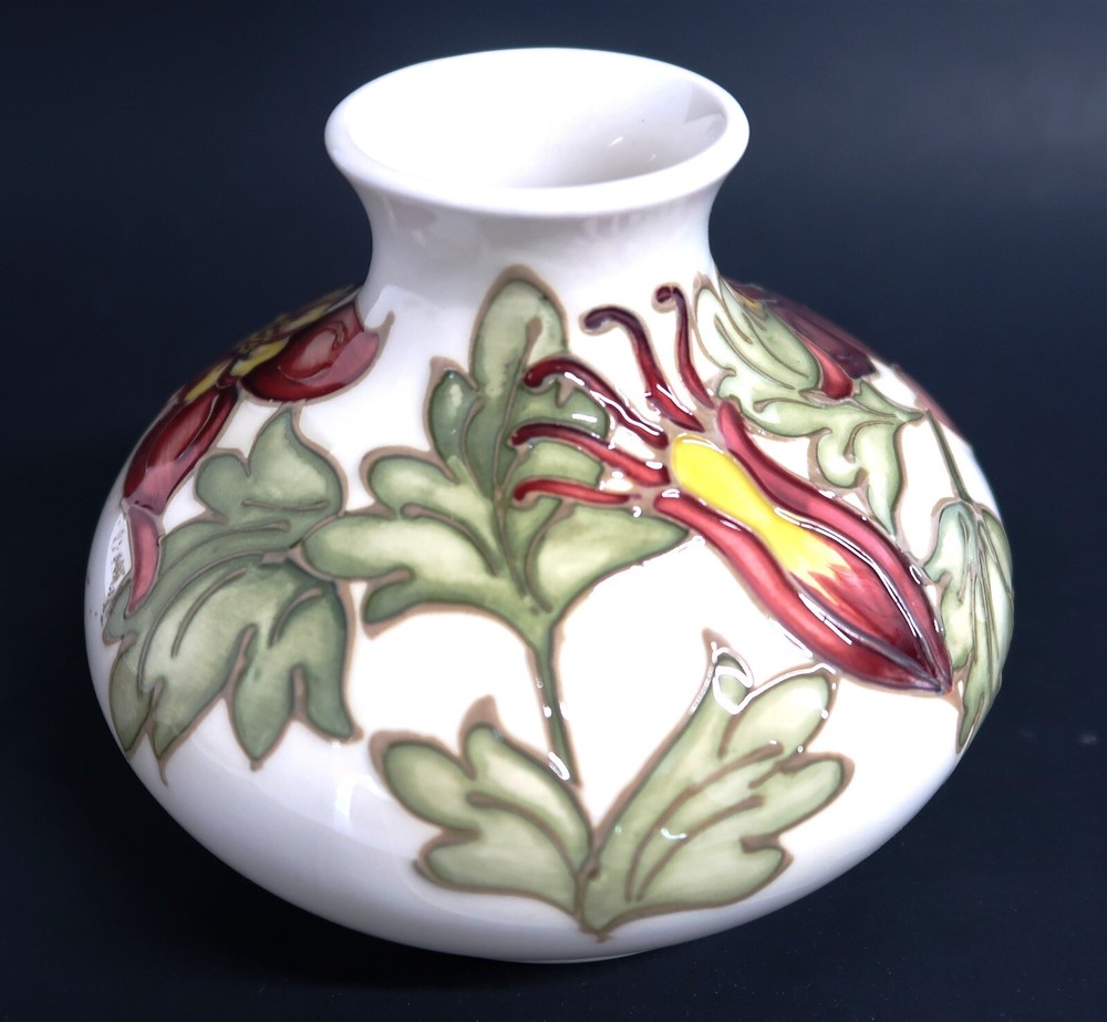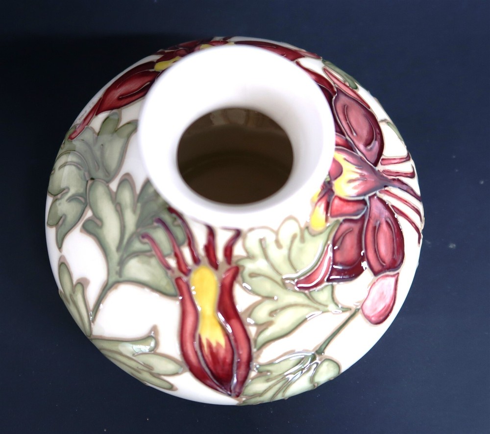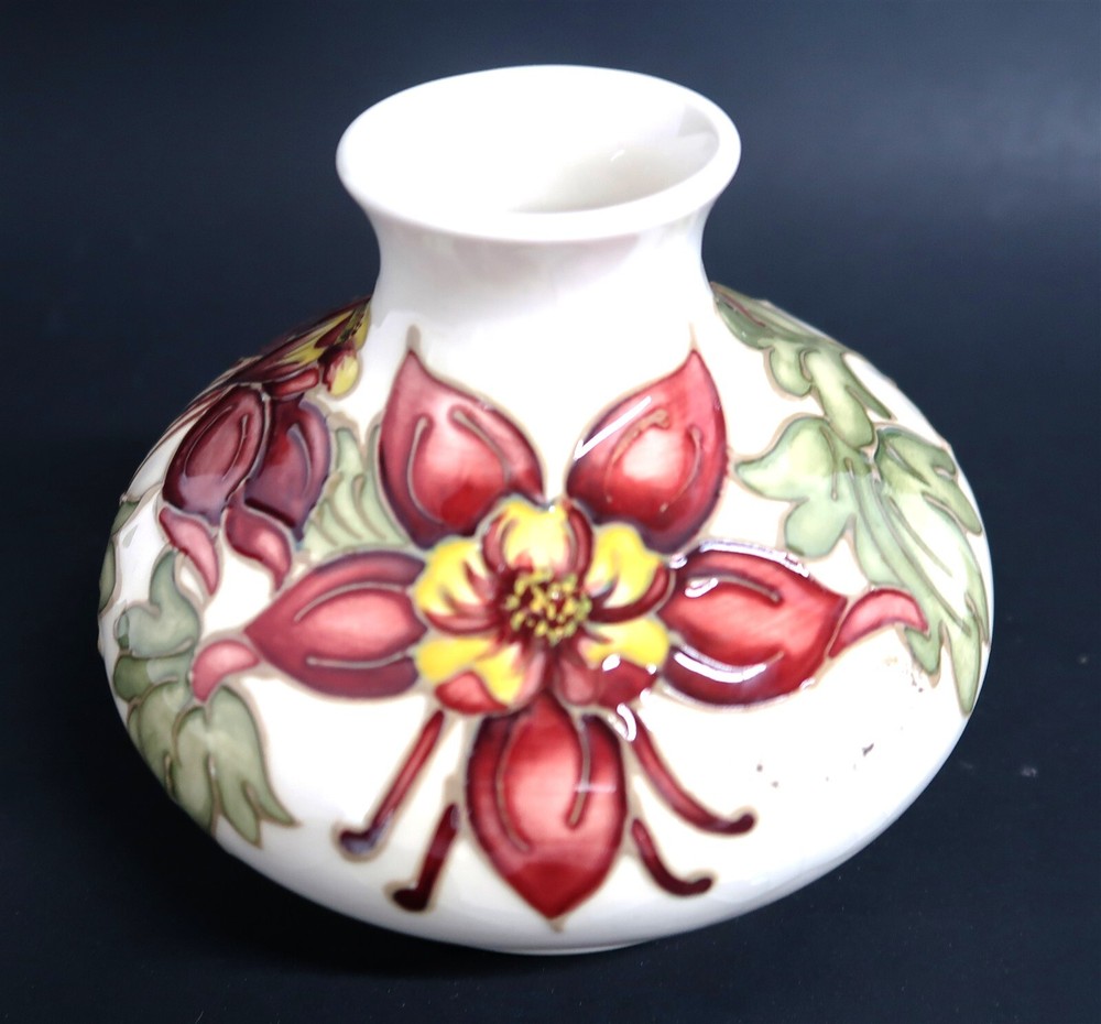 Vintage MOORCROFT Columbine Squat Bud Vase Made in England SIGNED on Bottom This eBay listing is for a used/vintage Moorcroft of England ceramic covered squat bud vase in I believe the Columbine pattern. This is marked on the bottom along with a live signature. The overall size is 4.25" tall by 5.5" across. The condition is excellent with no chips, fleabites, cracks or repairs found....BUT...it does have some Crazing in the clear coat glaze from age. Seller Location Reference - China Rows BID IN CONFIDENCE – CHECK MY FEEDBACK! My goal is your satisfaction. I leave positive feedback right after the payment is received for all orders!! If you plan to leave anything less than positive feedback and 5 stars - please let me know so that I can work out any problems that you may have. I aim to please!! SHIPPING & HANDLING FOR US BIDDERS We ship ASAP upon payment as noted above within 1 business day 99% of the time!! We normally pack up your new treasures 2 - 3 times a day and ship using USPS and Fedex Ground so that you get your items in a timely fashion. As always - there is no charge for local pickup on any of my items!! SHIPPING AND HANDLING FOR INTERNATIONAL BIDDERS Import duties, taxes and charges are not included in the item price or shipping charges. These charges are the buyer’s responsibility. Please check with your country’s customs office to determine what these additional costs will be prior to bidding/buying.” THANK YOU AND HAVE A WONDERFUL DAY!! Powered by SixBit's eCommerce Solution
