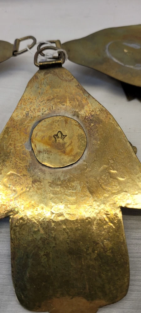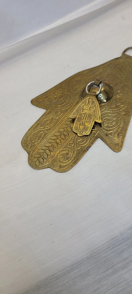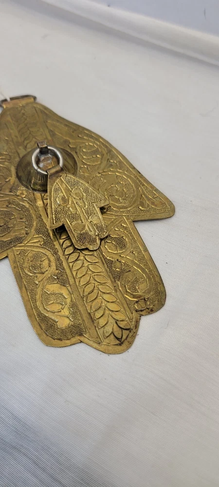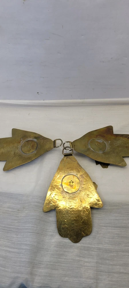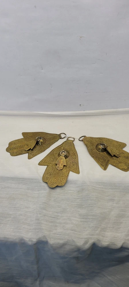 This vintage Moroccan double Hamsa amulet brass talisman wall hanging set of 3 is handmade and features a design rooted in Judaism. The intricate brass work reflects the cultural and religious influences of Morocco, making it a unique and symbolic piece for collectors of Judaica or spiritual items.