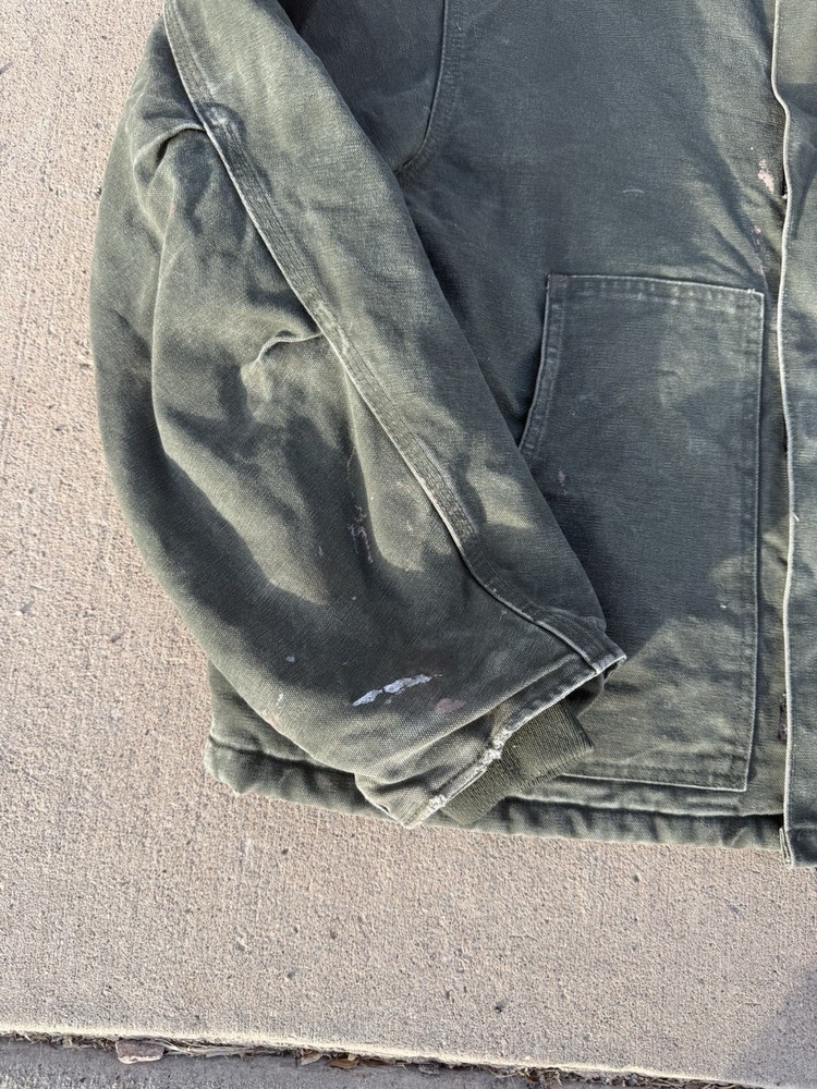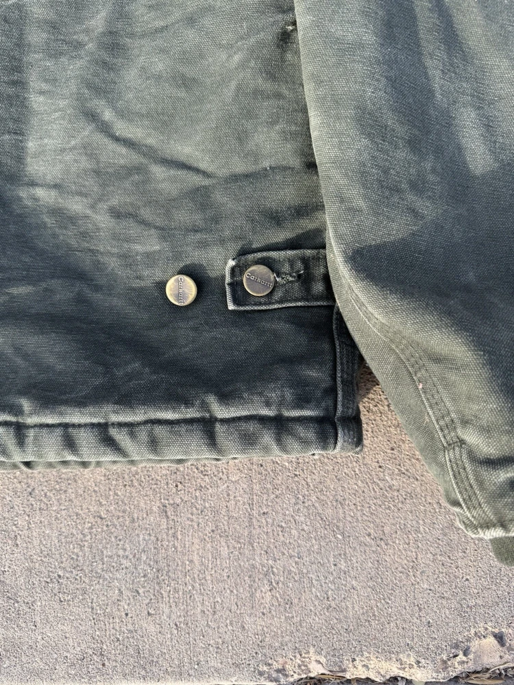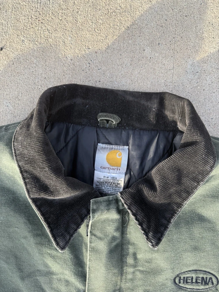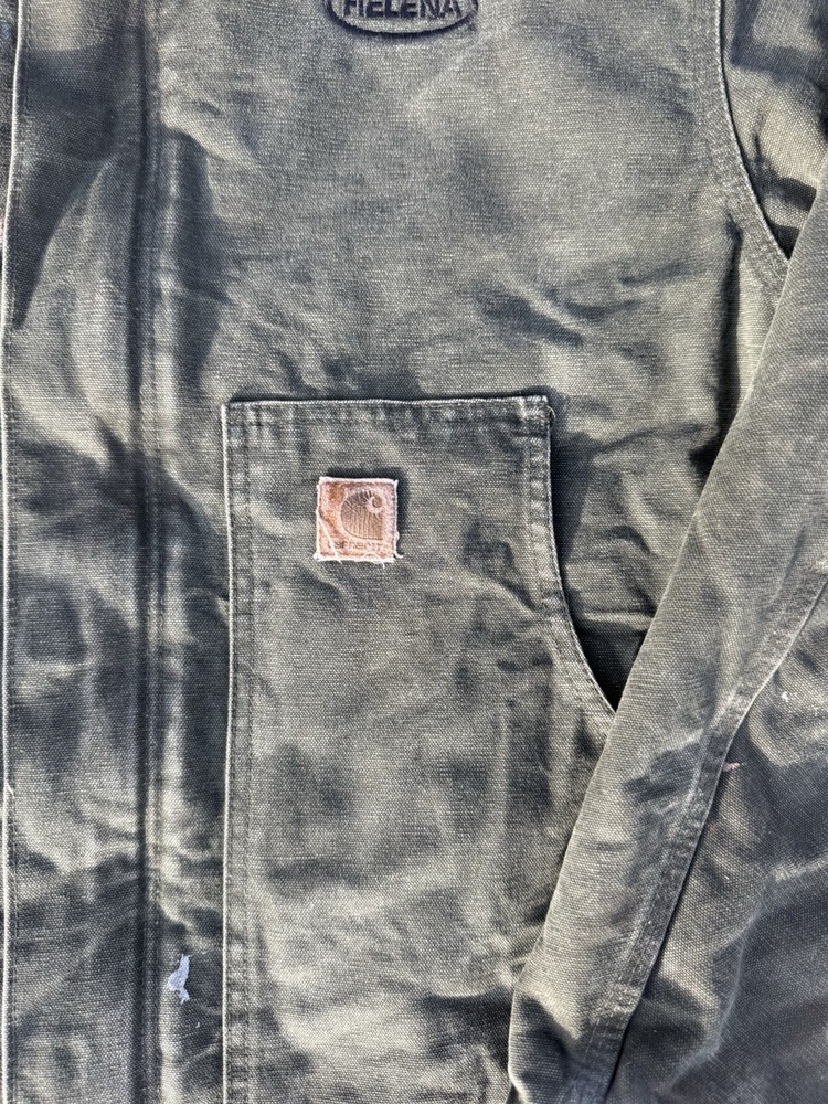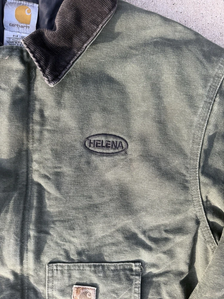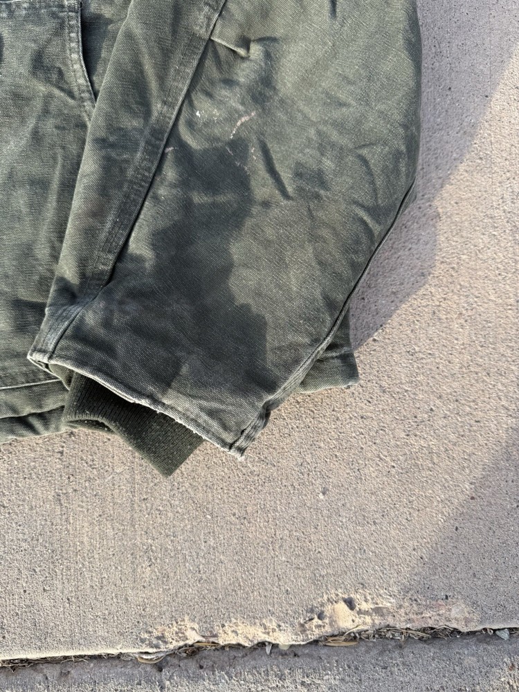 This Vintage men’s moss green Carhartt jacket in size XL is a classic workwear piece made of durable cotton canvas with a polyester lining and insulation, perfect for the winter, fall, and spring seasons. The bomber style jacket features a zip closure and the signature Carhartt logo accents, adding to its vintage appeal. With a regular fit and mid-length design, this jacket is suitable for casual wear and outdoor activities like walking and hunting, reflecting the rugged and practical heritage of the Carhartt brand.