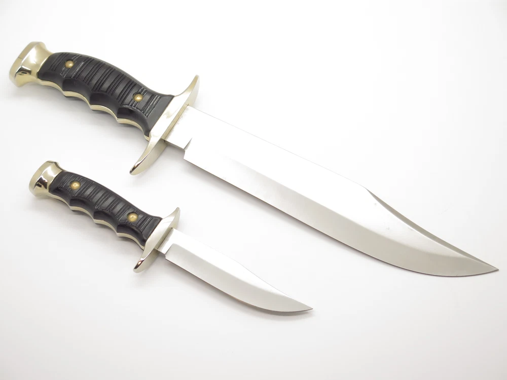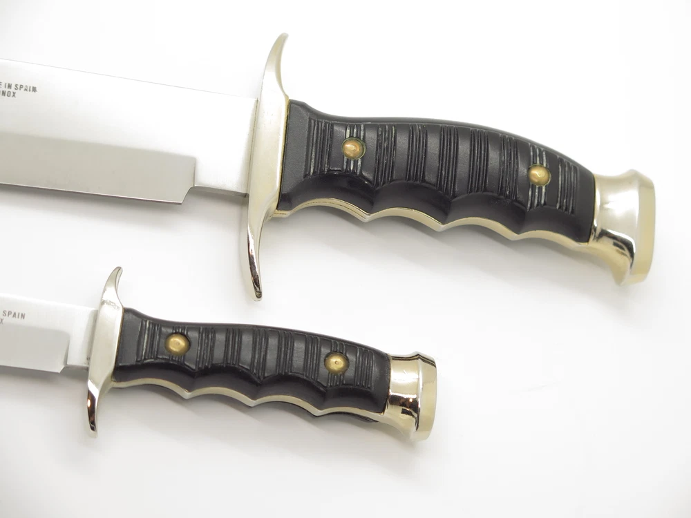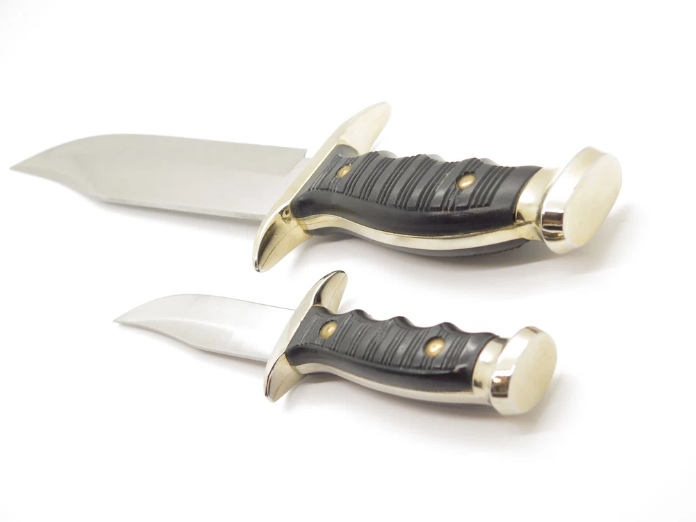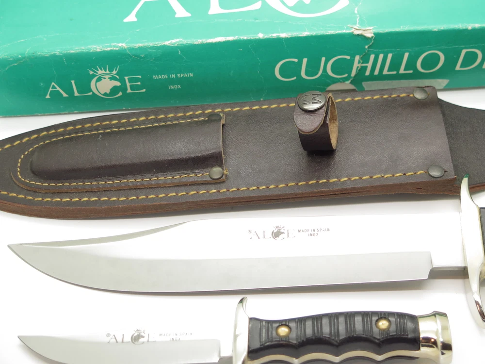 ePrague Contact Visit Store New Items Alce Twin bowie set This is a very nice vintage Alce twin knife set made by Muela in Spain. It features synthetic handles with a cast guard, liner, and pommel. A nice older set. Discontinued. Product Highlights Model: Alce Twin bowie set Condition: Original unused factory edge, light handling wear/aging. Box has wear. Made in Spain Folder Closed, or Fixed Overall Length: 13.3" and 7.6" Blade: 8.7" and 3.8" long, Stainless Steel Handle: Synthetic Comes with sheath in box About Us A member of eBay since the year 2000, ePrague Knives has helped customers find the perfect everyday-carry knife as well as the “safe queen” collectible. Based in Post Falls, Idaho, we offer new and used knives and we specialize in obtaining rare cutlery direct from Seki, Japan. Online retail requires a company that is able to bring the showroom experience to the web - we do this with superior photography, detailed descriptions, great customer service, and speedy safely packaged shipments. Newsletter Click "❤ Save This Seller" on the main product page then go to "Saved Sellers" and check the box to subscribe to newsletter. Desktop users please click the "Sign up for Newsletter" link above. Terms Laws change and vary according to location. By purchasing, you verify that you are legally able to purchase the Product and you verify that you are over the age of 18 years and are aware of and in compliance with all local, state, and federal laws. You shall be responsible to check all applicable federal, state, and local laws concerning the purchase, ownership, use, and possession of any Products sold to you by ePrague, LLC. By purchasing Product, you verify that you are of legal age (no minors), and will use the Product legally and assume all responsibility. By ordering and purchasing Product from ePrague, LLC, you agree that the Product can legally be purchased and owned by you in accordance with all federal, state, county and local laws. ePrague, LLC and its employees shall be held blameless and will not be held liable for any infraction of laws by the purchaser. ePrague, LLC will not be held liable for any injuries from any item purchased from ePrague, LLC. Contact Can't find what you are looking for? Please contact us and we will be happy to help.