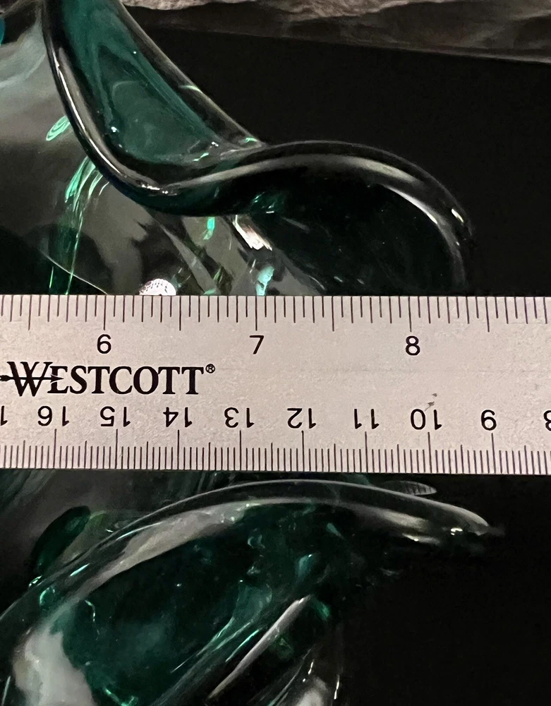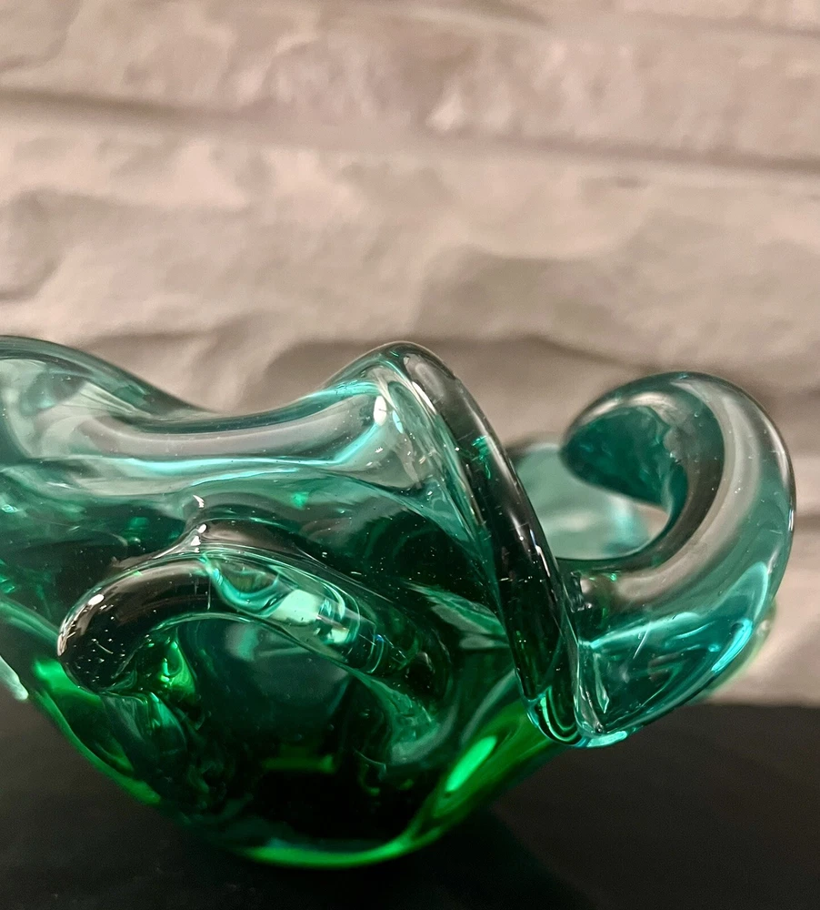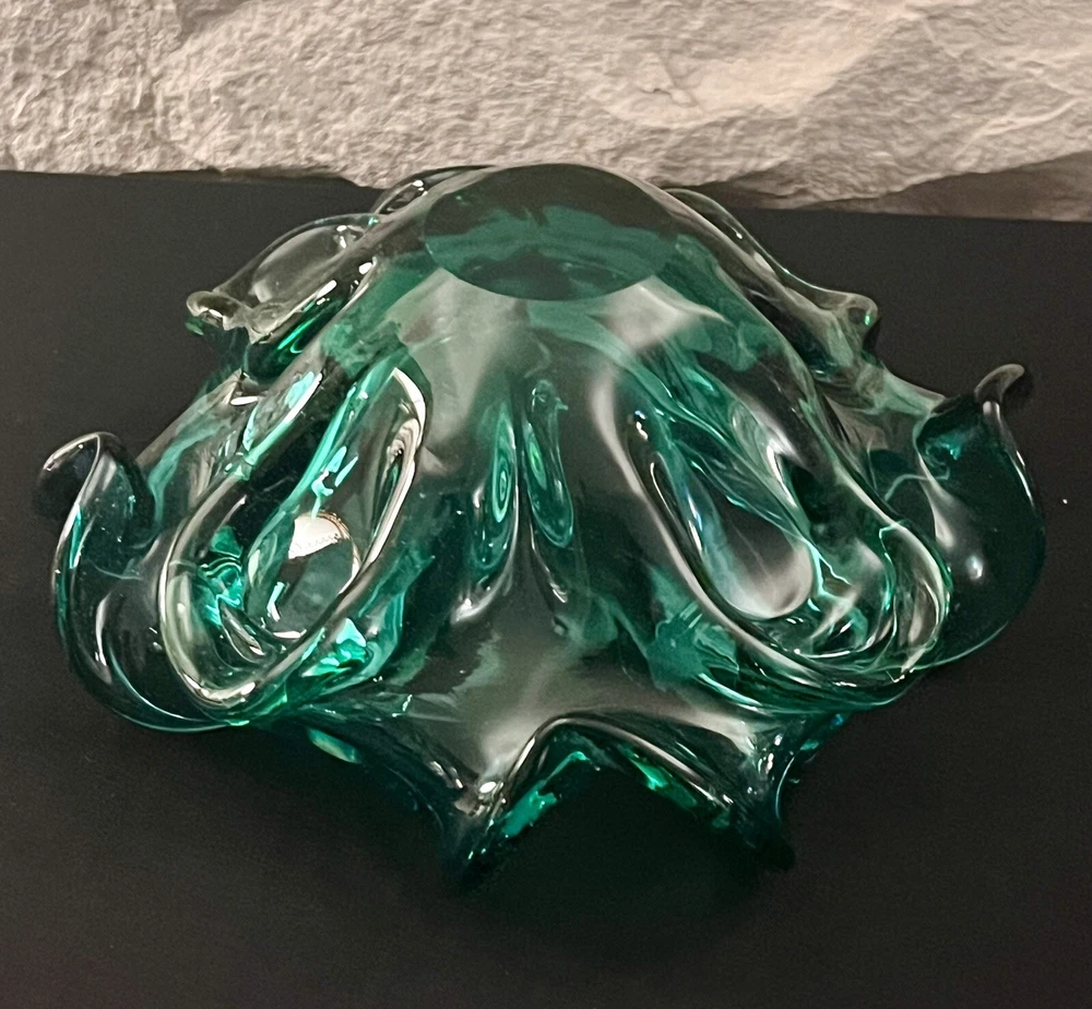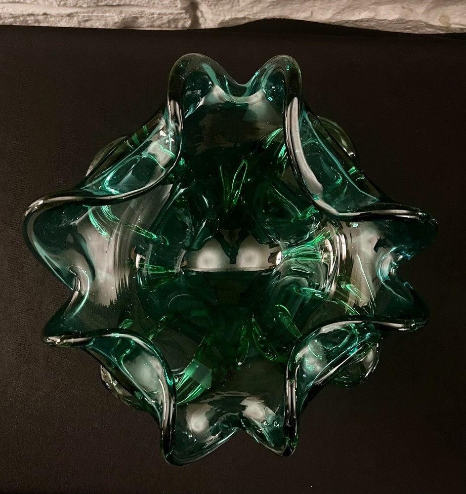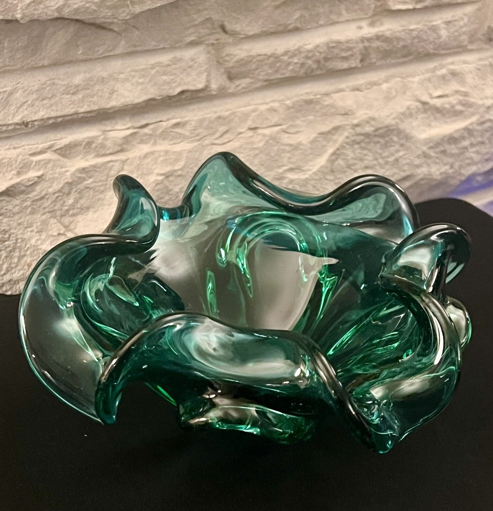 This is a vintage Murano glass bowl by Barovier Toso, originating from Murano, Italy. The bowl is round with a floriform shape and features a green rolled edge. It is hand blown and measures 8.6 inches in length and 4 inches in height. The bowl is part of the Mid-Century Modern style, with a limited edition decorative design suitable for use as a fruit bowl, console dish, or centerpiece.