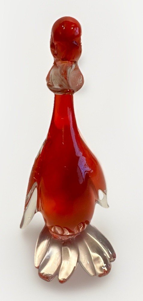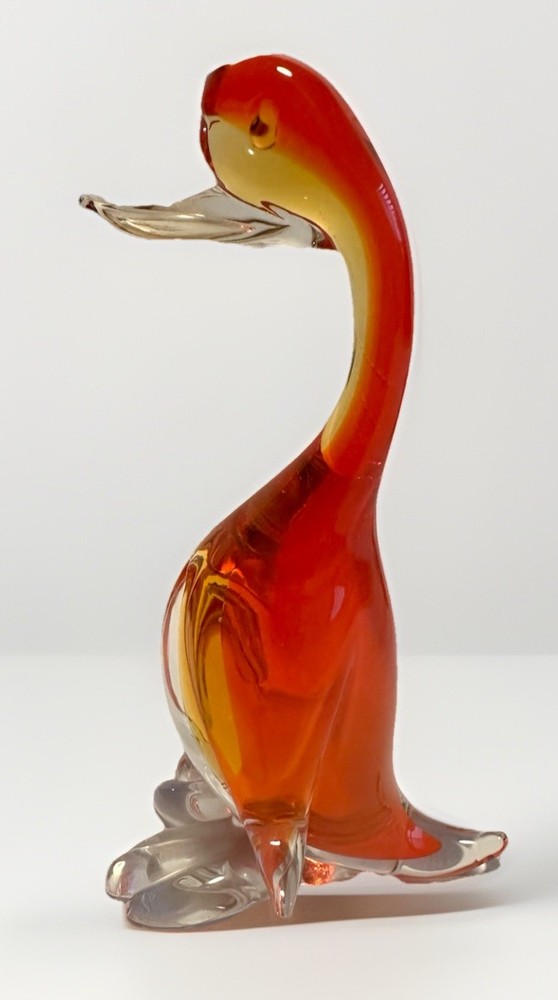 This product is a vintage Murano Italy handblown glass 6" duck figurine from the 60s/70s, showcasing the Italian craftsmanship and Mid-Century Modern style. The orange glass figurine is intricately handcrafted with a glossy finish, making it a unique and decorative piece for any collection. Originating from Europe and featuring a European brand, this handblown glass duck figurine is a charming representation of Italian artistry and a beautiful addition to any home decor. This Mirano glass art figurine is in excellent condition with no chips or cracks. There is a rough edge to the pontil mark on the bottom. The label is still intact but has moderate wear. See All Photos for details. The art glass will be packed very secure in bubble wrap and packing paper and marked fragile to prevent damage during shipment.