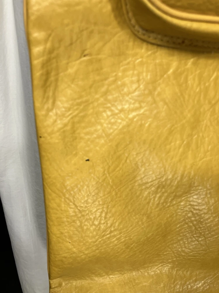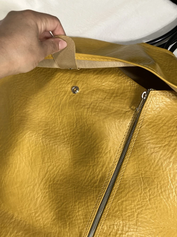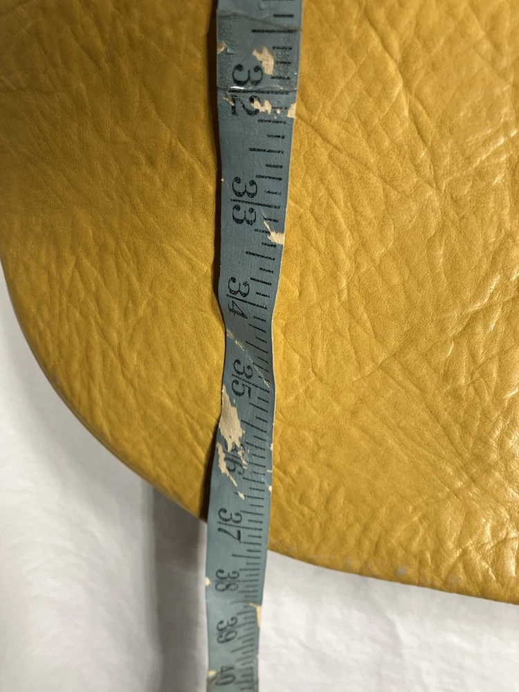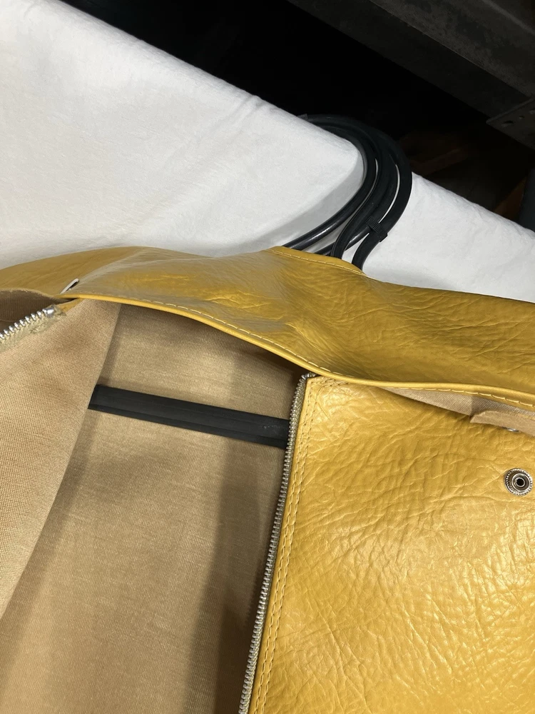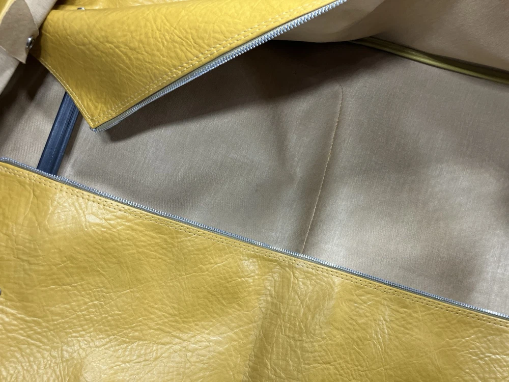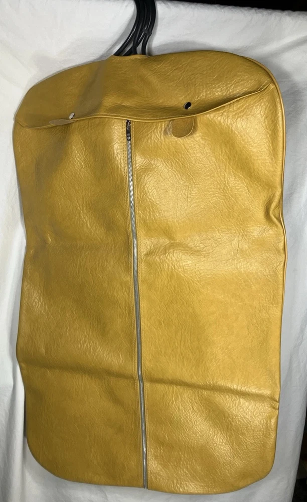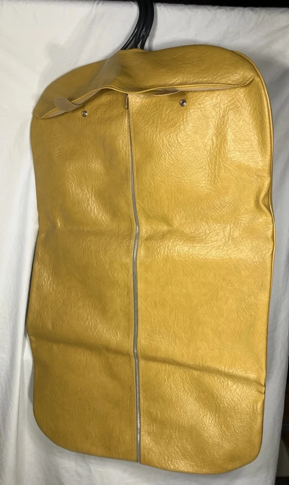 This is a vintage American Tourister garment bag in mustard yellow. It features a clothing compartment and is made of faux leather or possibly real leather. Not super sure. The bag is designed for carry-on use and has a size of 37". Suitable for both men and women, this stylish garment bag is a practical and fashionable choice for travel. Retro traveler. Zip and button snap closure.