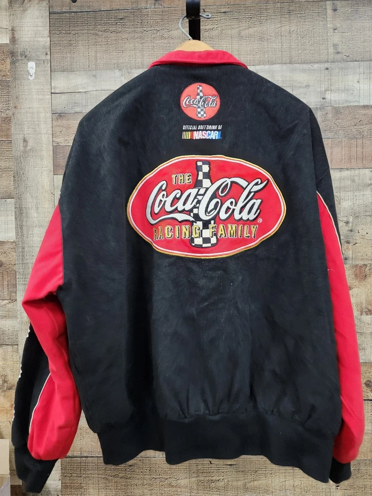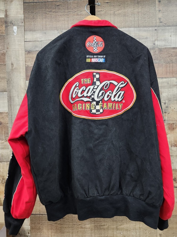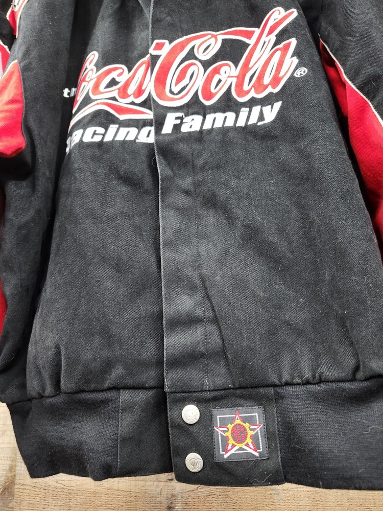 The product is a vintage NASCAR Coca-Cola Racing Family jacket in size X-Large. Officially licensed by NASCAR and featuring a design that pays homage to Dale Earnhardt and the Coca-Cola team, this black jacket is a must-have for any auto racing fan. Made in Korea, Republic of, this jacket showcases both the Coca-Cola brand and the excitement of NASCAR in a stylish and comfortable design. Perfect for men who appreciate both classic Coca-Cola advertising and the thrill of auto racing. I ship IMMEDIATELY 🚢