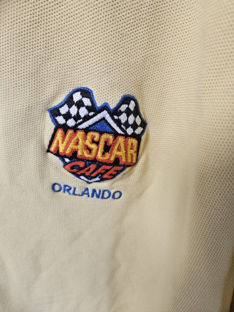 The Vintage NASCAR Cafe Orlando Polo Shirt in size XXL is a men's short sleeve shirt in a vibrant yellow color, perfect for any NASCAR fan or auto racing enthusiast. Made by Eagle Dry Goods, this officially licensed shirt features the iconic NASCAR league branding and is manufactured in Pakistan. The unisex adult design makes it a versatile and stylish addition to any fan's wardrobe, ideal for showing off your love for racing in a classic and comfortable shirt.