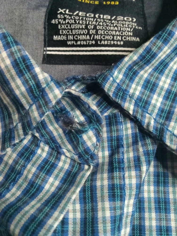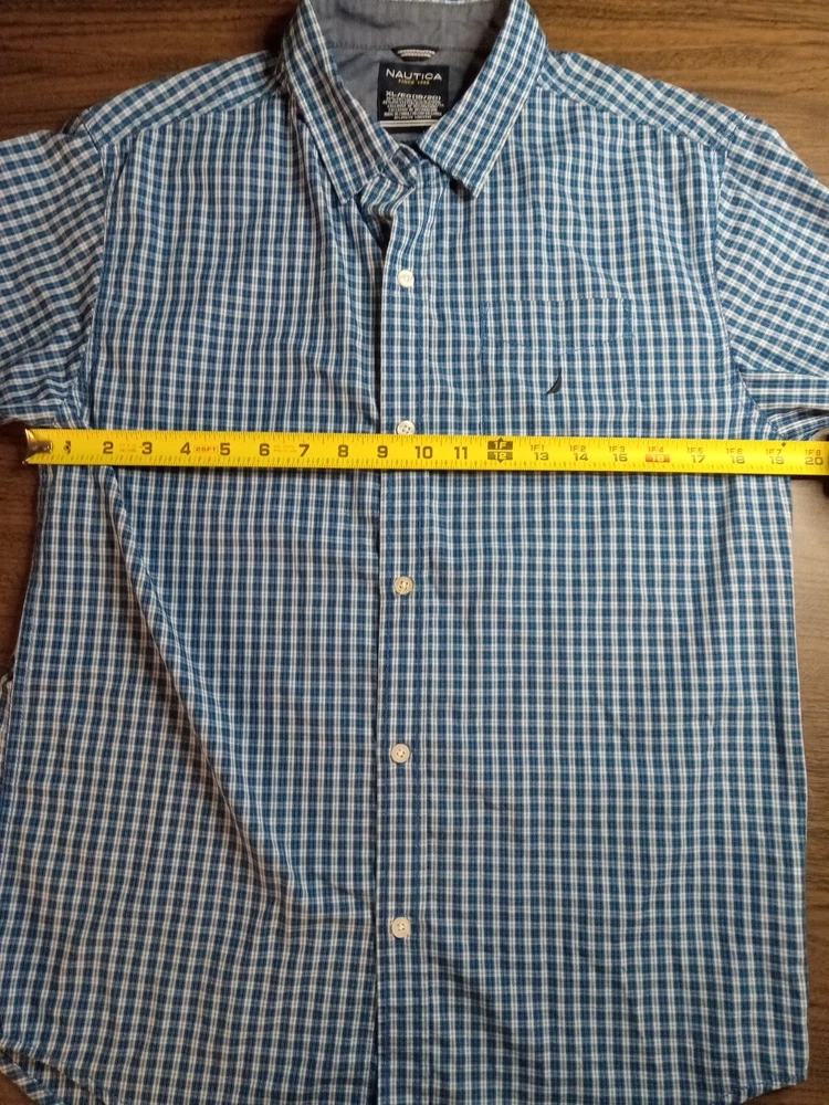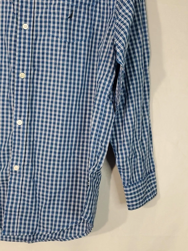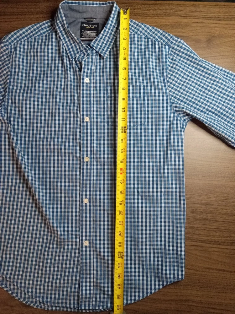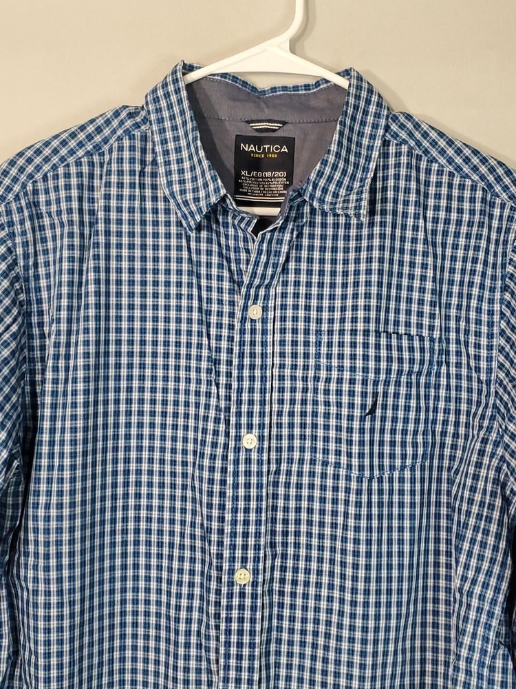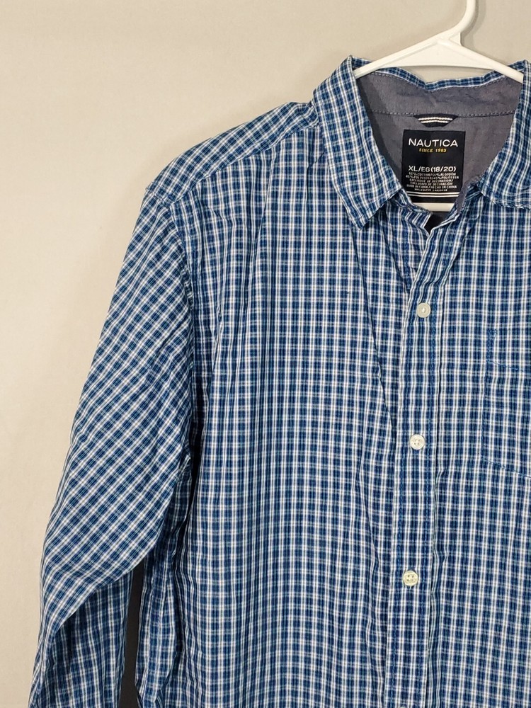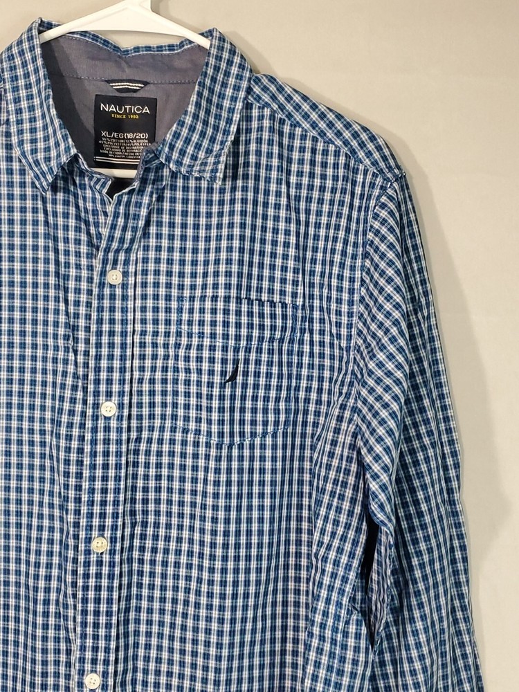Nautica Blue Green striped Long Sleeve Button Up Shirt XL 18/20. MISSING TOP BUTTON NEXT TO COLLAR. PLEASE REVIEW ALL PHOTOS PRIOR TO PURCHASE. THEY SHOW ANY FLAWS AND ALL MEASUREMENTS. THEY ARE THERE TO HELP YOU WITH A SMOOTH TRANSACTION. ALL CLOTHES IS IN EXCELLENT PREOWNED CONDITION UNLESS OTHERWISE MENTIONED. "WE DO A LIGHT WASH UPON PURCHASE OF PREOWNED CLOTHING BUT PLEASE WASH ALL PREOWNED CLOTHING ONCE AGAIN BEFORE WEARING THANK YOU!! All our items are 100% original. All items are sold in the condition that we received them. Please review the listing and photos carefully before you make your purchase. We do accept returns but the buyer is responsible for all shipping fees. Refund of the purchase price will be given once we receive the item and confirm it is still in the same condition as originally shipped If you like an item but don't like the price please make an offer, we will try and be as accommodating and flexible as we can. Please leave us a feedback when you receive your item and are satisfied with your transaction we will gladly return the favor Thank you for your business. Enjoy your purchase!!! 13