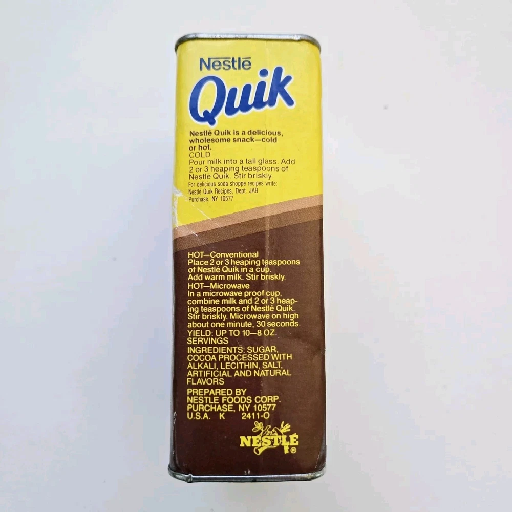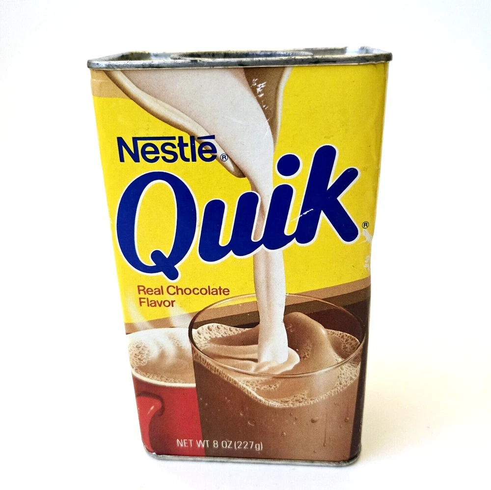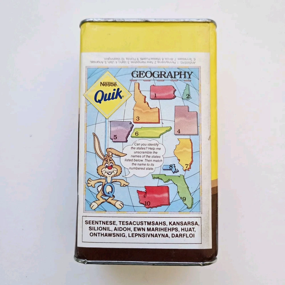 This listing is for a vintage Nestle Quik container. This is an 8 ounce container that measures about 5" tall and 3" wide. It is made of cardboard walls with a tin top and bottom. The back side features the Quik rabbit and a geography state game puzzle. The container is empty and in used condition being sold as a decorative collectible only. It is in decent condition with a few small marks in the artwork and a tiny dent on the right front corner near the bottom of the "K" in Quik. The top and the lid has some rust. See pics for more details.