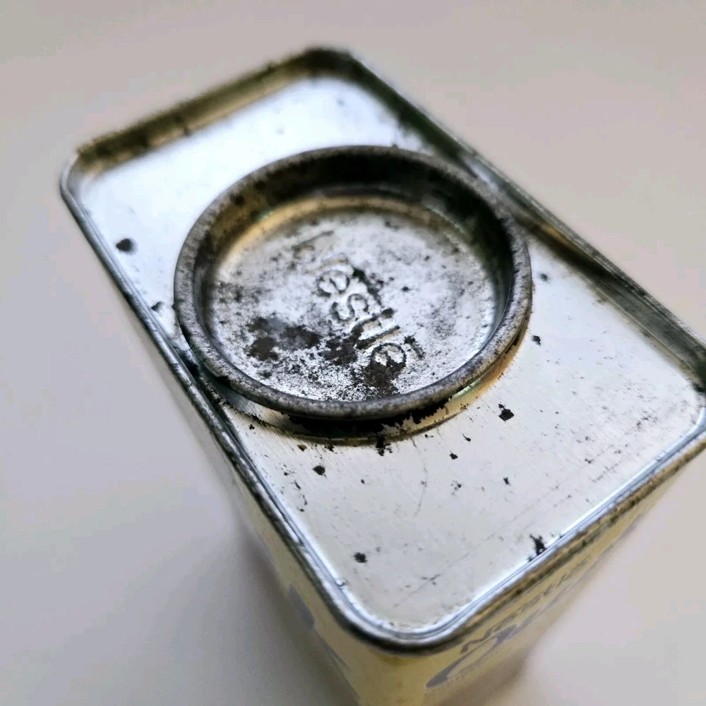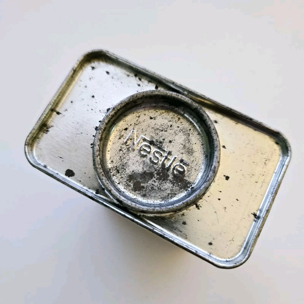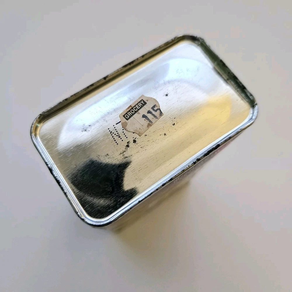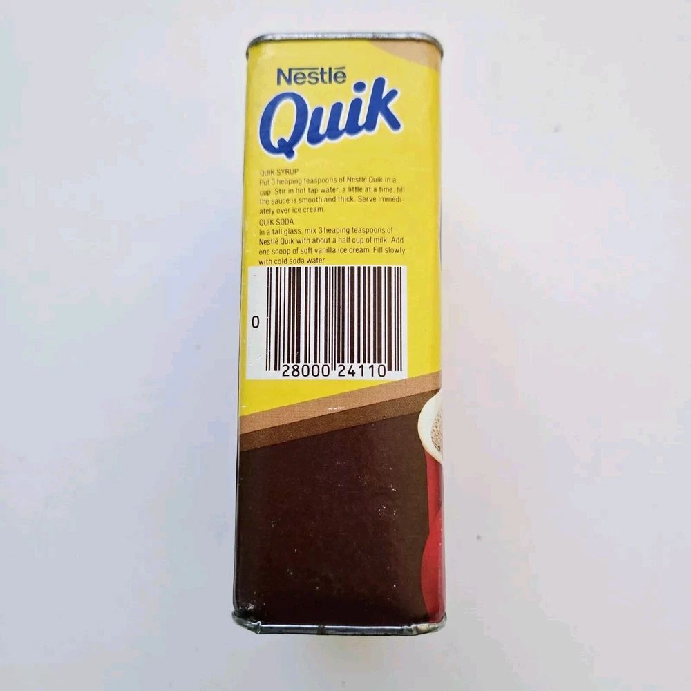 This listing is for a vintage Nestle Quik container. This is an 8 ounce container that measures about 5" tall and 3" wide. It is made of cardboard walls with a tin top and bottom. The back side features the Quik rabbit and a geography state game puzzle. The container is empty and in used condition being sold as a decorative collectible only. It is in decent condition with a few small marks in the artwork and a tiny dent on the right front corner near the bottom of the "K" in Quik. The top and the lid has some rust. See pics for more details.