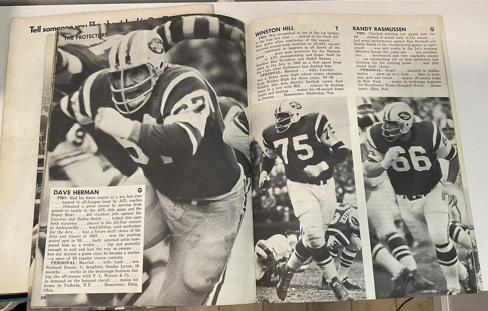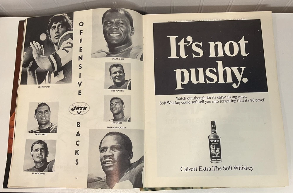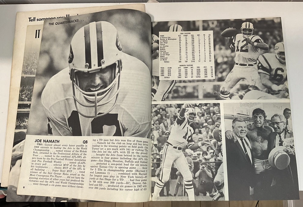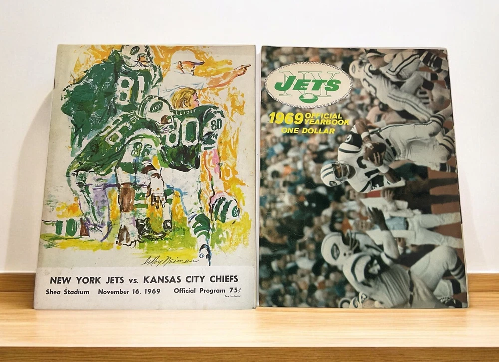 This vintage New York Jets yearbook from 1969 is a must-have for any true football fan. Featuring Joe Namath, the legendary quarterback, on the cover and in a game program, this original piece of sports memorabilia is a rare find. The yearbook is a great addition to any collection, showcasing the team's history and culture during that time. The item was made in the United States and is a true piece of vintage sports history. This lot also comes with a game program from the same 1969 jets season against the KC Chiefs. Both are in good condition with minimal rips and tears.