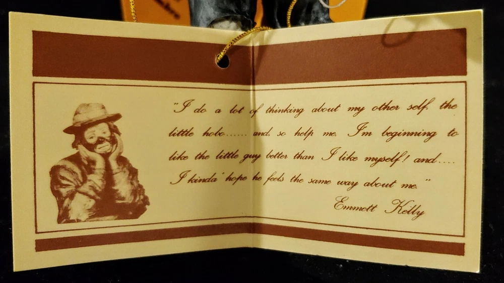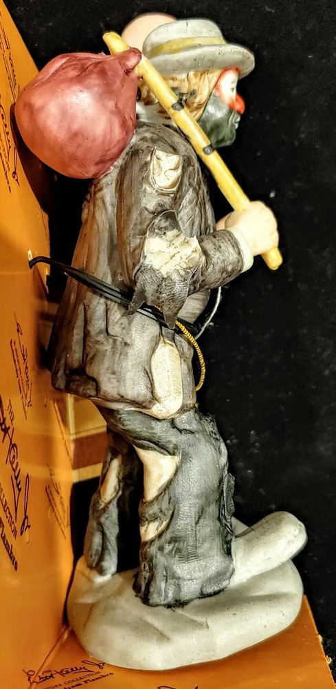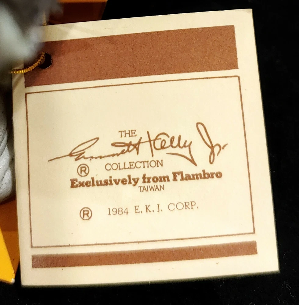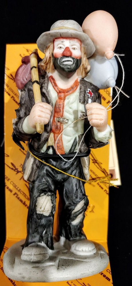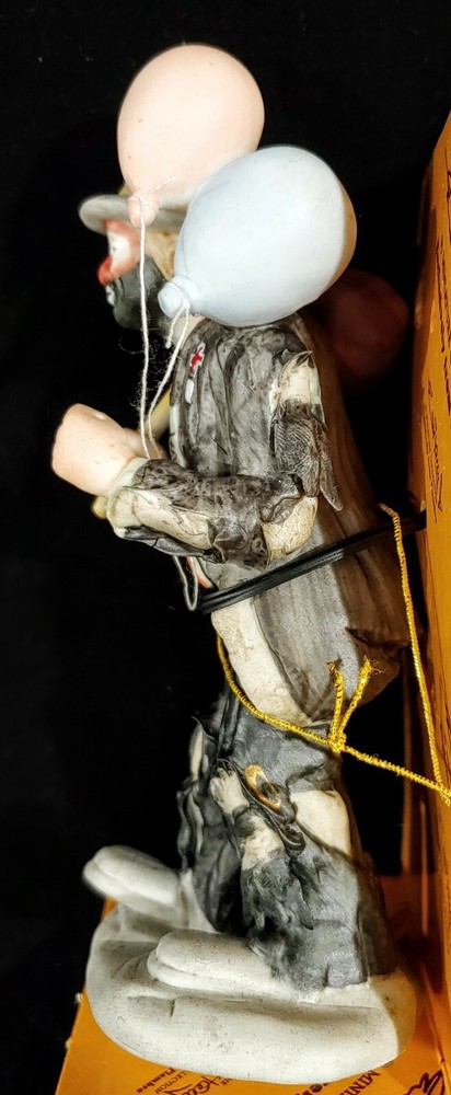 New in box Emmett Kelly Jr. 'Balloons for Sale' figurine Authentic hand painted limited edition, signed and numbered Comes in box with certificate of authenticity Miniature porcelain figurine from The Signature Collection Flambro product Your Emmett Kelly, Jr. Collectible is excellence in fine porcelain achieved by artisans applying their ancient craft heritage. It is distinguished by qualities prized by collectors for investment value. Cherish it among your keepsakes.