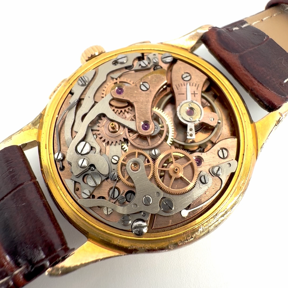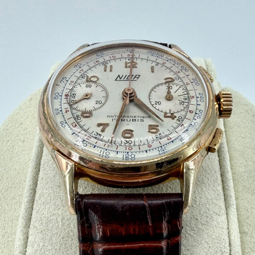 Vintage NIGA Swiss Chronograph Watch – Landeron 51 – Gold Plated – c.1940s–50s Description A handsome vintage Swiss chronograph by Niga, dating to approximately the 1940s–1950s. This classic two-register chronograph is powered by the respected Landeron 51 manual-wind movement and features an attractive multi-scale dial with applied Arabic numerals. The watch is in good working order, winding smoothly and ticking along nicely, with the chronograph starting, stopping, and resetting correctly. A very wearable mid-century chronograph with honest age-related wear. Brand History – Niga Niga was a Swiss watch brand established in the early 1930s in the Jura region of Switzerland, an area long associated with traditional watchmaking. The brand is understood to have been founded by Georges Gagnebin together with his cousin Armand Nicolet, operating under the firm G. Gagnebin & Cie. Drawing on a family watchmaking background, Niga produced a range of mechanical timepieces including wristwatches, chronographs, and pocket watches. Like many independent Swiss marques of the period, the company focused on quality construction and reliable movements rather than mass-market branding. Niga watches were produced into the mid-20th century before the firm ceased operations, a fate shared by many small Swiss houses. Today, original Niga chronographs are relatively scarce and increasingly appreciated by collectors for their authenticity, classic styling, and period-correct Swiss engineering. Movement – Landeron 51 This watch is fitted with the Landeron 51 calibre, a manual-wind chronograph movement introduced in the late 1930s and widely used throughout the 1940s and early 1950s. The Landeron 51 is an early cam-switched chronograph and represents an important development in chronograph design, offering robust construction and easier servicing compared to earlier column-wheel movements. Landeron supplied chronograph movements to a wide range of Swiss brands, and their calibres are now firmly established as collectable movements in their own right. Dial Signed “NIGA” Marked “Antimagnetique”, “17 Rubis”, “Swiss Made” Two subsidiary registers Multi-scale outer track Dial and hands in excellent condition with light, even patina Case Gold plated case showing wear to the plating, consistent with age Stainless steel back with visible pitting Pushers and crown operate correctly Crystal & Strap Crystal in excellent condition Fitted with a leather strap Dimensions Diameter (excluding crown): 35.6mm Width (including crown): 37.8mm Lug to lug: 43.2mm Lug width: 18mm Thickness: 11.3mm Condition In good working order Winds and ticks along nicely Chronograph functions correctly Case shows cosmetic wear and plating loss Stainless steel back with pitting Dial and crystal in excellent condition Summary A well-preserved mid-century Swiss chronograph by Niga, powered by the dependable and collectable Landeron 51 movement. With its clean dial, fully functioning chronograph, and documented brand heritage, this watch represents an excellent and increasingly desirable vintage timepiece. As usual, this item will be packaged carefully and dispatched with tracking. International shipping is available through the eBay Global Shipping Programme (GSP). Important notes about vintage watches This is a vintage mechanical watch. While it is currently running and the chronograph functions correctly, accuracy and long-term reliability cannot be guaranteed. Service history is unknown, and a service is recommended for regular use. The watch is sold as a vintage collectible rather than a modern timepiece.