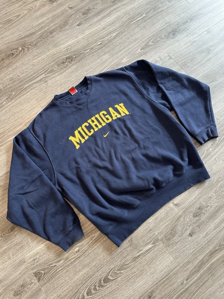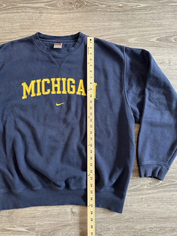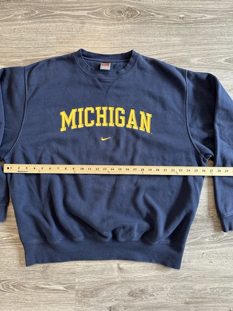 Embrace the nostalgia with this Vintage Y2K Nike Michigan NCAA Crewneck Sweatshirt. A true testament to the early 2000s sportswear, it features a classic check pattern in a striking blue hue, complemented by the iconic Nike embroidery. The long-sleeve pullover design offers a relaxed fit for all-day comfort, making it a versatile addition to any wardrobe. Crafted from a cozy cotton blend with a soft fleece fabric type, this sweatshirt is perfect for a range of activities, from casual outings to college sports events. Its crew neck and embroidered accents bring a timeless collegiate vibe, while the all-season feature ensures it's suitable no matter the weather. Whether you're a basketball fan or just looking for a retro fashion piece, this sweatshirt hits the mark. Measurements shown in photos.
