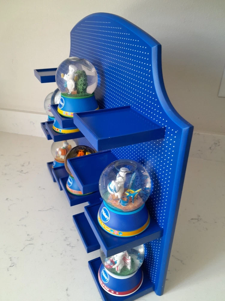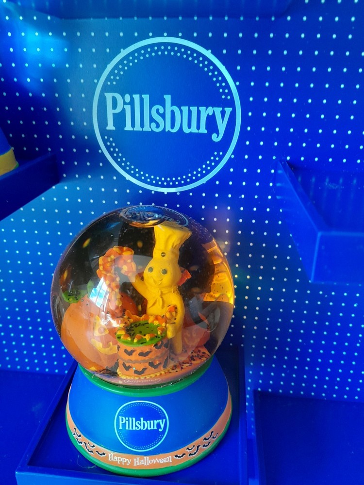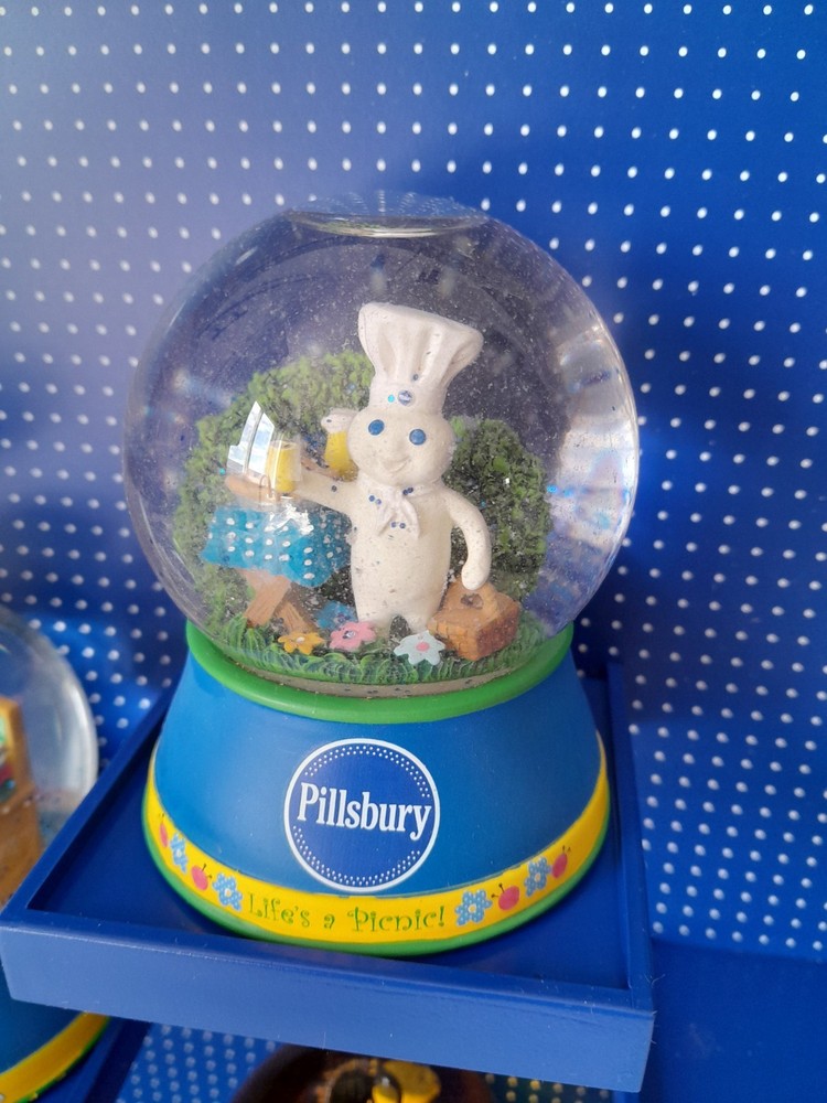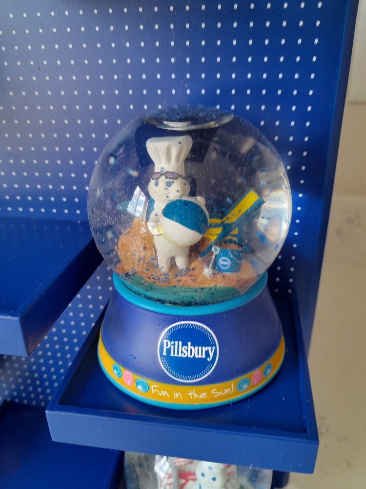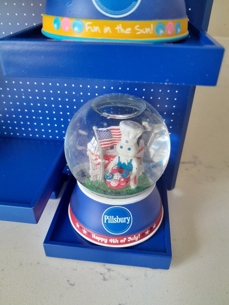 The Rare NOS Willabee & Ward Pillsbury Dough Boy Holiday Snow Globe Display features 7 multicolor snow globes depicting the iconic Pillsbury Dough Boy character in a festive holiday theme. This medium-sized set is complete with a display shelf, making it a perfect addition for adults who are collectors of holiday and seasonal decor. With a discontinued and retired status, this original advertising piece from the 2010-2019 time period is a unique and nostalgic find for fans of the Pillsbury brand. New in Box. Stand or wall hanging