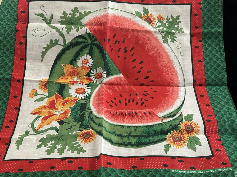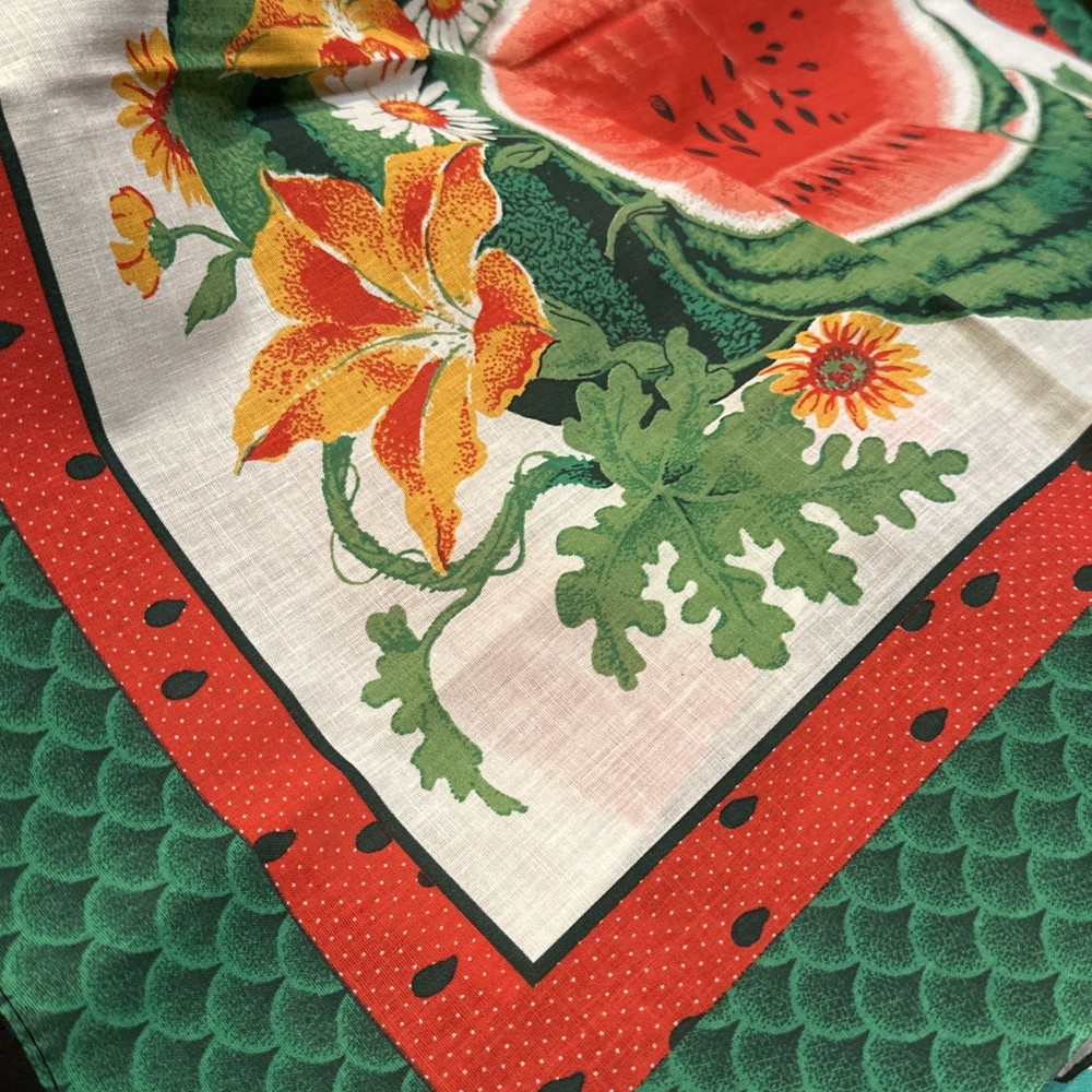 This is a vintage bandana with a watermelon design, made from a poly/cotton blend fabric. It measures 22" x 22" and features a nature character. The bandana can be used as a neck warmer, face mask, and scarf, making it a multifunctional accessory. It is suitable for unisex use and can be worn during any season. The exciting watermelon plant design makes it a unique piece to add to your collection. This bandana is new without tags and was made in the United States. What a great Mother’s Day gift this will make, especially for the mom who enjoys planting and growing watermelon!