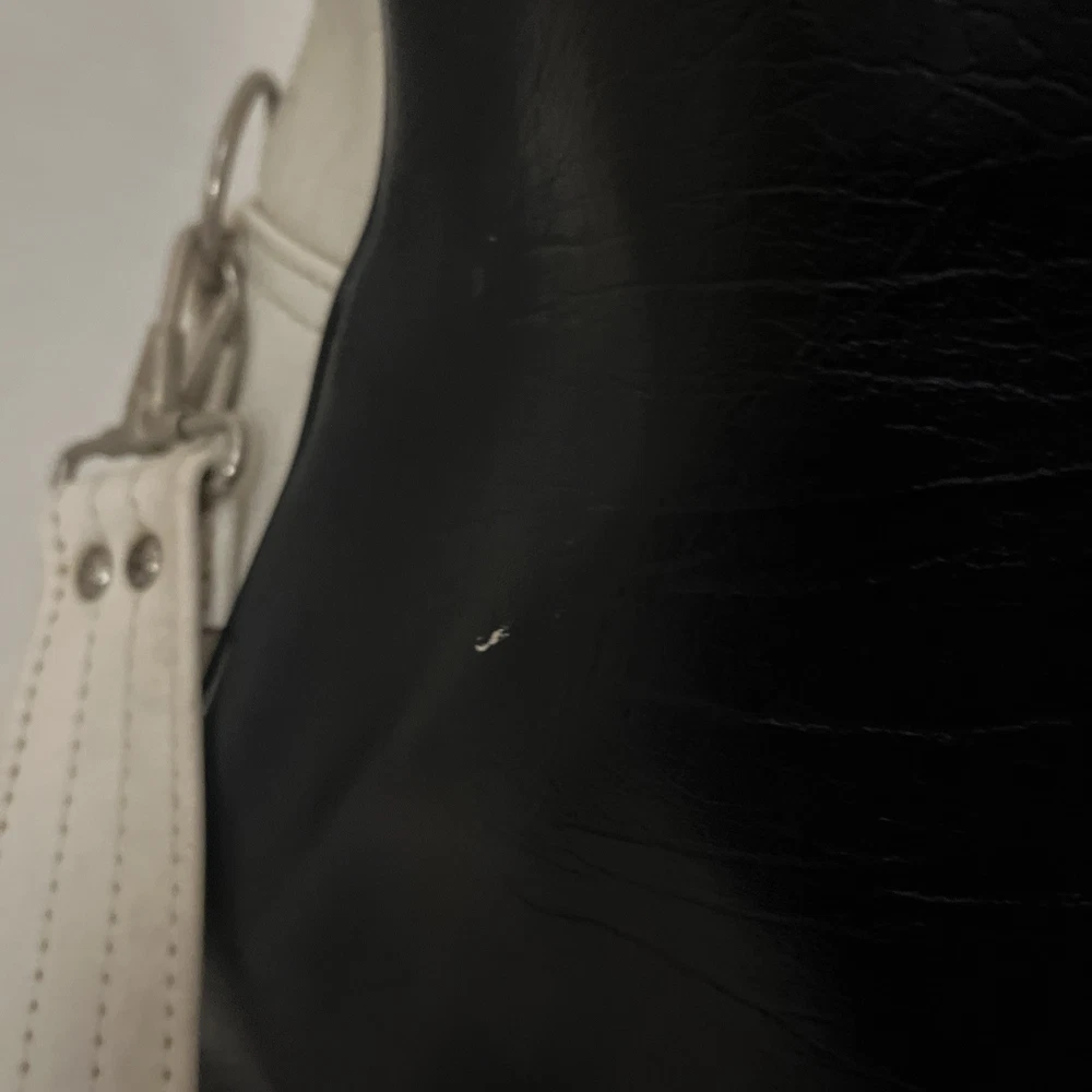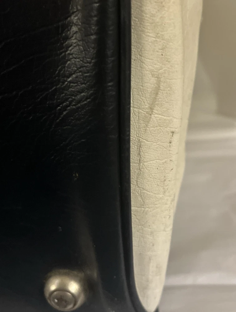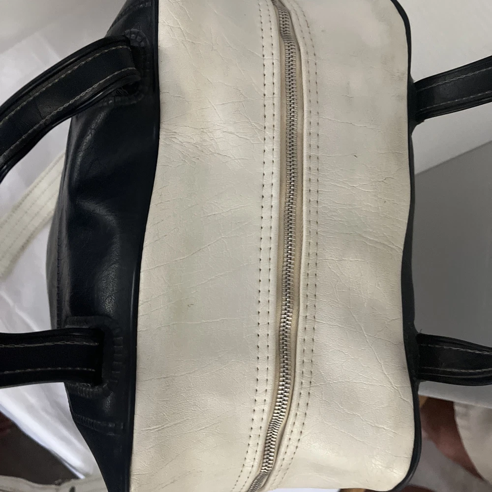 This is a vintage New York large vinyl carry-on bag manufactured by Airline Textile Manufacturing Company. It features a classic design and ample storage space for travel essentials. The bag is durable and ideal for short trips or as a carry-on for flights. There are signs of normal use . With a few scuff marks and a tiny tear that can be seen in the second to last picture.