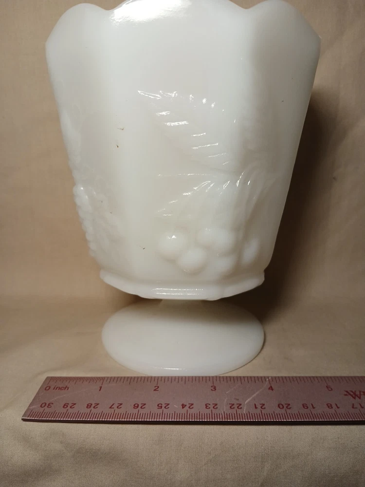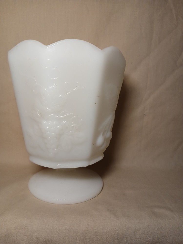 The Vintage Napco Cleveland OH USA 1186 White Milk Glass Vase is a charming collectible piece with a beautifully intricate grape pattern design. Made of high-quality glass in a classic white color, this vase adds a touch of elegance to any space. This piece is a unique addition to any collection, showcasing the craftsmanship and design of the Napco brand from Cleveland, Ohio.
