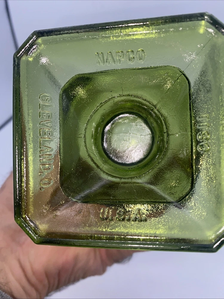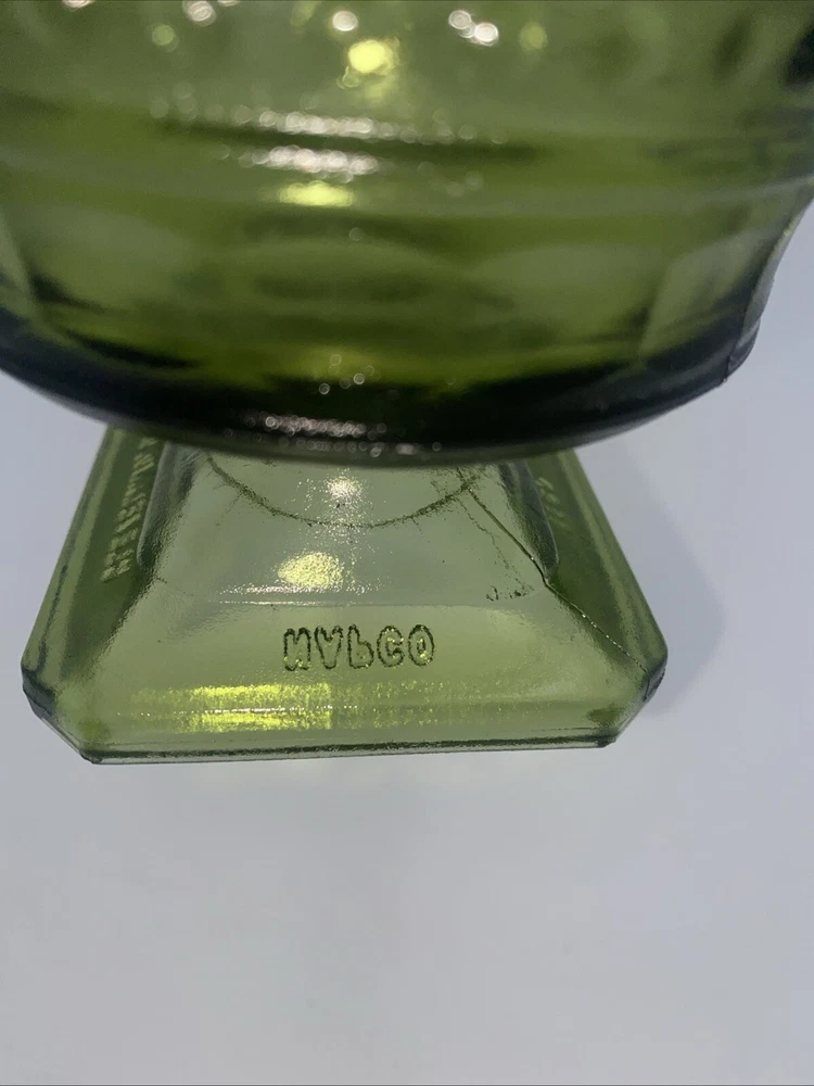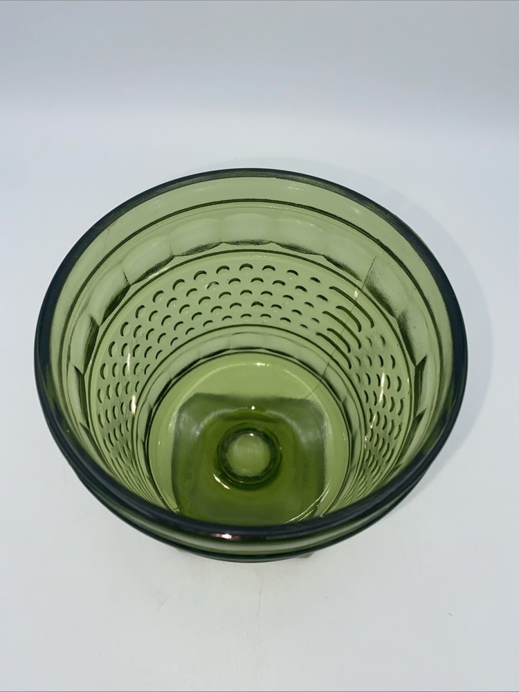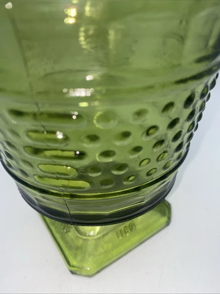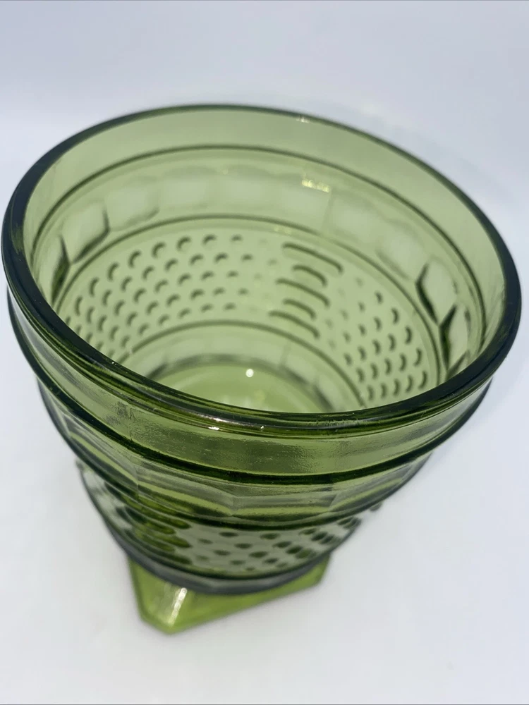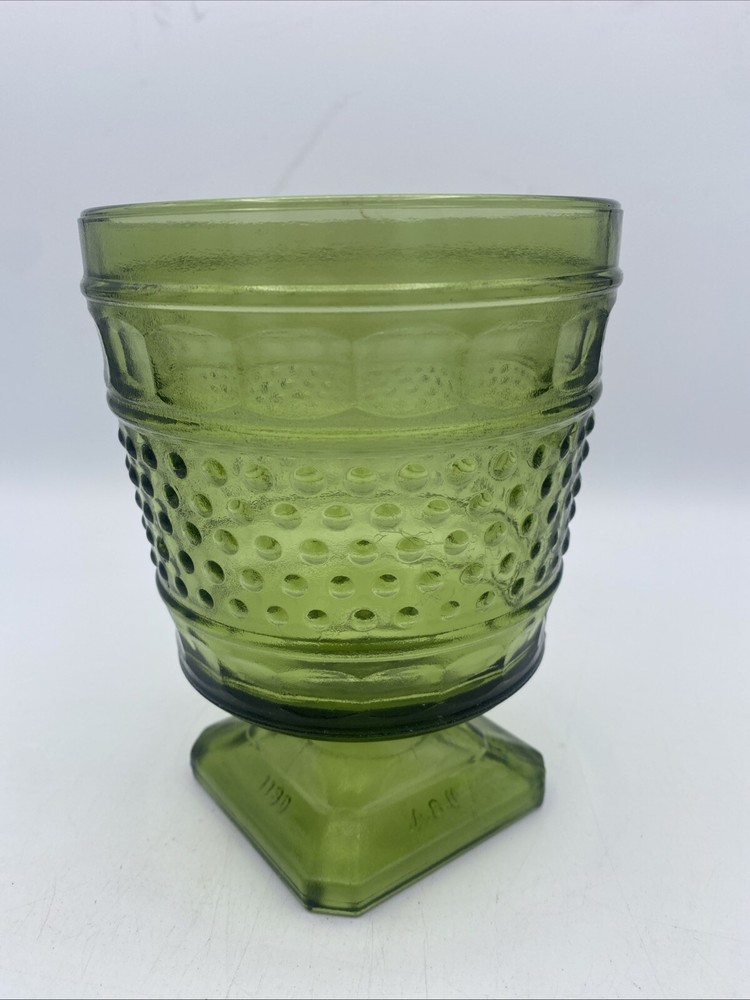 This is a vintage Napco footed planter vase from Ohio, USA. It features a hobnail pattern in green glass, round shape, and stands at 5.5 inches in height. The vase is free-standing, with a width of 4 inches. The model number is 0811, and it is part of the brand Napco. This piece would be a charming addition to any room decor.