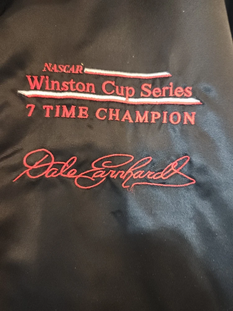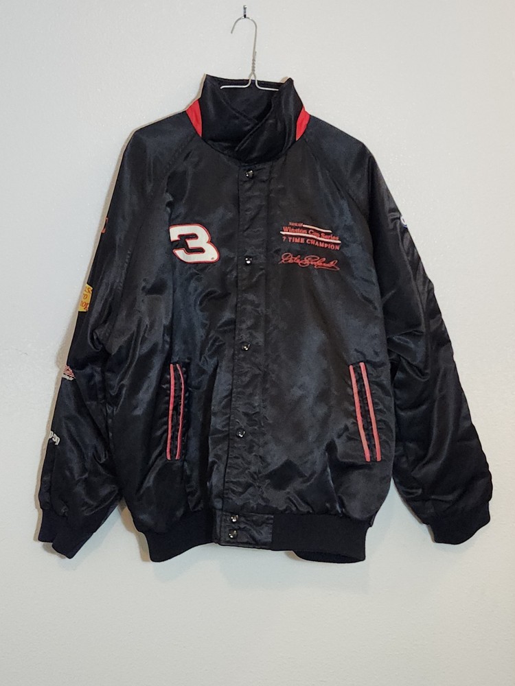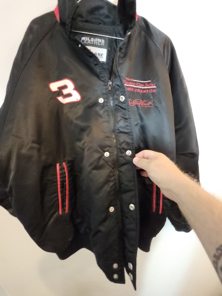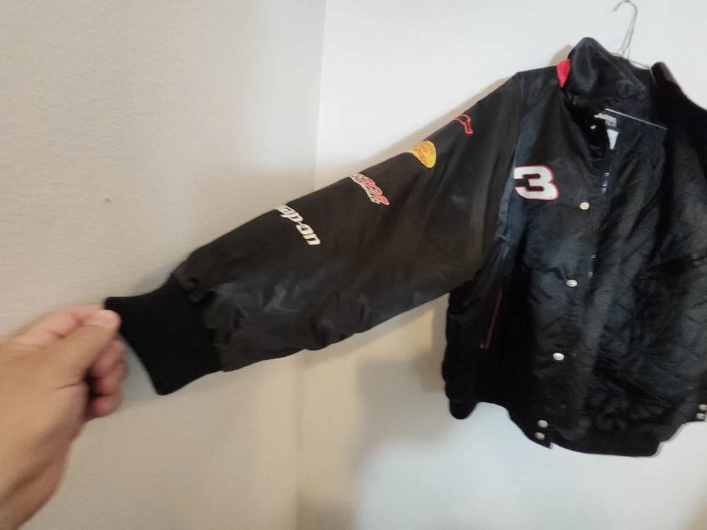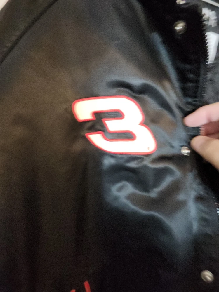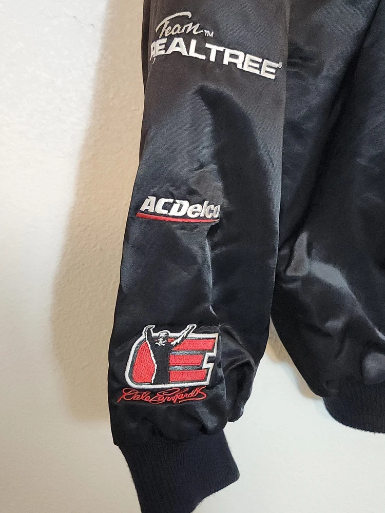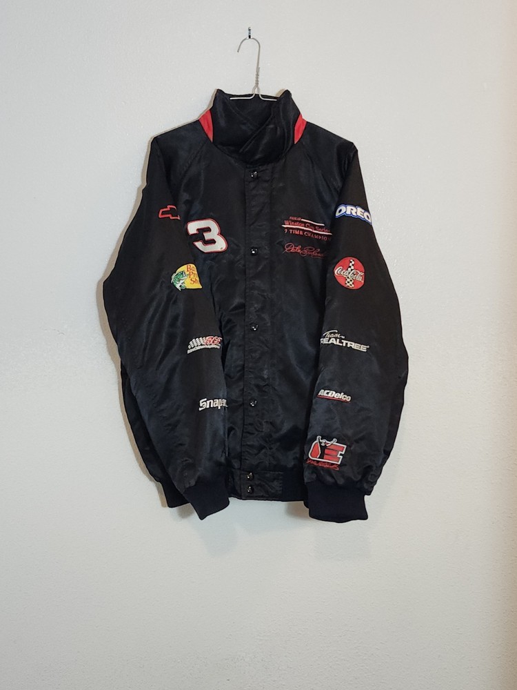 Show off your NASCAR fandom with this rare and limited edition Dale Earnhardt #3 "The Intimidator" satin black bomber jacket. The jacket features embroidered logos of NASCAR, RCR, and Chevrolet, along with other sponsors such as AC Delco, Realtree, Coca Cola, and OREO. The jacket is made of nylon and polyester, with a classic fit and short length. This jacket is perfect for all seasons, with features such as an elastic waist, pockets, and wind resistance. It is machine washable and has a button-up front with a button-up over zipper. This vintage jacket is a must-have for any NASCAR or 90s sports fan, and is a great addition to any collection. Size XL with zipper and buttons and 2 inside pockets as shown in pictures Last sold $149