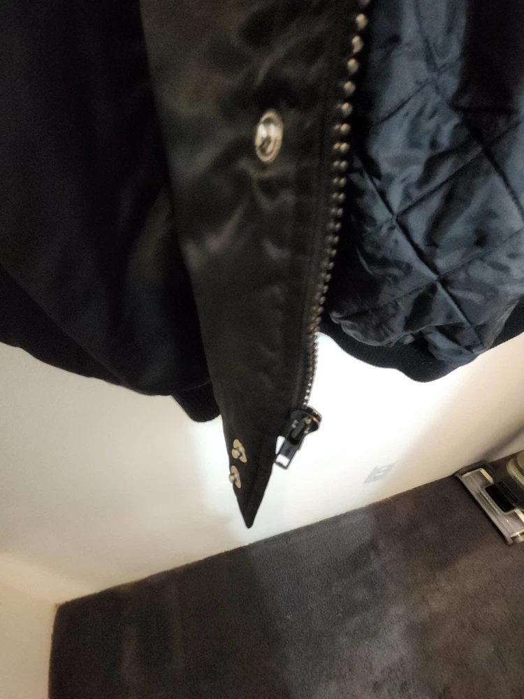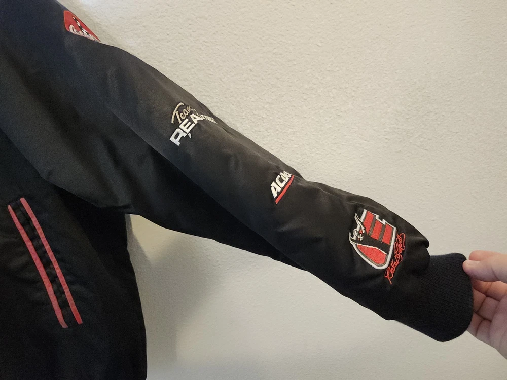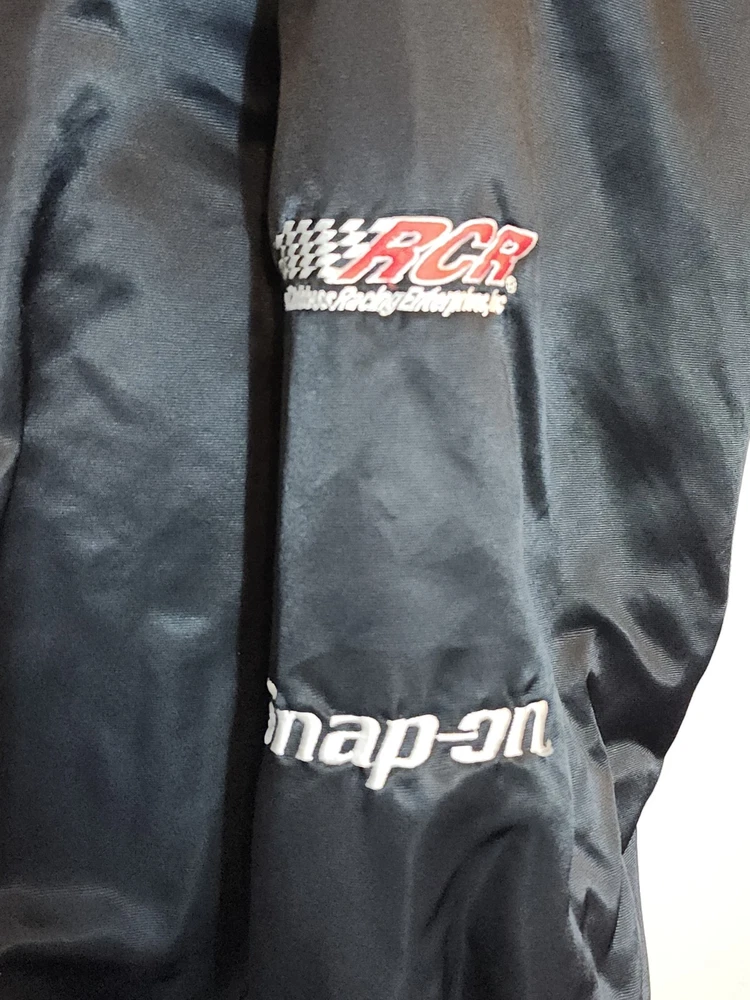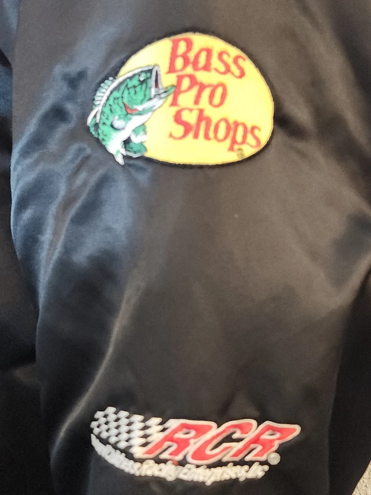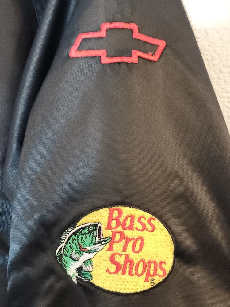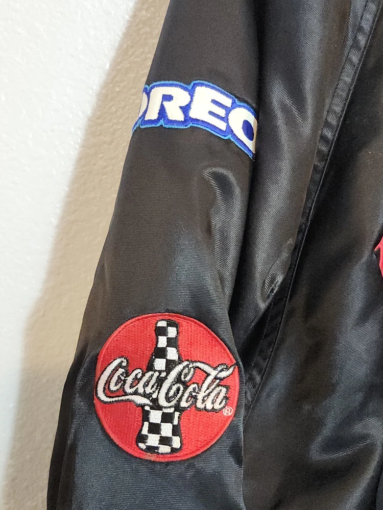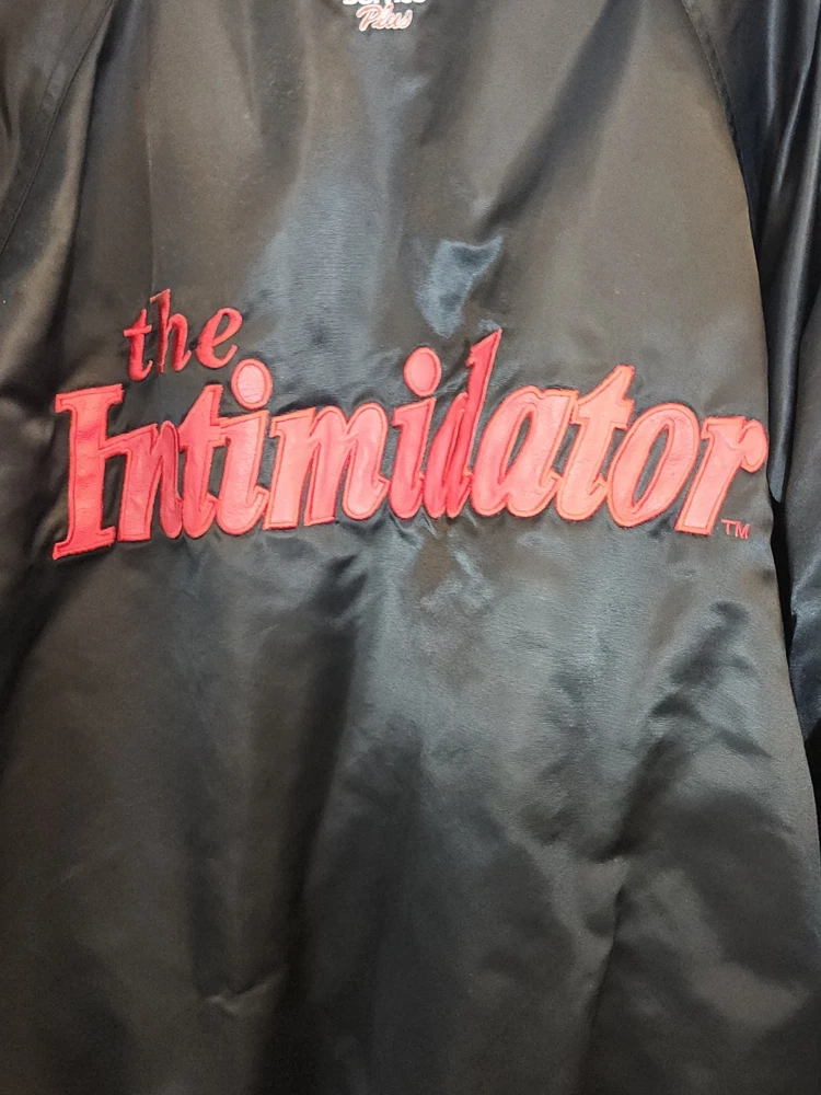 Show off your NASCAR fandom with this rare and limited edition Dale Earnhardt #3 "The Intimidator" satin black bomber jacket. The jacket features embroidered logos of NASCAR, RCR, and Chevrolet, along with other sponsors such as AC Delco, Realtree, Coca Cola, and OREO. The jacket is made of nylon and polyester, with a classic fit and short length. This jacket is perfect for all seasons, with features such as an elastic waist, pockets, and wind resistance. It is machine washable and has a button-up front with a button-up over zipper. This vintage jacket is a must-have for any NASCAR or 90s sports fan, and is a great addition to any collection. Size XL with zipper and buttons and 2 inside pockets as shown in pictures Last sold $149