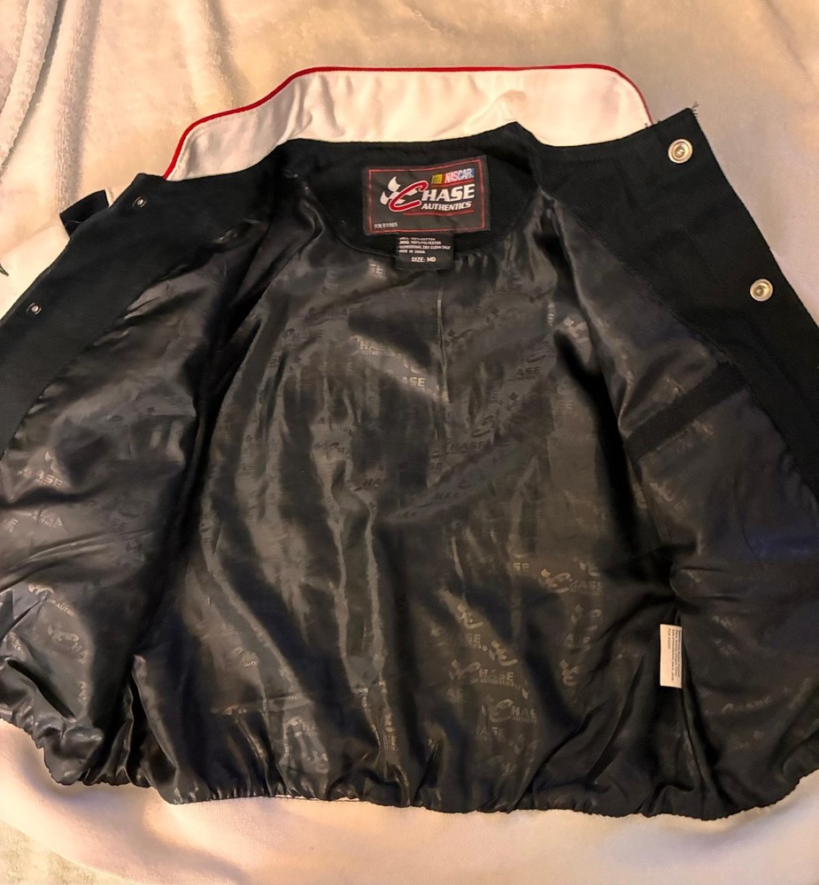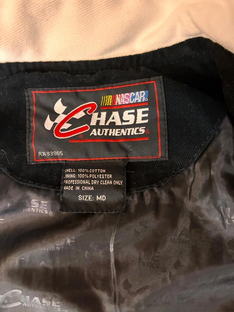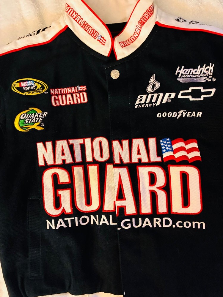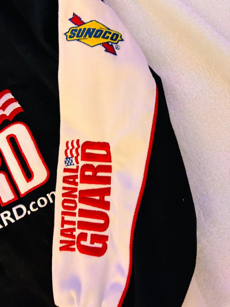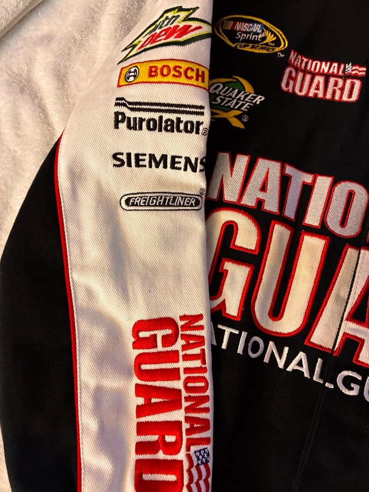 This Vintage Nascar Youth Racing Jacket is a colorful and nostalgic piece perfect for any young racing fan. Made from 100% cotton with a polyester insulation material, this long sleeve bomber jacket features an embroidered logo of the National Guard edition. The jacket has a button closure, solid pattern, and is adorned with racing car graphics, making it a fun and stylish outerwear option for casual occasions in the winter, fall, or spring. The jacket also includes pockets and a collared neckline, adding both functionality and style to this retro garment from Chase Authentics.