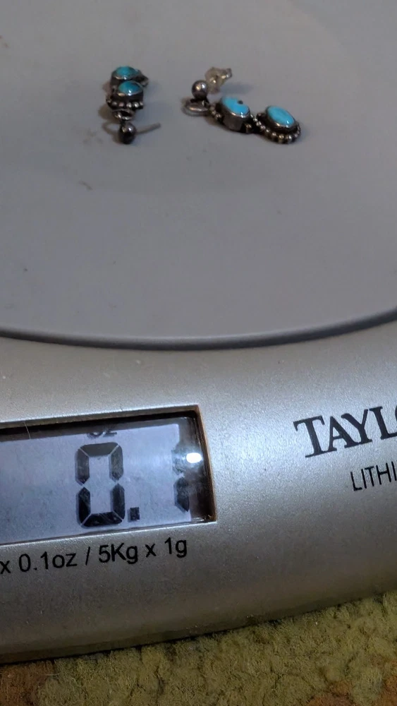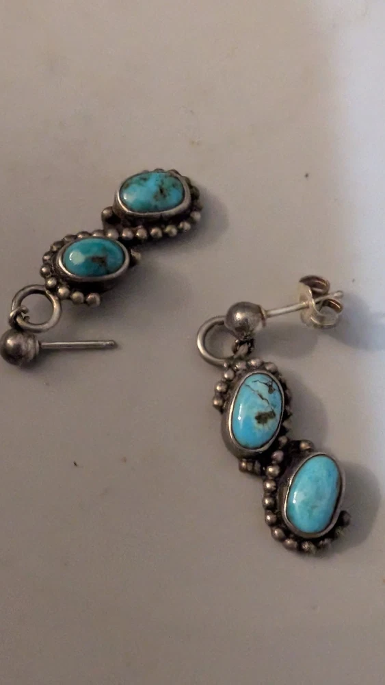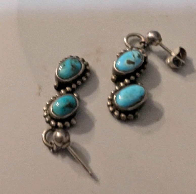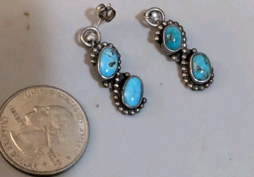 Authenticity: Handcrafted vintage Native American jewelry. Gemstones: Four total turquoise cabochons with vibrant blue hues and light matrixing. Silver Work: Delicate beaded "raindrop" borders and serrated bezels. Closure: Secure post/stud backs (includes silver-tone butterfly clutches). Size: Dainty 1-inch drop, perfect for daily wear. Condition: Pre-owned vintage. The silver has aged beautifully with a dark patina that highlights the turquoise. Note: Lightly cleaned but left in original vintage state for collectors.