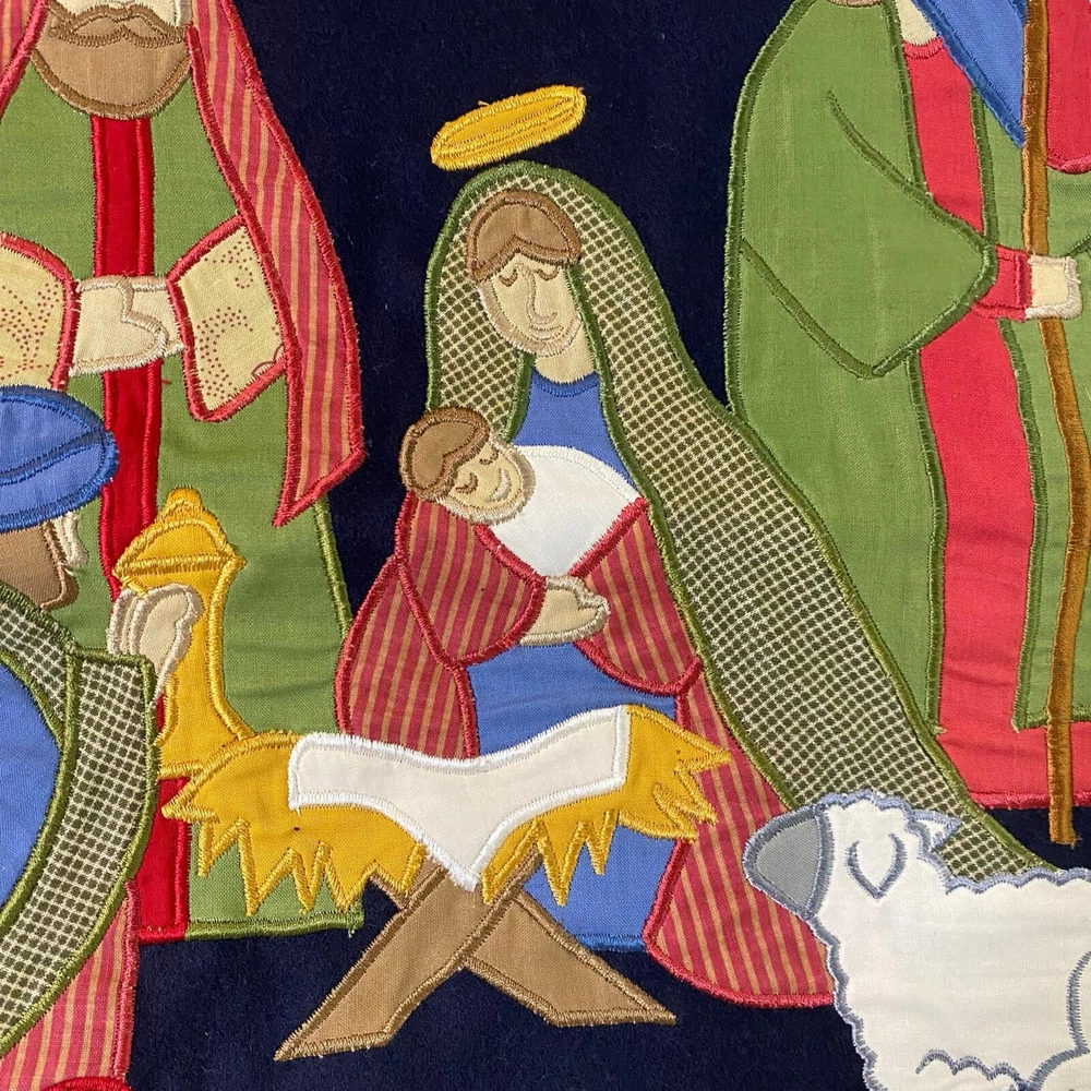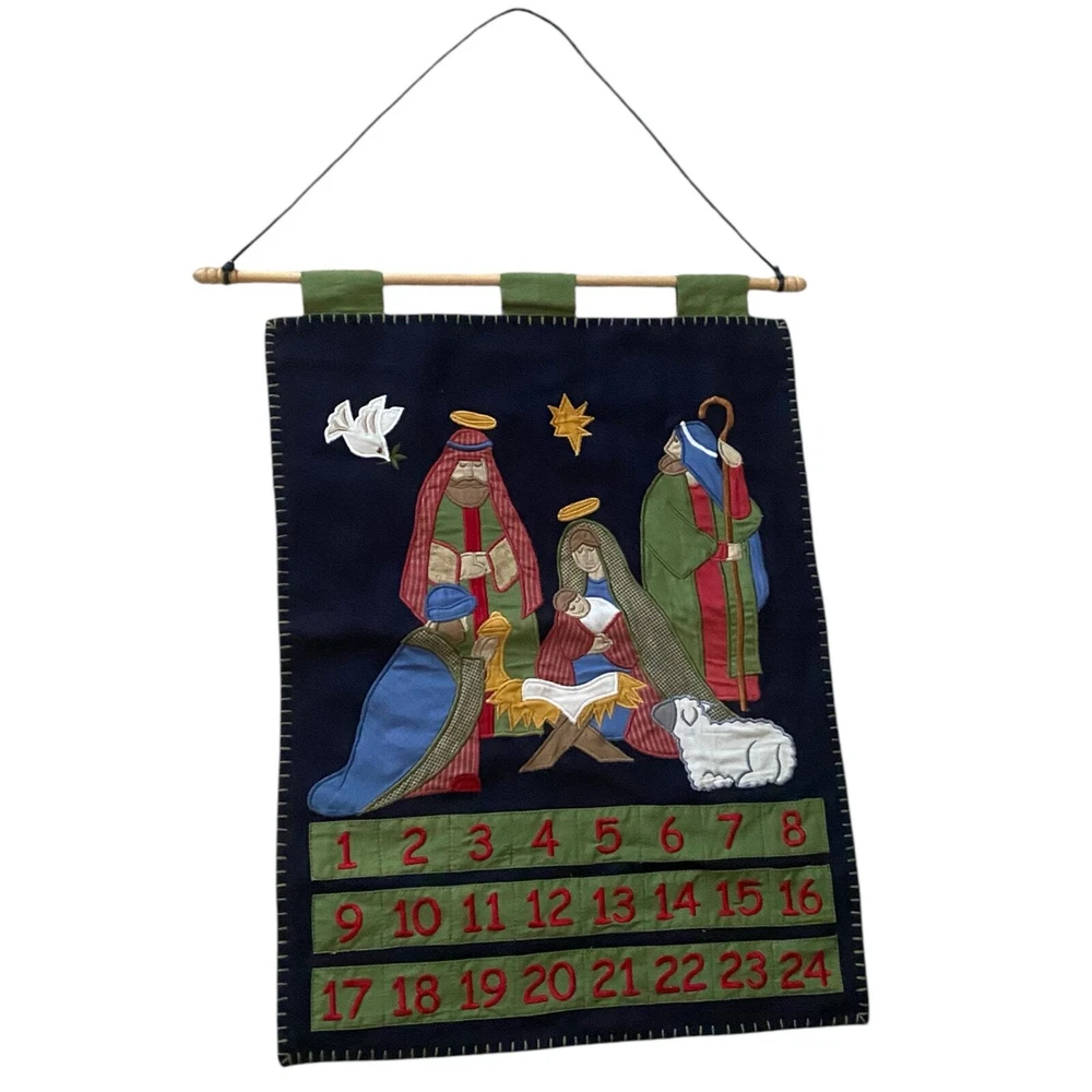 Vintage Nativity Scene Fabric Pocket/Bag Advent Calendar Wall Decor Beautiful embroidered Nativity advent wall hanging calendar. Cotton fabric. Vibrant colors. Lightly used. Color in pics may vary due to lighting and/or monitor settings APPROX. MEASUREMENTS: 16" Wide 21" Tall SHOP POLICIES * All items ship within 1-3 business days (I always try to ship by next business day) * This item is used vintage/pre-loved * Any defects (if any) are noted and shown in the photos * All sales are final * Please review the description/pictures and ask questions before purchasing