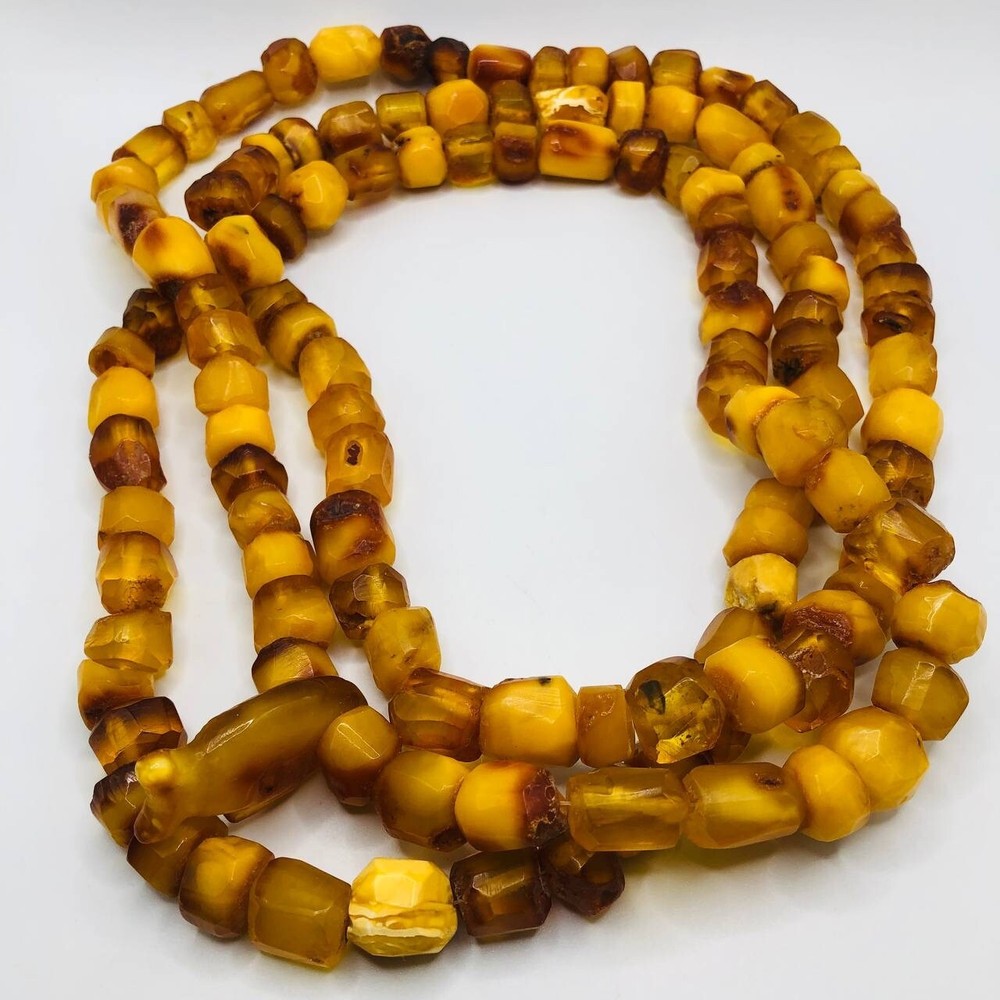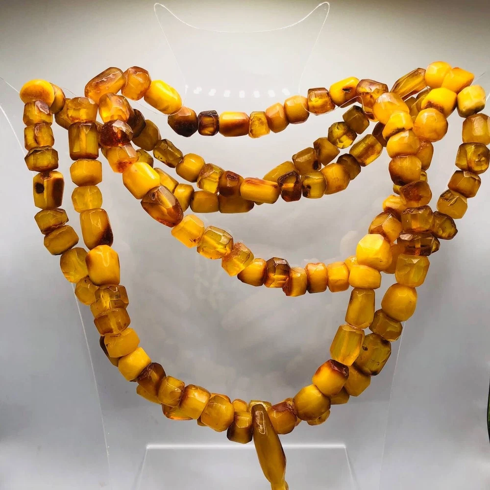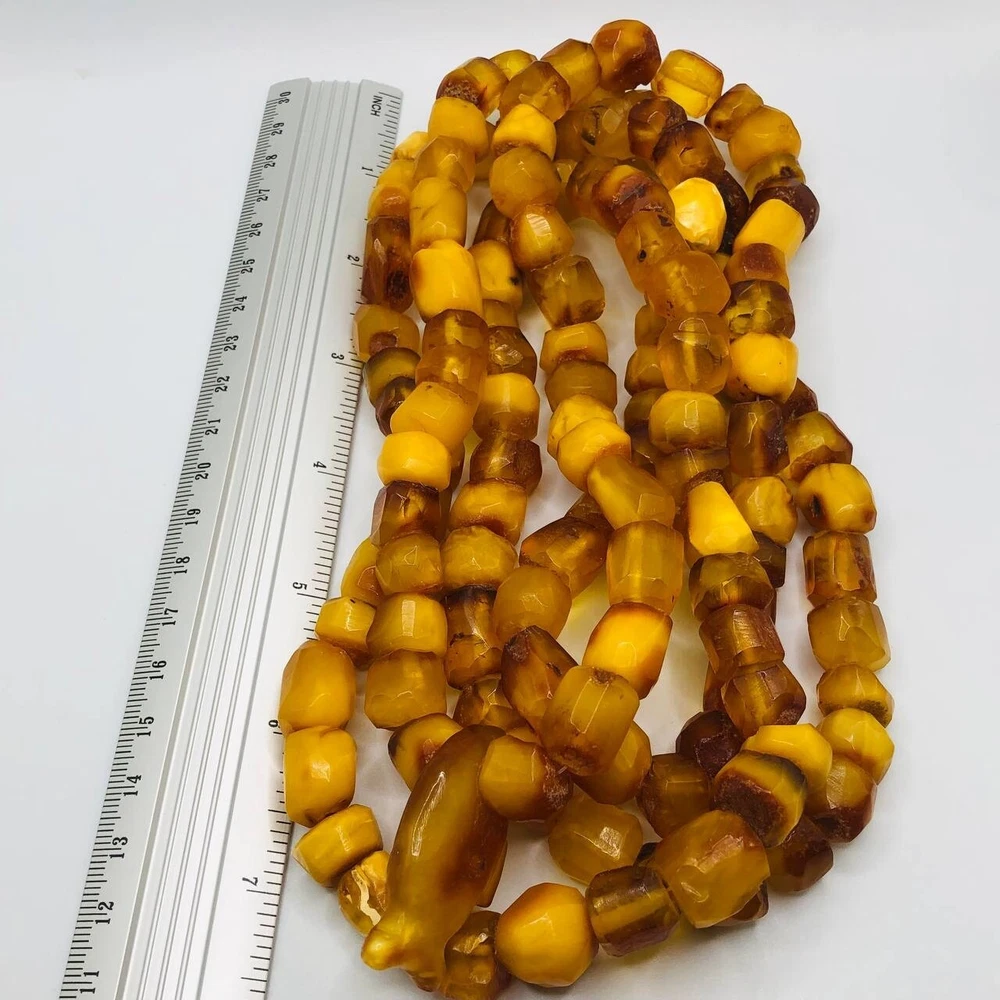 This is a vintage Soviet-era necklace made of natural Baltic amber beads in shades of egg yolk and butterscotch. The necklace features a beaded design with a multicolor main stone shape. It is a handmade piece with a bead type, showcasing the beauty of nature in a retro ethnic style. The necklace weighs 158 grams and is a unique piece of fine jewelry perfect for occasions like Mother's Day, Christmas, birthdays, or Valentine's Day.