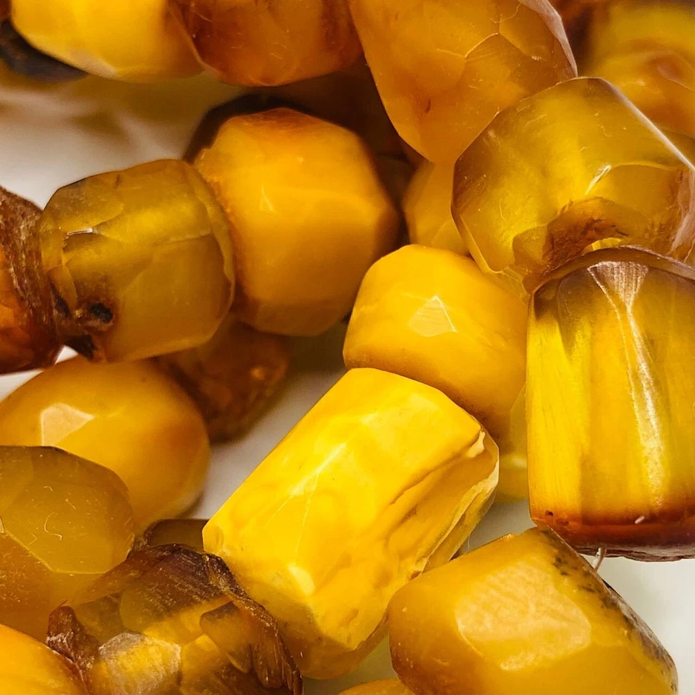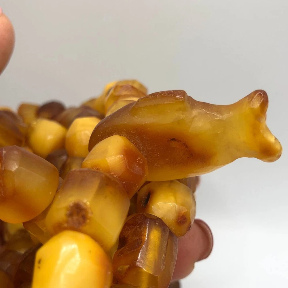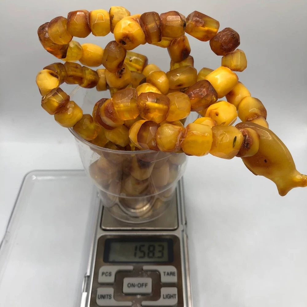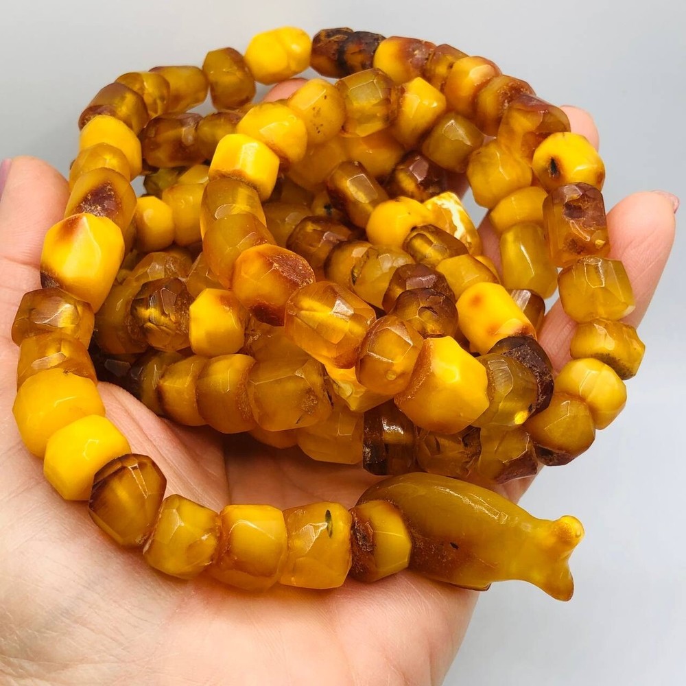 This is a vintage Soviet-era necklace made of natural Baltic amber beads in shades of egg yolk and butterscotch. The necklace features a beaded design with a multicolor main stone shape. It is a handmade piece with a bead type, showcasing the beauty of nature in a retro ethnic style. The necklace weighs 158 grams and is a unique piece of fine jewelry perfect for occasions like Mother's Day, Christmas, birthdays, or Valentine's Day.