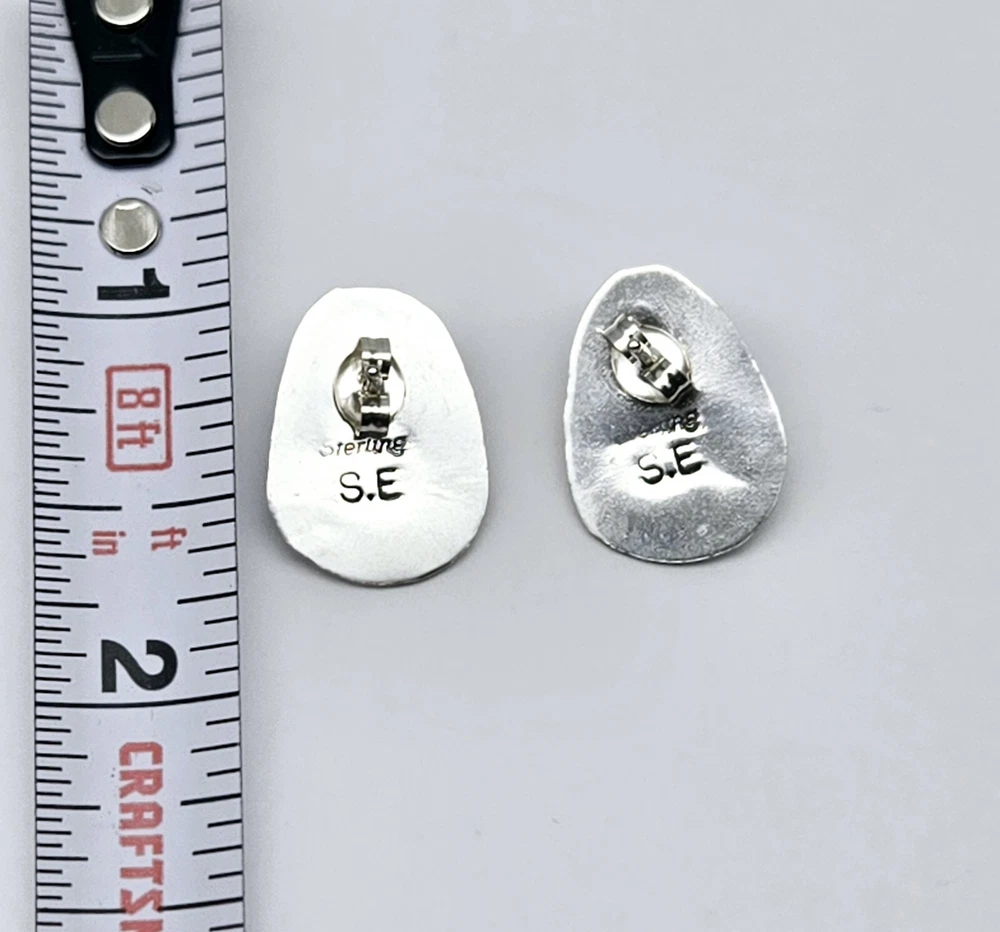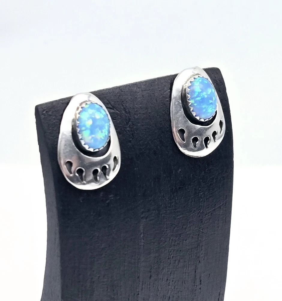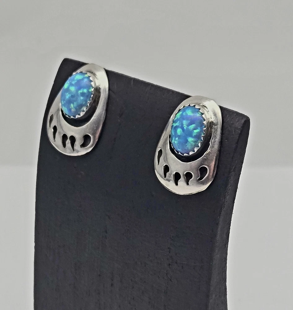 Vintage Navajo 'S.E.' Sterling Silver Blue Opal Bear Paw Post Earrings - 3.6g