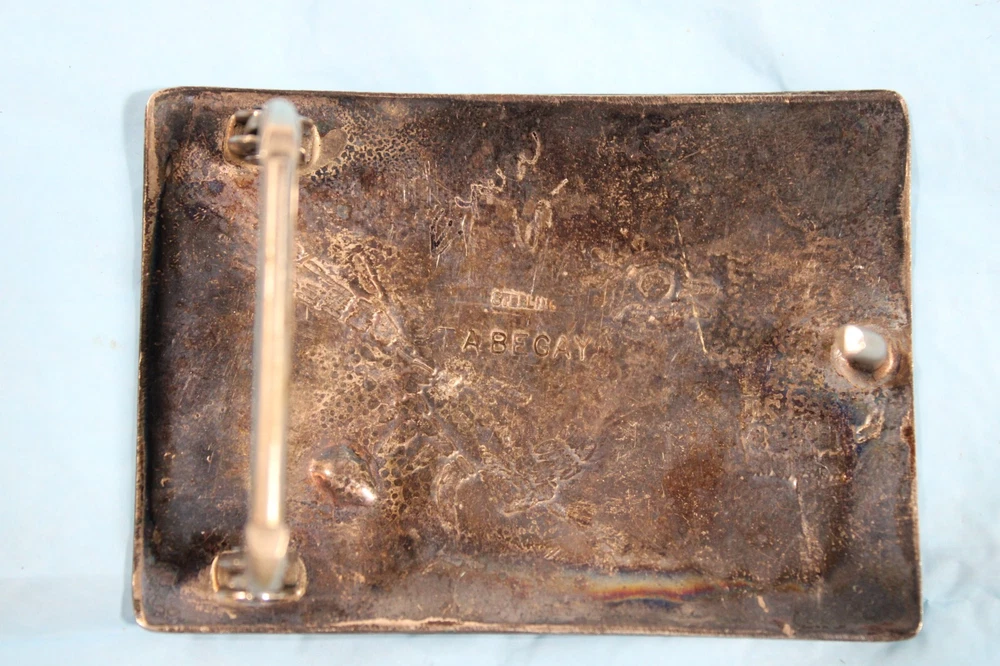 Marked on back Sterling and T A Begay. 2.5 by 1.75 inches. Front features typical Arizona theme with Roadrunner and Saguaro cactus. Not polished, untouched as found. No dents.