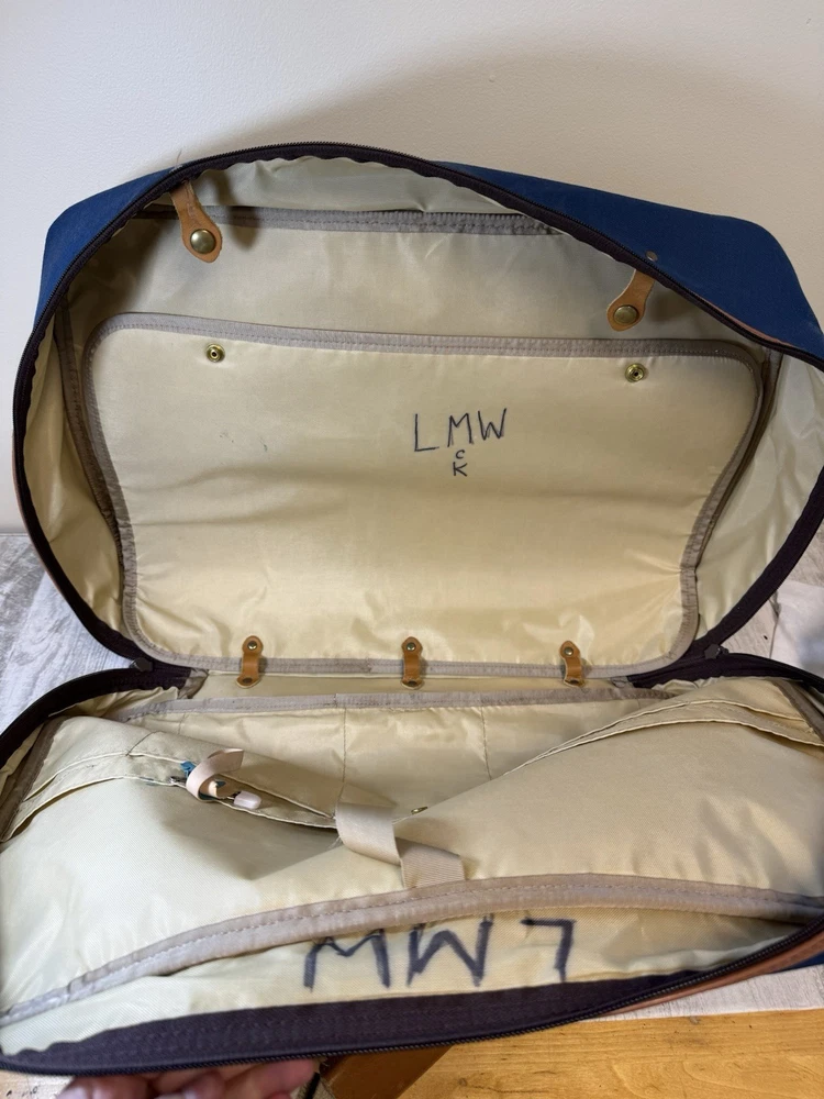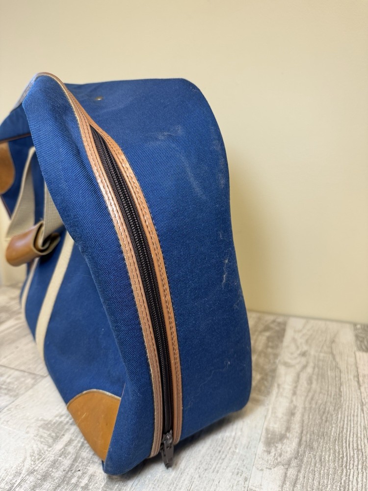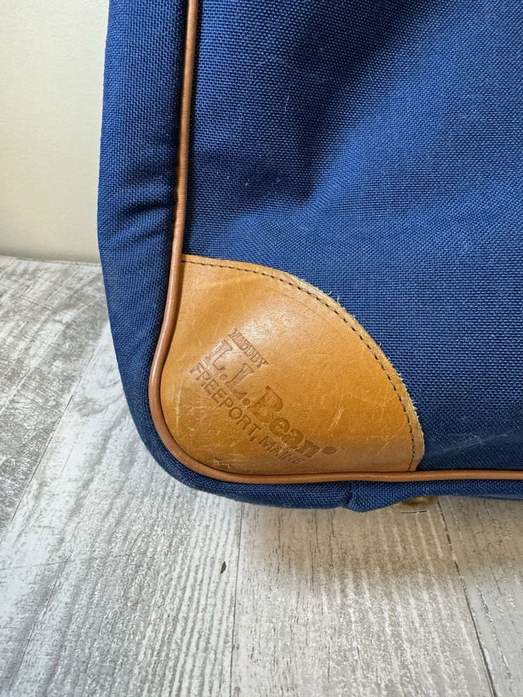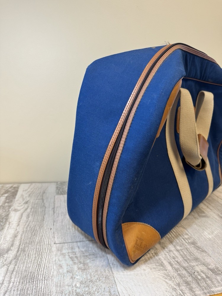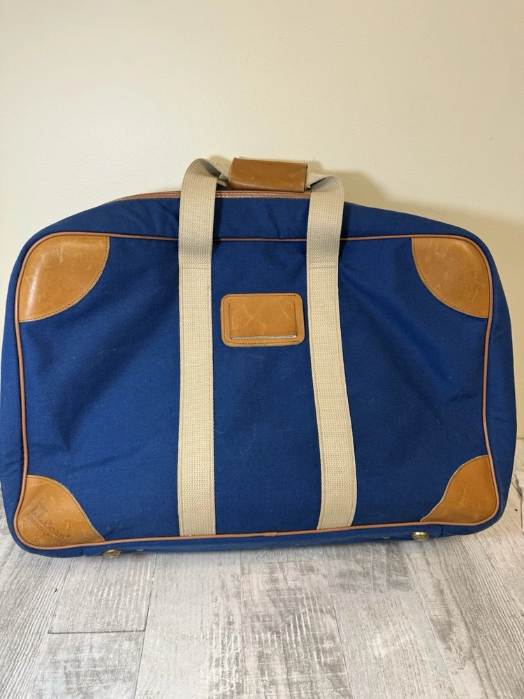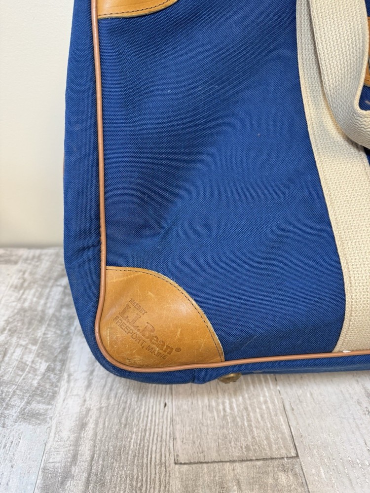 The LL Bean Vintage Navy Blue Canvas and Leather Extra Large Freeport Boat & Tote is a durable and spacious suitcase designed for travel. Made with high-quality leather and adjustable straps, this suitcase offers both style and functionality. The navy blue color adds a classic touch to the overall design, making it a versatile choice for any trip. With dimensions of 26x18x9 inches, this suitcase provides ample room for all your belongings while maintaining a sleek and portable silhouette. Ideal for those who value both style and practicality in their luggage choice.