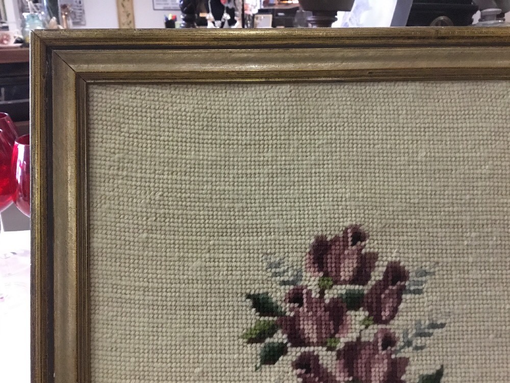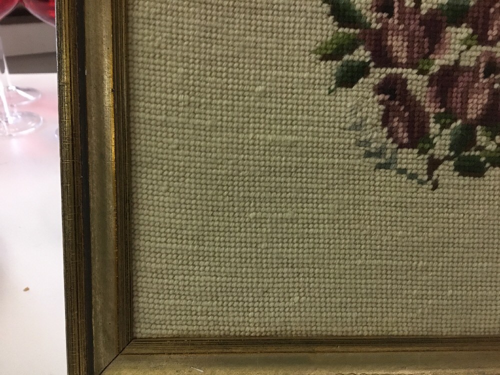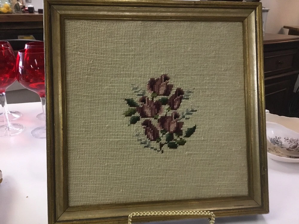 For your consideration, a beautiful 15 x 15 square, full needlepoint picture.....Variated colors of lavender roses. In excellent condition, see my pics for condition & details. Frame is wood with crackled finish. Shipping is a flat $10.99 to continental US. All sales are final. Thanks, Tina Inventory code #1577 Love other items in my store? I will gladly combine shipping Thanks for looking....Tina