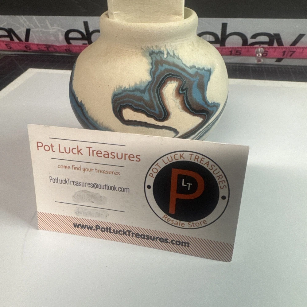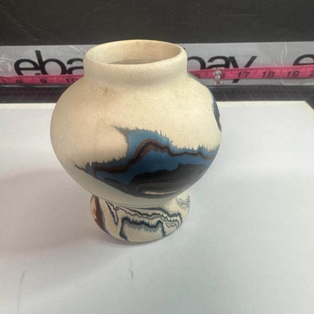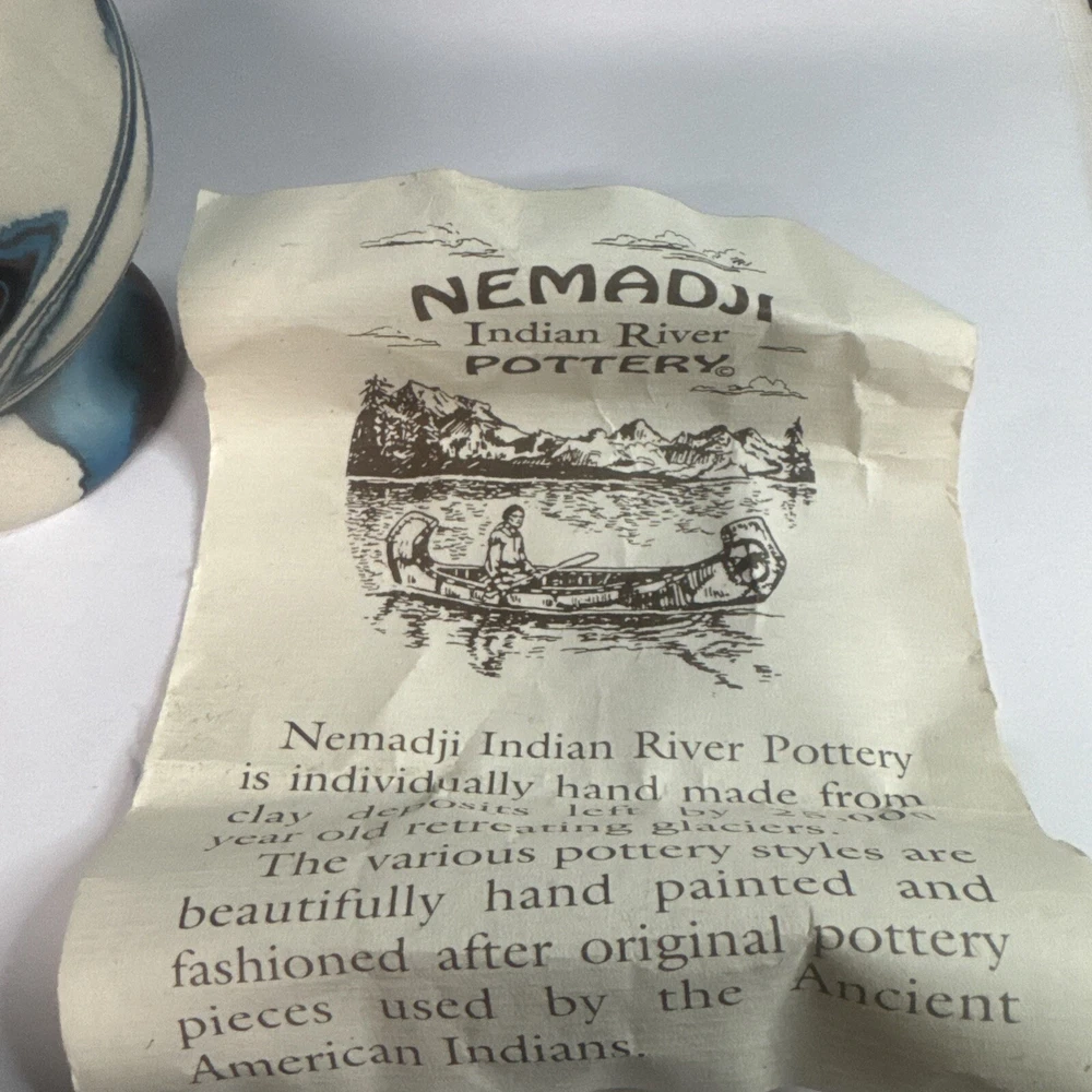 This Vintage Nemadji Indian Pottery Vase is a stunning piece of handmade art pottery from the United States. The vase features swirling earth tone colors and an abstract art subject. The matte finish and folk & indigenous style make it a perfect addition to any home decor. The vase is an original piece and was produced using traditional pottery techniques. It is made of high-quality clay material and has a unique and colorful theme. This vintage vase is perfect for those who appreciate the beauty and artistry of North American pottery. Please see photos for condition and what’s included. Please feel free to contact us with any questions before purchasing.