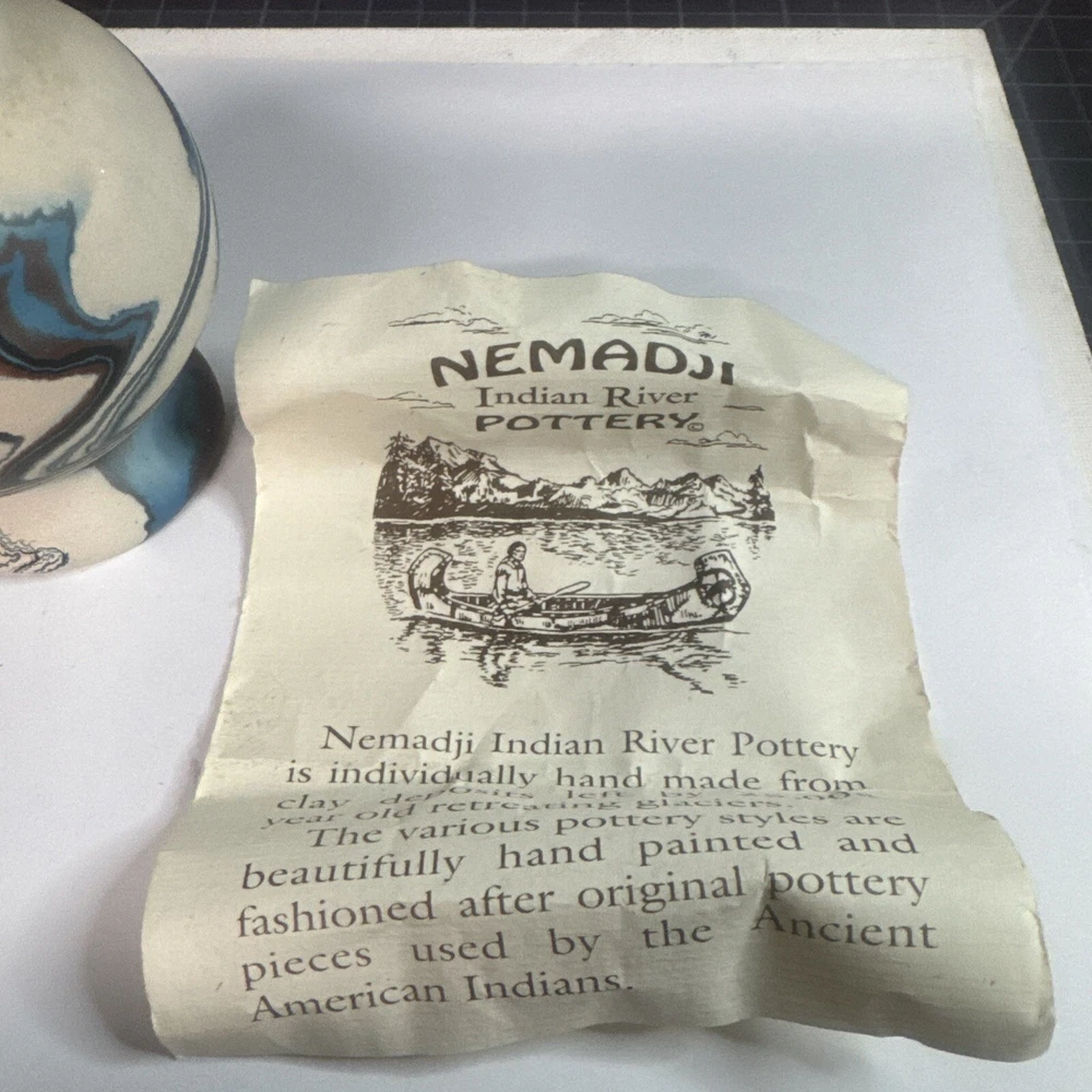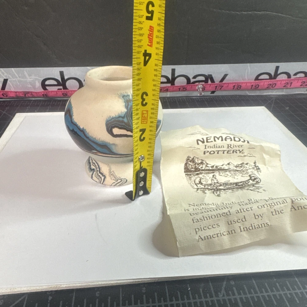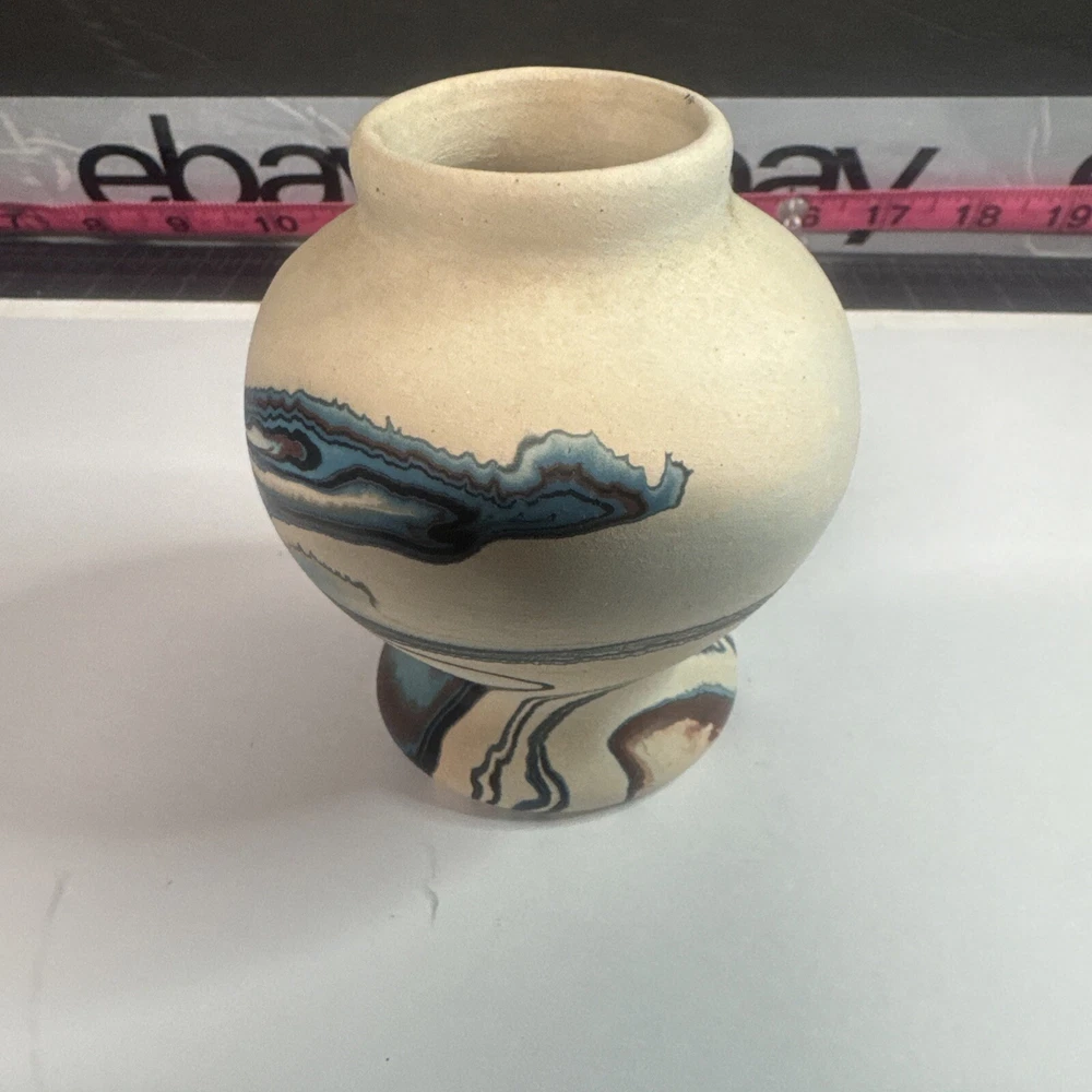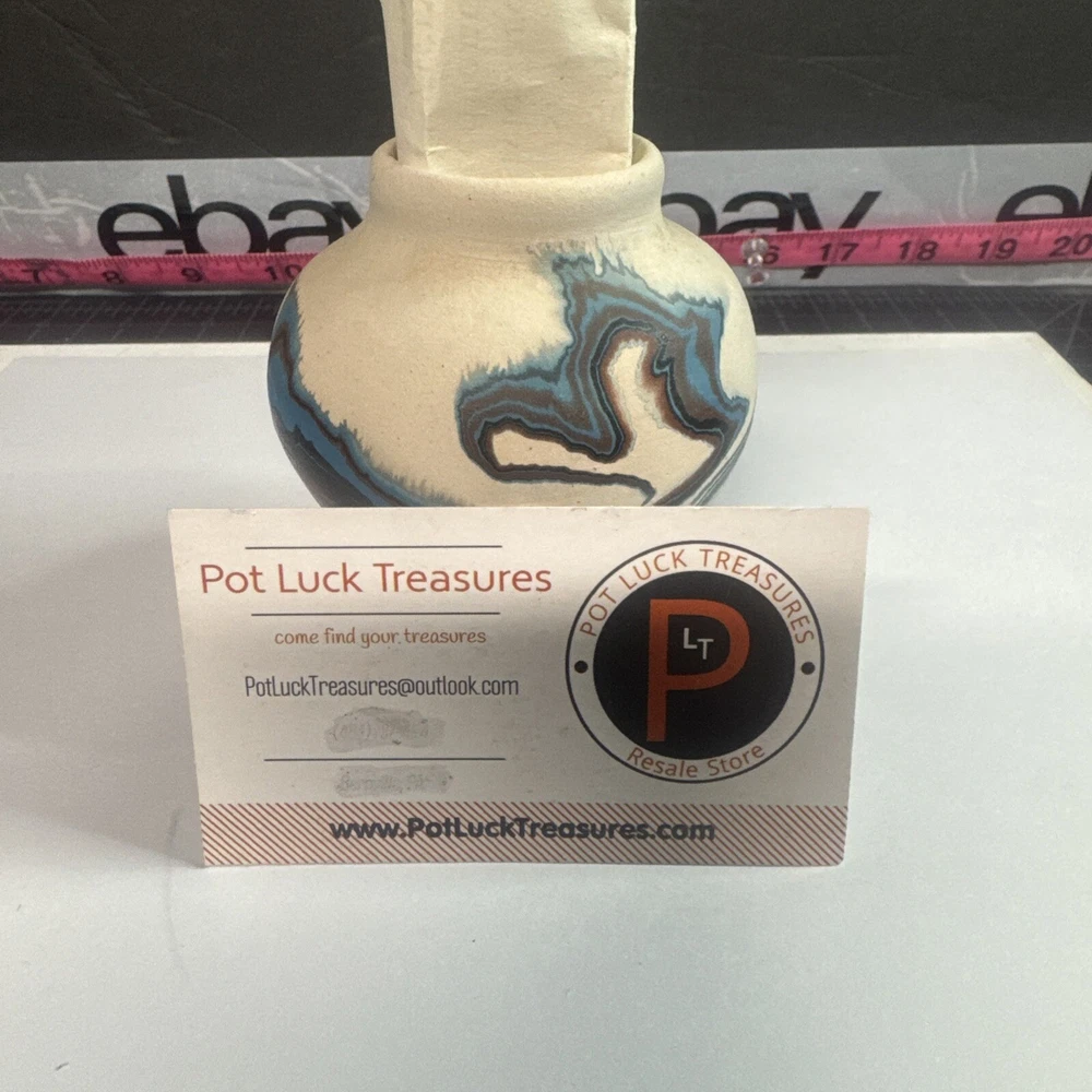This Vintage Nemadji Indian Pottery Vase is a stunning piece of handmade art pottery from the United States. The vase features swirling earth tone colors and an abstract art subject. The matte finish and folk & indigenous style make it a perfect addition to any home decor. The vase is an original piece and was produced using traditional pottery techniques. It is made of high-quality clay material and has a unique and colorful theme. This vintage vase is perfect for those who appreciate the beauty and artistry of North American pottery. Please see photos for condition and what’s included. Please feel free to contact us with any questions before purchasing.