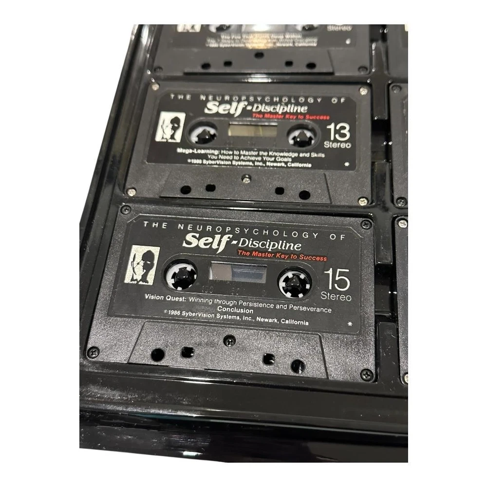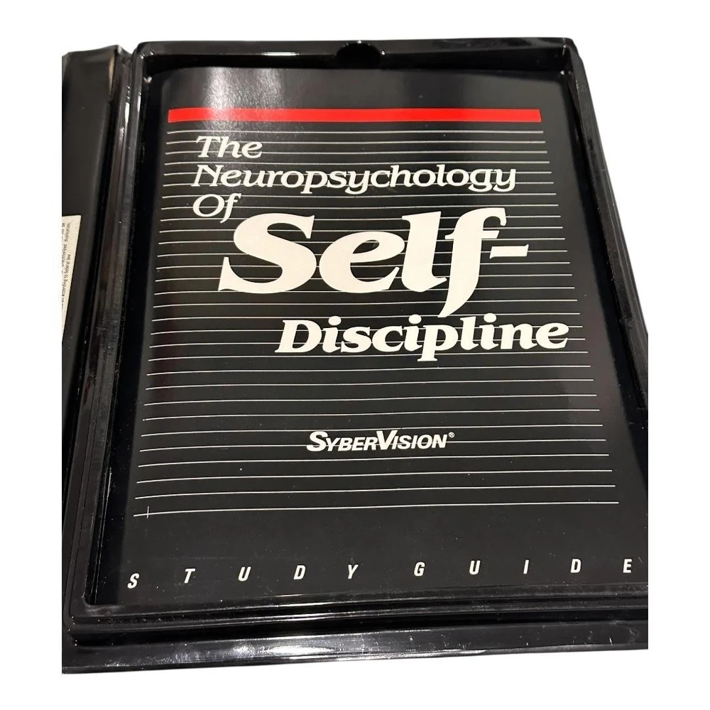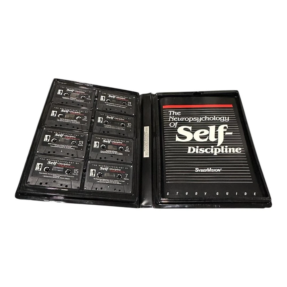 Brand: SyberVision Systems, Inc. Title: The Neuropsychology of Self-Discipline – The Master Key to Success. Format: Vintage self-improvement audio course with eight stereo cassette tapes and accompanying softcover study guide housed in a black vinyl clamshell case. Year: Copyright 1985–1986 SyberVision Systems, Inc.; printed in the United States of America (per case and booklet). Contents: Original SyberVision branded outer case, internal molded cassette tray, eight numbered cassettes, and matching study guide booklet titled "The Neuropsychology of Self-Discipline: The Master Key to Success." Topics covered on the cassettes include self-discipline as the key to achievement, characteristics of high achievers, building willpower, clarifying purpose, learning from mentors, transforming dreams into clear visions, step-by-step planning, time use, accelerated learning, and persistence for long-term success. Ideal for collectors of vintage motivational programs, self-help audio courses, or SyberVision training materials.
