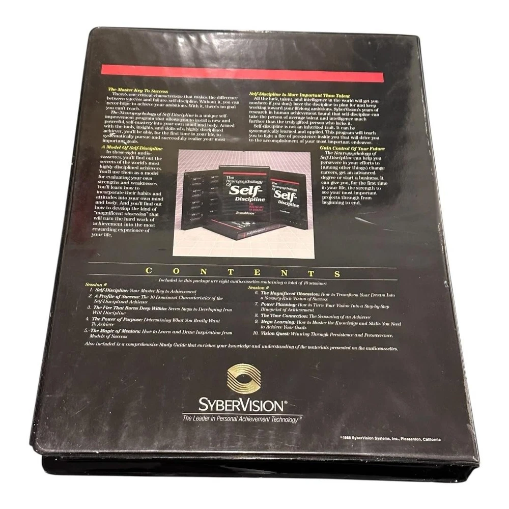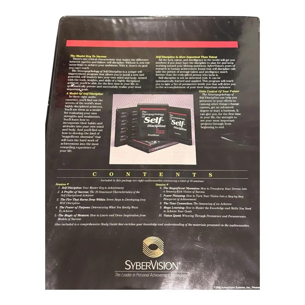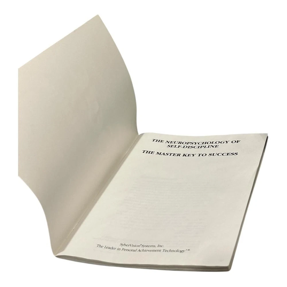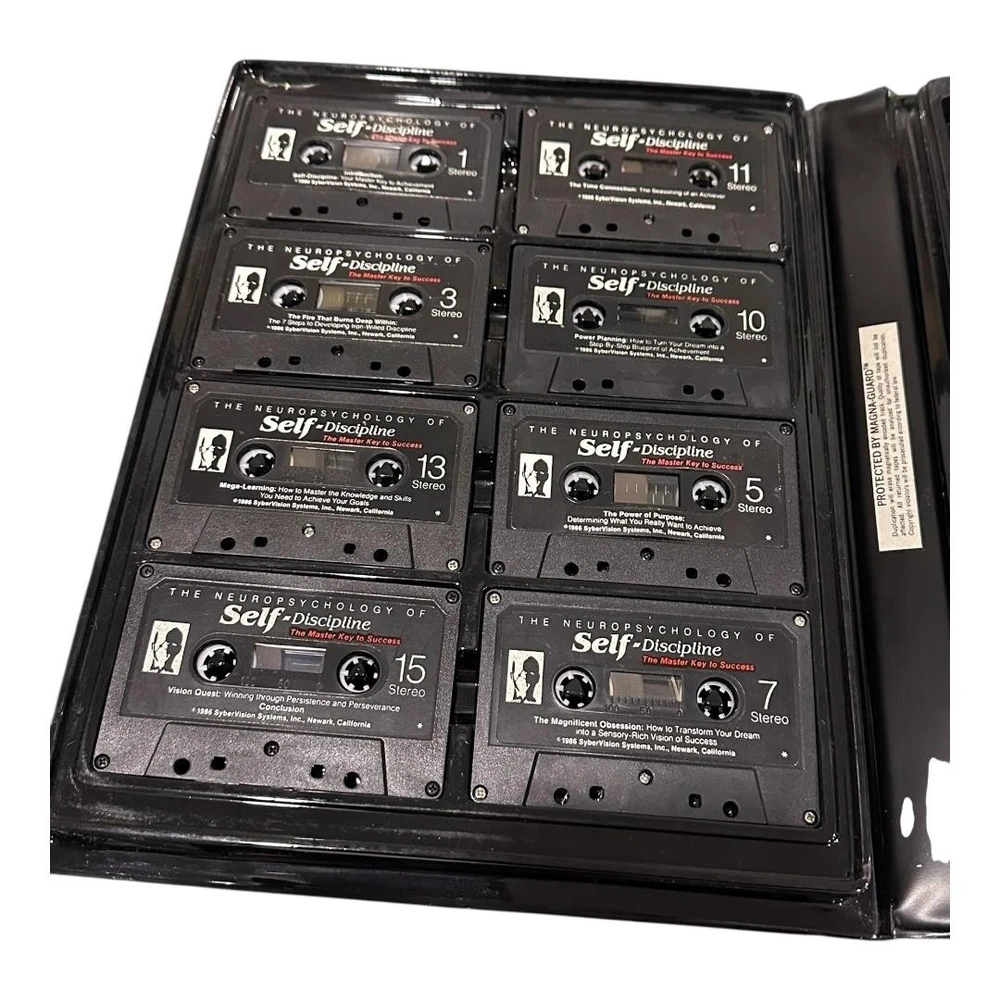 Brand: SyberVision Systems, Inc. Title: The Neuropsychology of Self-Discipline – The Master Key to Success. Format: Vintage self-improvement audio course with eight stereo cassette tapes and accompanying softcover study guide housed in a black vinyl clamshell case. Year: Copyright 1985–1986 SyberVision Systems, Inc.; printed in the United States of America (per case and booklet). Contents: Original SyberVision branded outer case, internal molded cassette tray, eight numbered cassettes, and matching study guide booklet titled "The Neuropsychology of Self-Discipline: The Master Key to Success." Topics covered on the cassettes include self-discipline as the key to achievement, characteristics of high achievers, building willpower, clarifying purpose, learning from mentors, transforming dreams into clear visions, step-by-step planning, time use, accelerated learning, and persistence for long-term success. Ideal for collectors of vintage motivational programs, self-help audio courses, or SyberVision training materials.
