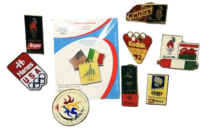 Lot Of 9 Olympic Sponsor Hat Or Lapel Pins Assorted Years Some Vtg Some New Good Some are new and still in the plastic package, some are missing the packaging (I took those in the packaging out to take photos, with the exception of the J & J), so I listed them all as being preowned, though some are not and the others may not be either. As you can see in the photos, there are several different sponsors, some of the pins are from the same sponsors but different styles and from different years and others are single pins from a single sponsor. The dates vary from 1992, 1994, 1996, 2006. Measurements are aprox 1” to 1 1/4”