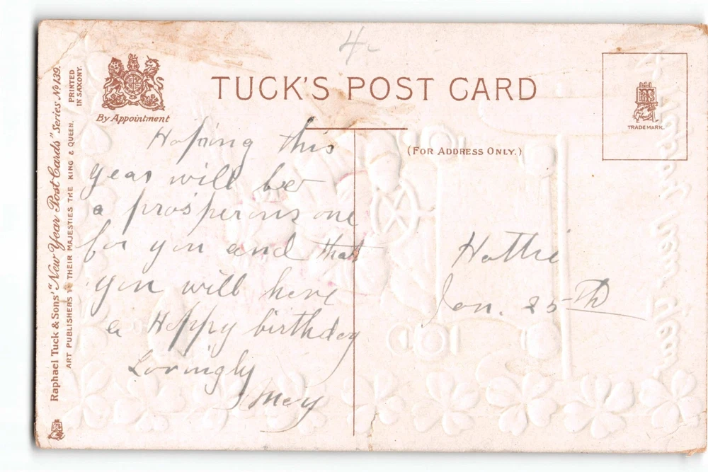 $1 flat for the first 4 cards, plus $0.33 for each additional postcard, unless specified otherwise. This vintage New Year postcard features a charming illustration of a woman driving an early automobile, framed by a border of four-leaf clovers and a hanging pig charm symbolizing luck. The postcard captures the spirit of adventure and good fortune, perfect for New Year's greetings. The design is a delightful example of early 20th-century artistry. Produced by Raphael Tuck & Sons, #139 known for their high-quality postcards, this card was postmarked in 1909 and is a wonderful piece for collectors of vintage ephemera. Condition: The postcard is in good condition, showing light wear on the edges and corners with some slight discoloration and a small crease in the top left corner. There is a handwritten message on the back, and the postcard is postmarked from 1909. No major tears are present, maintaining the integrity of the design. Thank you for your interest in our collection of vintage to antique postcards. Each postcard in our collection has its own unique history and character, reflecting its journey through time. Due to their age, it's natural for these postcards to show signs of wear such as edge wear, corner bumps, surface scratches, or slight discoloration. We believe these characteristics contribute to the authenticity and charm of each piece. We have done our best to capture the condition of each postcard through detailed photographs that form an integral part of this listing. We encourage you to examine these images closely to appreciate the true condition of the postcard. Should you have any questions about a specific postcard or require more detailed images, please do not hesitate to contact us. We are here to assist you and ensure that you can select the perfect piece for your collection with confidence.